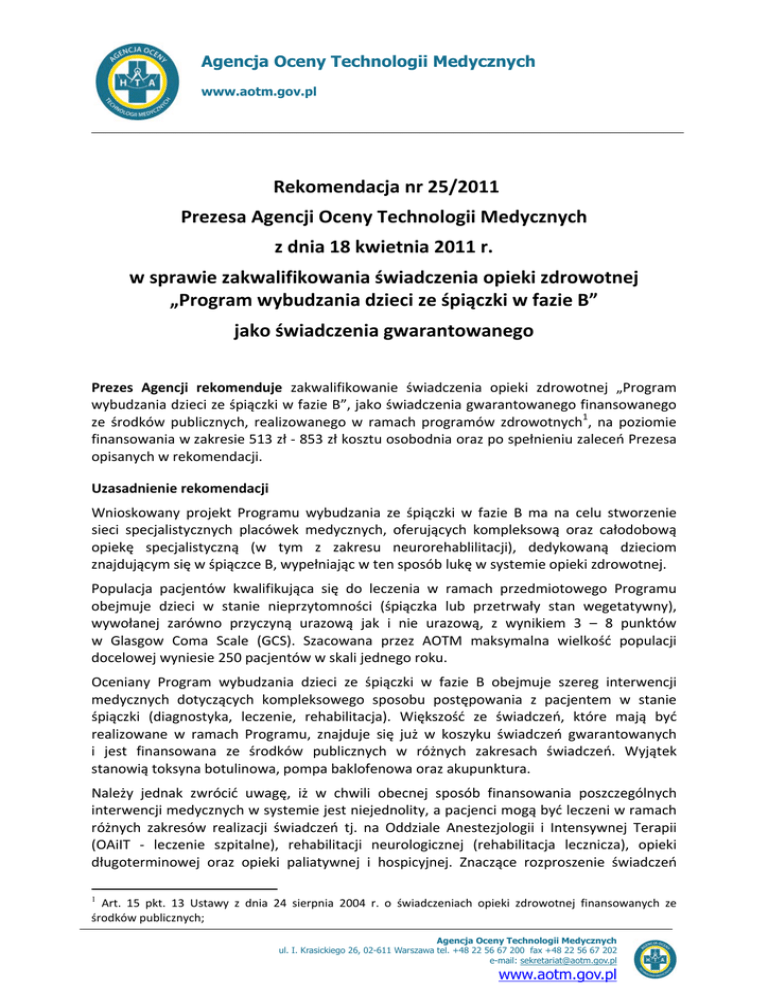 Agencja Oceny Technologii Medycznych www.aotm.gov.pl Rekomendacja nr 25/2011 Prezesa Agencji Oceny Technologii Medycznych z dnia 18 kwietnia 2011 r. w sprawie zakwalifikowania świadczenia opieki zdrowotnej „Program wybudzania dzieci ze śpiączki w fazie B” jako świadczenia gwarantowanego Prezes Agencji rekomenduje zakwalifikowanie świadczenia opieki zdrowotnej „Program wybudzania dzieci ze śpiączki w fazie B”, jako świadczenia gwarantowanego finansowanego ze środków publicznych, realizowanego w ramach programów zdrowotnych1, na poziomie finansowania w zakresie 513 zł ‐ 853 zł kosztu osobodnia oraz po spełnieniu zaleceń Prezesa opisanych w rekomendacji. Uzasadnienie rekomendacji Wnioskowany projekt Programu wybudzania ze śpiączki w fazie B ma na celu stworzenie sieci specjalistycznych placówek medycznych, oferujących kompleksową oraz całodobową opiekę specjalistyczną (w tym z zakresu neurorehablilitacji), dedykowaną dzieciom znajdującym się w śpiączce B, wypełniając w ten sposób lukę w systemie opieki zdrowotnej. Populacja pacjentów kwalifikująca się do leczenia w ramach przedmiotowego Programu obejmuje dzieci w stanie nieprzytomności (śpiączka lub przetrwały stan wegetatywny), wywołanej zarówno przyczyną urazową jak i nie urazową, z wynikiem 3 – 8 punktów w Glasgow Coma Scale (GCS). Szacowana przez AOTM maksymalna wielkość populacji docelowej wyniesie 250 pacjentów w skali jednego roku. Oceniany Program wybudzania dzieci ze śpiączki w fazie B obejmuje szereg interwencji medycznych dotyczących kompleksowego sposobu postępowania z pacjentem w stanie śpiączki (diagnostyka, leczenie, rehabilitacja). Większość ze świadczeń, które mają być realizowane w ramach Programu, znajduje się już w koszyku świadczeń gwarantowanych i jest finansowana ze środków publicznych w różnych zakresach świadczeń. Wyjątek stanowią toksyna botulinowa, pompa baklofenowa oraz akupunktura. Należy jednak zwrócić uwagę, iż w chwili obecnej sposób finansowania poszczególnych interwencji medycznych w systemie jest niejednolity, a pacjenci mogą być leczeni w ramach różnych zakresów realizacji świadczeń tj. na Oddziale Anestezjologii i Intensywnej Terapii (OAiIT ‐ leczenie szpitalne), rehabilitacji neurologicznej (rehabilitacja lecznicza), opieki długoterminowej oraz opieki paliatywnej i hospicyjnej. Znaczące rozproszenie świadczeń 1 Art. 15 pkt. 13 Ustawy z dnia 24 sierpnia 2004 r. o świadczeniach opieki zdrowotnej finansowanych ze środków publicznych; Agencja Oceny Technologii Medycznych ul. I. Krasickiego 26, 02-611 Warszawa tel. +48 22 56 67 200 fax +48 22 56 67 202 e-mail: [email protected] www.aotm.gov.pl Rekomendacja nr 25/2011 Prezesa AOTM z dnia 18 kwietnia 2011r. finansowanych w ocenianym wskazaniu stanowi duże ograniczenie dostępności leczenia dla dzieci w śpiączce. Jednocześnie Prezes Agencji podkreśla fakt, iż ze środków publicznych nie mogą być finansowane świadczenia udzielane z wykorzystaniem metod stosowanych w medycynie niekonwencjonalnej. Zalecenia Prezesa AOTM Kryteria kwalifikacji pacjentów do leczenia w ramach Programu, kryteria wyłączenia pacjentów z Programu oraz mierniki efektywności realizacji Programu nie zostały zróżnicowane ze względu na przyczynę wywołującą stan przedłużającej się nieprzytomności (rozumiany jako śpiączka lub przetrwały stan wegetatywny). Z przeglądu piśmiennictwa wynika, iż rokowania na temat stanu zdrowia pacjenta oraz szanse na wybudzenie są różne w zależności od przyczyny wystąpienia śpiączki. Kryterium kwalifikacji nie później niż 6 m‐cy od zdarzenia nie uwzględnia zróżnicowania w rokowaniu związanym z przyczyną wystąpienia śpiączki. Autorzy Programu nie rozgraniczają śpiączki pourazowej od tej spowodowanej inną przyczyną niż urazowa. W przypadku nieurazowej przyczyny wystąpienia śpiączki, przyjmuje się, iż po 3‐6 miesiącach od zdarzenia szanse na wybudzenie są już znikome. Wśród jednostek chorobowych stanowiących zamknięty katalog rozpoznać kwalifikujących do Programu, brakuje jednostki chorobowej „śpiączka niedookreślona” (R 40.2). W opinii Prezesa AOTM, pacjenci z tym rozpoznaniem również powinni podlegać kwalifikacji do Programu. Zdaniem Prezesa AOTM kryteria wyłączenia pacjentów z Programu powinny zostać precyzyjnie określone. Brak szczegółowo opisanych kryteriów wyłączenia może powodować nieuzasadnione „przetrzymywanie” pacjenta w Programie, co ostatecznie może ograniczać dostępność i wstrzymywać kwalifikację kolejnych pacjentów przebywających na listach oczekujących. Na podstawie odnalezionego w ramach analizy efektywności klinicznej przeglądu systematycznego oraz stanowisk ekspertów klinicznych, jako kryterium wyłączenia pacjentów z Programu, można przyjąć wynik na poziomie od 3 do 5 punktów w Glasgow Outcome Scale (GOS). W przedłożonym projekcie nie opisano kryteriów monitorowania skuteczności klinicznej realizowanego w ramach Programu leczenia. Nie wiadomo, w oparciu o jakie kryteria kliniczne dokonywana będzie ocena stanu zdrowia pacjenta oraz jaki wynik wskazywał będzie na poprawę kliniczną. Należy określić jak będzie oceniany postęp terapeutyczny oraz stopień odpowiedzi klinicznej na leczenie realizowane w ramach Programu, określić konkretne parametry, na podstawie których przeprowadzona zostanie ocena efektywności realizowanego Programu. Za zasadne wydaje się również wprowadzenie rejestru klinicznego pacjentów leczonych w ramach Programu. Ponadto w opinii Prezesa AOTM, istnieje konieczność precyzyjnego określenia kryteriów kwalifikacji do zastosowania toksyny botulinowej oraz pompy baklofenowej w leczeniu spastyczności u dzieci w śpiączce. W Programie brak jest informacji na temat dawkowania toksyny botulinowej (wielkość dawki, częstotliwość podawania, miejsc wkłucia). Zastosowanie toksyny botul