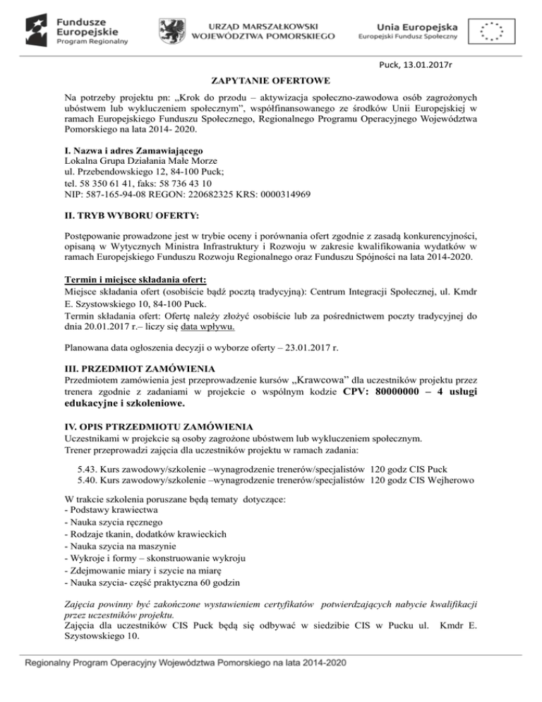 Puck, 13.01.2017r ZAPYTANIE OFERTOWE Na potrzeby projektu pn: „Krok do przodu – aktywizacja społeczno-zawodowa osób zagrożonych ubóstwem lub wykluczeniem społecznym”, współfinansowanego ze środków Unii Europejskiej w ramach Europejskiego Funduszu Społecznego, Regionalnego Programu Operacyjnego Województwa Pomorskiego na lata 2014- 2020. I. Nazwa i adres Zamawiającego Lokalna Grupa Działania Małe Morze ul. Przebendowskiego 12, 84-100 Puck; tel. 58 350 61 41, faks: 58 736 43 10 NIP: 587-165-94-08 REGON: 220682325 KRS: 0000314969 II. TRYB WYBORU OFERTY: Postępowanie prowadzone jest w trybie oceny i porównania ofert zgodnie z zasadą konkurencyjności, opisaną w Wytycznych Ministra Infrastruktury i Rozwoju w zakresie kwalifikowania wydatków w ramach Europejskiego Funduszu Rozwoju Regionalnego oraz Funduszu Spójności na lata 2014-2020. Termin i miejsce składania ofert: Miejsce składania ofert (osobiście bądź pocztą tradycyjną): Centrum Integracji Społecznej, ul. Kmdr E. Szystowskiego 10, 84-100 Puck. Termin składania ofert: Ofertę należy złożyć osobiście lub za pośrednictwem poczty tradycyjnej do dnia 20.01.2017 r.– liczy się data wpływu. Planowana data ogłoszenia decyzji o wyborze oferty – 23.01.2017 r. III. PRZEDMIOT ZAMÓWIENIA Przedmiotem zamówienia jest przeprowadzenie kursów „Krawcowa” dla uczestników projektu przez trenera zgodnie z zadaniami w projekcie o wspólnym kodzie CPV: 80000000 – 4 usługi edukacyjne i szkoleniowe. IV. OPIS PTRZEDMIOTU ZAMÓWIENIA Uczestnikami w projekcie są osoby zagrożone ubóstwem lub wykluczeniem społecznym. Trener przeprowadzi zajęcia dla uczestników projektu w ramach zadania: 5.43. Kurs zawodowy/szkolenie –wynagrodzenie trenerów/specjalistów 120 godz CIS Puck 5.40. Kurs zawodowy/szkolenie –wynagrodzenie trenerów/specjalistów 120 godz CIS Wejherowo W trakcie szkolenia poruszane będą tematy dotyczące: - Podstawy krawiectwa - Nauka szycia ręcznego - Rodzaje tkanin, dodatków krawieckich - Nauka szycia na maszynie - Wykroje i formy – skonstruowanie wykroju - Zdejmowanie miary i szycie na miarę - Nauka szycia- część praktyczna 60 godzin Zajęcia powinny być zakończone wystawieniem certyfikatów potwierdzających nabycie kwalifikacji przez uczestników projektu. Zajęcia dla uczestników CIS Puck będą się odbywać w siedzibie CIS w Pucku ul. Kmdr E. Szystowskiego 10. Zajęcia dla uczestników CIS Wejherowo odbywać się będą w siedzibie CIS w Wejherowie ul. Pucka11 Termin realizacji zadania od 1 lutego 2017r. do 28 lutego 2017, według opracowywanego na bieżąco harmonogramu. V. WARUNKI UDZIAŁU W POSTEPOWANIU WRAZ Z OPISEM DOKONYWANIA OCENY ICH SPEŁNIANIA O udzielenie zamówienia mogą ubiegać się Wykonawcy, którzy posiadają niezbędną wiedzę i doświadczenie do wykonania zamówienia oraz posiadają konieczne do wykonania zamówienia wykształcenie i doświadczenie. Doświadczenie w zakresie dotychczasowego prowadzenia zajęć o tematyce „Krawcowa” oraz doświadczenie pracy jako krawcowa należy zamieścić w załączniku nr 4 do niniejszego zapytania. Niezbędne warunki ubiegania się o wykonanie zamówienia w ramach niniejszego zapytania ofertowego: 1. Posiadanie co najmniej 12-miesięcznego doświadczenia pracy na stanowisku krawcowa oraz ukończone Technikum Odzieżowe lub podobne (spełnienie wymagań poprzez załączenie kopii dokumentów potwierdzających doświadczenie, kopii dyplomu ukończenia szkoły), 2. Umiejętności trenerskie, dydaktyczne zdobyte w toku działalności zawodowej/ szkoleniowej (CV, referencje, kopie zaświadczeń). Ocena spełniania w/w warunków zostanie dokonana na podstawie przedłożonych przez Wykonawców dokumentów, o których mowa w pkt. V, według formuły „spełnia” / „nie spełnia”. Zamawiający wykluczy z postępowania Wykonawców, którzy nie spełniają warunków udziału w postępowaniu. VI. INFORMACJE NA TEMAT ZAKAZU POWIĄZAŃ OSOBOWYCH LUB KAPITAŁOWYCH Z udziału w postępowaniu wyłączone są osoby, które powiązane są z Zamawiającym osobowo lub kapitałowo. Przez powiązania kapitałowe lub osobowe rozumie się wzajemne powiązania między Zamawiającym lub osobami upoważnionymi do zaciągania zobowiązań w imieniu Zamawiającego lub osobami wykonującymi w imieniu Zamawiającego czynności związane z przygotowaniem i przeprowadzeniem procedury wyboru Wykonawcy a Wykonawcą, polegające w szczególności na: a. uczestniczeniu w spółce jako wspólnik spółki cywilnej lub spółki osobowej; b. posiadaniu co najmniej 10% udziałów lub akcji; c. pełnieniu funkcji członka organu nadzorczego lub zarządzającego, prokurenta lub pełnomocnika; d. pozostawaniu w związku małżeńskim, w stosunku pokrewieństwa lub powinowactwa w linii prostej, pokrewieństwa drugiego stopnia lub powinowactwa drugiego stopnia w linii bocznej lub w stosunku przysposobienia, opieki lub kurateli; W związku z powyższym Wykonawca jest zobowiązany do wypełnienia i popisania stosownych oświadczeń, stanowiących załączniki do formularza ofertowego, w tym załącznika nr 2. Oferenci, którzy nie podpiszą ww. oświadczenia zostaną odrzuceni. VII. INFORMACJE O MOŻLIWOŚCI SKŁADANIA OFERT CZĘŚCIOWYCH Zamawiający nie dopuszcza możliwość składania ofert częściowych. VIII. OPIS SPOSOBU PRZYGOTOWANIA I ZŁOŻENIA OFERTY 1) Oferta winna być sporządzona na piśmie, w języku polskim, w formie zapewniającej pełną czytelność jej treści. 2) Oferta powinna zawierać dokumenty wymienione w pkt. V niniejszego zapytania OFERTA MUSI ZAWIERAĆ NASTEPUJĄCE ELEMENTY: 1. Załącznik nr 1 – Formularz ofertowy, 2. Załącznik nr 2 – Oświadczenie o braku powiązań kapitałowych i osobowych z Zamawiającym, 3. Załącznik nr 3 – Oświadczenie przetwarzanie danych osobowych, 4. Załącznik nr 4 – Doświadczenie w zakresie oferowanych usług szkoleniowych w zakresie „Krawcowa”. Wymagane jest złożenie wra