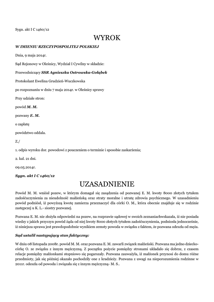 Sygn. akt I C 1460/12 WYROK W IMIENIU RZECZYPOSPOLITEJ POLSKIEJ Dnia, 9 maja 2014r. Sąd Rejonowy w Oleśnicy, Wydział I Cywilny w składzie: Przewodniczący SSR Agnieszka Ostrowska-Gołąbek Protokolant Ewelina Grudzień-Wuczkowska po rozpoznaniu w dniu 7 maja 2014r. w Oleśnicy sprawy Przy udziale stron: powód M. M. pozwany E. M. o zapłatę powództwo oddala. Z./ 1. odpis wyroku dor. powodowi z pouczeniem o terminie i sposobie zaskarżenia; 2. kal. 21 dni. 09.05.2014r. Sygn. akt I C 1460/12 UZASADNIENIE Powód M. M. wniósł pozew, w którym domagał się zasądzenia od pozwanej E. M. kwoty 8000 złotych tytułem zadośćuczynienia za nieudolność małżeńską oraz straty moralne i utratę zdrowia psychicznego. W uzasadnieniu powód podniósł, iż powyższą kwotę zamierza przeznaczyć dla córki O. M., która obecnie znajduje się w rodzinie zastępczej u K. L.- siostry pozwanej. Pozwana E. M. nie złożyła odpowiedzi na pozew, na rozprawie sądowej w swoich zeznaniachwskazała, iż nie posiada wiedzy z jakich przyczyn powód żąda od niej kwoty 8000 złotych tytułem zadośćuczynienia, podniosła jednocześnie, iż niniejsza sprawa jest prawdopodobnie wynikiem zemsty powoda w związku z faktem, że pozwana odeszła od męża. Sąd ustalił następujący stan faktyczny: W dniu 08 listopada 2008r. powód M. M. oraz pozwana E. M. zawarli związek małżeński. Pozwana ma jedno dzieckocórkę O. ze związku z innym mężczyzną. Z początku pożycie pomiędzy stronami układało się dobrze, z czasem relacje pomiędzy małżonkami stopniowo się pogarszały. Pozwana zauważyła, iż małżonek przynosi do domu różne przedmioty, jak się później okazało pochodziły one z kradzieży. Pozwana z uwagi na nieporozumienia rodzinne w 2011r. odeszła od powoda i związała się z innym mężczyzną- M. S.. Z uwagi na nadużywanie alkoholu przez pozwaną jej córka O. została umieszczona w rodzinie zastępczej u siostry pozwanej. Dowód: zeznania pozwanej E. M. k-34. Przed Sądem Rejonowym w Oleśnicy w 2012r. z wniosku powoda M. M. toczyła się sprawa o pozbawienie władzy rodzicielskiej E. M. nad córką O.. Postanowieniem z dnia 19 października 2012r. w sprawie sygn. akt III RNsm 297/12 Sąd oddalił wniosek. W uzasadnieniu swojej decyzji Sąd wskazał między innymi, iż obecnie wnioskodawca odbywa karę pozbawienia wolności w zakładzie karnym, a jej koniec przypada na 2015r., nadto od 3 lat małoletnia nie ma bezpośredniego kontaktu z wnioskodawcą. Dodatkowo Sąd zauważył, iż uczestniczka postępowania ( pozwana) pozostaje w abstynencji, co weekend odwiedza córkę, ma z nią bardzo dobry kontakt, matka i córka są związane ze sobą emocjonalnie. Nadto Sąd zauważył, iż wskazywanie przez wnioskodawcę, iż uczestniczka postępowania ( pozwana) nadużywa alkoholu, której to okoliczności nie potwierdził zabrany w sprawie materiał dowodowy, uznać należy za zarzut chybiony oraz za nieudolną próbę postawienia uczestniczki postępowania w złym świetle przed Sądem i doprowadzenia za wszelką cenę do pozbawienia jej władzy rodzicielskiej nad córką. Dowód: postanowienie z dnia 19 października 2012r. wraz z uzasadnieniem w aktach sprawy III RNsm 297/12 k-62. Pozwem z dnia 08 czerwca 2012r. pozwany domagał się zasądzenia od pozwanego M. S. kwoty 8000 złotych tytułem zadośćuczynienia za celowe i świadome doprowadzenia do rozbicia związku małżeńskiego z E. M. oraz narażenie w ten sposób powoda na straty moralne , finansowe oraz utratę zdrowia psychicznego. Wyrokiem z dnia 29 maja 2013r. w sprawie sygn. akt I C 91/13 Sąd Rejonowy w Dzierżoniowie oddalił powództwo. Dowód: wyrok z dnia 29 maja 2013r. w aktach sprawy sygn. akt I C 91/13 k-103. Sąd zważył co następuje: W niniejszej sprawie powód domagał się zasądzenia od pozwanej kwoty 8000 złotych za ,,nieudolność małżeńską”, straty moralne oraz utratę zdrowia psychicznego. W swoim pozwie powód nie wyjaśnił jakie straty moralne poniósł w związku zachowaniem E. M. i w czym przejawia się utrata przez niego zdrowia psychicznego. W swoich zeznaniach złożonych przed Sądem Rejonowym w Środzie Śląskiej powód wyjaśnił, iż pozwana jest osobą nieporadną życiowo, która otrzymywane od powoda pieniądze przeznaczała na alkohol oraz doprowadziła do zadłużenia mieszkania. Powyższa sytuacja, jak wskazywał powód, doprowadziła do tego, że utracił on zdrowie psychiczne oraz wykryto u niego nadciśnienie tętnicze. Z zeznaniach E. M. wynika jednakże, iż przyczyną dla której odeszła od powoda-swojego męża, było jego zachowanie, zaś niniejsza sprawa jest wynikiem zemsty na pozwanej z uwagi na fakt, iż związała się ona z innym mężczyzną. Sąd zauważa, iż w przedmiotowym postępowaniu powód nie wykazał, iż na skutek działania pozwanej rzeczywiście doznał on naruszenia zdrowia psychicznego, bowiem na powyższą okoliczność nie zostały przedstawione żadne dokumenty potwierdzające stanowisko powoda. Na rozprawie sądowej pozwana wyjaśniła, iż nie rozumie z jakich przyczyn powód żąda od niej kwoty 8000 złotych za ,,nieudolność małżeńską”. Sam bowiem fakt, że strony nie są już razem, niezależnie od przyczyn z jakich doszło do rozstania, nie skutkuje automatycznie koniecznością uznania, iż strona nie mogąca pogodzić się z rozstaniem z partnerem ma ustawowe prawo do żądania z tego tytułu zadośćuczynienia. W swoich zeznaniach powód wskazywał także , iż pozwana jest osobą niezaradną życiowo, uzależnioną od alkoholu. Powyższeokoliczności nie stanowią jednak ustawowych przesłanej do uznania,iż z tego tytułu powodowi została wyrządzoną krzywda stanowiąca podstawę do żądania zadośćuczynienia o jakim mowa w art.445 k.c. Sąd jednocześnie zauważa, iż podobnie okoliczności jak te, które w swoich zeznaniach przytoczył powód, legły u podstaw jego wniosku o pozbawienie władzy rodzicielskiej poz