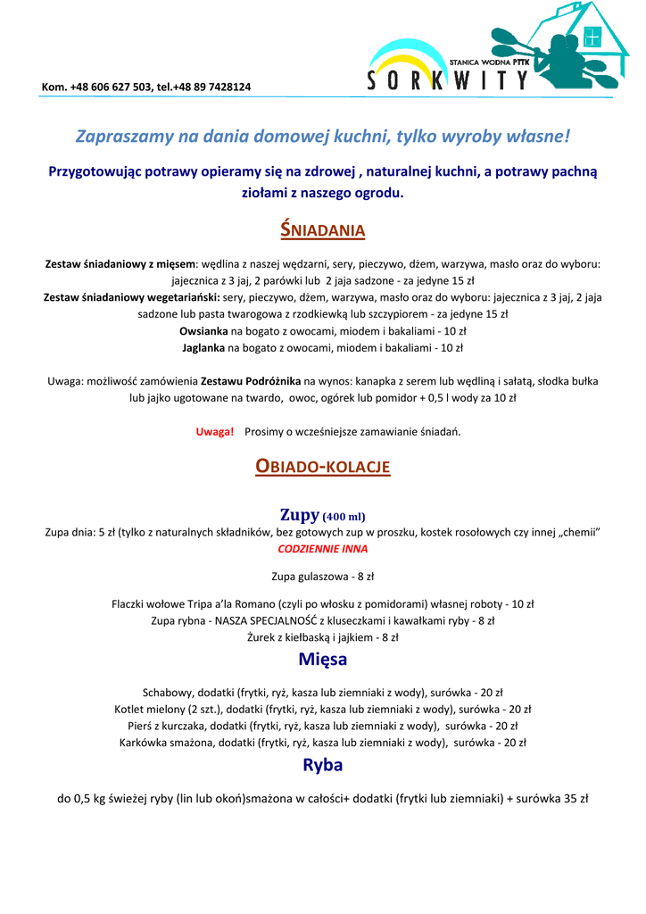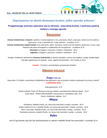 Kom. +48 606 627 503, tel.+48 89 7428124 Zapraszamy na dania domowej kuchni, tylko wyroby własne! Przygotowując potrawy opieramy się na zdrowej , naturalnej kuchni, a potrawy pachną ziołami z naszego ogrodu. ŚNIADANIA Zestaw śniadaniowy z mięsem: wędlina z naszej wędzarni, sery, pieczywo, dżem, warzywa, masło oraz do wyboru: jajecznica z 3 jaj, 2 parówki lub 2 jaja sadzone - za jedyne 15 zł Zestaw śniadaniowy wegetariański: sery, pieczywo, dżem, warzywa, masło oraz do wyboru: jajecznica z 3 jaj, 2 jaja sadzone lub pasta twarogowa z rzodkiewką lub szczypiorem - za jedyne 15 zł Owsianka na bogato z owocami, miodem i bakaliami - 10 zł Jaglanka na bogato z owocami, miodem i bakaliami - 10 zł Uwaga: możliwość zamówienia Zestawu Podróżnika na wynos: kanapka z serem lub wędliną i sałatą, słodka bułka lub jajko ugotowane na twardo, owoc, ogórek lub pomidor + 0,5 l wody za 10 zł Uwaga! Prosimy o wcześniejsze zamawianie śniadań. OBIADO-KOLACJE Zupy (400 ml) Zupa dnia: 5 zł (tylko z naturalnych składników, bez gotowych zup w proszku, kostek rosołowych czy innej „chemii” CODZIENNIE INNA Zupa gulaszowa - 8 zł Flaczki wołowe Tripa a’la Romano (czyli po włosku z pomidorami) własnej roboty - 10 zł Zupa rybna - NASZA SPECJALNOŚĆ z kluseczkami i kawałkami ryby - 8 zł Żurek z kiełbaską i jajkiem - 8 zł Mięsa Schabowy, dodatki (frytki, ryż, kasza lub ziemniaki z wody), surówka - 20 zł Kotlet mielony (2 szt.), dodatki (frytki, ryż, kasza lub ziemniaki z wody), surówka - 20 zł Pierś z kurczaka, dodatki (frytki, ryż, kasza lub ziemniaki z wody), surówka - 20 zł Karkówka smażona, dodatki (frytki, ryż, kasza lub ziemniaki z wody), surówka - 20 zł Ryba do 0,5 kg świeżej ryby (lin lub okoń)smażona w całości+ dodatki (frytki lub ziemniaki) + surówka 35 zł Kom. +48 606 627 503, tel.+48 89 7428124 Pierogi za 15 zł (8 starannie zrobionych sztuk) z: • Kapustą i grzybami • Pieczarkami i serem żółtym • Twarogiem na słodko • Kaszą jaglaną, marchewką i cebulą (wegetariańskie) • Ruskie (ziemniaki i twaróg) • Ukraińskie (ziemniaki, kapusta,boczek) • Kurczakiem i kasza gryczaną • Mięsem wieprzowym NASZA SPECJALNOŚĆ: PIEROGI EMPANADAS, czyli pierogi z wołowiną, warzywami i serem, podawane z sosem czosnkowym - 5 sztuk za 12 zł MIX pierogów: 8 sztuk na słodko lub na słono - 15 zł Kartacze Kartacze z mięsem (2 duże sztuki z surówką) - 15 zł Dania wegetariańskie Kotlety sojowe( 2 szt.) dodatki (frytki, ziemniaki, kasza, ryż) + surówka Ser camembert w panierce (frytki, ziemniaki, kasza, ryż) + surówka Naleśnik (10 zł, duża porcja) • z twarogiem i owocami + słodki sos (toffi lub czekoladowy) • z parówką i serem ( 2 sztuki) SAŁATKI Sałatka grecka - 10 zł Sałatka dnia - 10 zł DESER Ciasto z bitą śmietaną - 10 zł , Ciasto dnia – 5 zł Deser FIT: granola, jogurt naturalny i owoce - 10 zł NAPOJE Kawa parzona ( z mułem) - 4 zł Kawa rozpuszczalna – 4 zł Kawa z ekspresu – 5 zł Nowość: Herbata ze świeżej mięty – 3 zł, Herbata Yoga tea ( z przyprawami i mlekiem)- 4 zł Herbata Dilmah ( różne smaki) 4 zł Grzane piwo z miodem i przyprawami – 8 zł