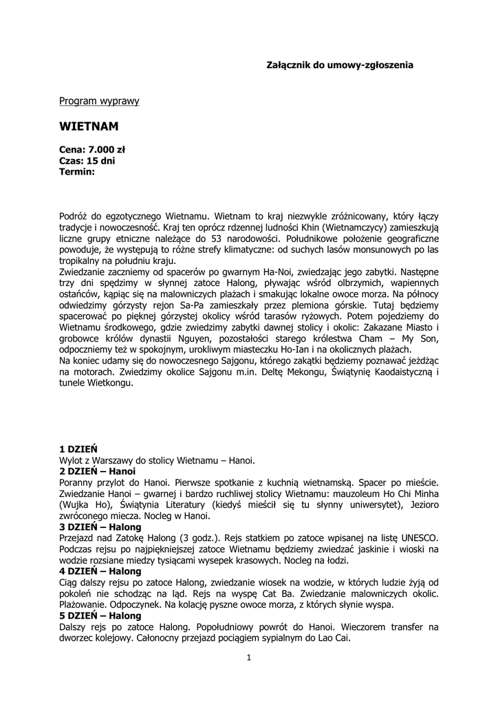 Załącznik do umowy-zgłoszenia Program wyprawy WIETNAM Cena: 7.000 zł Czas: 15 dni Termin: Podróż do egzotycznego Wietnamu. Wietnam to kraj niezwykle zróżnicowany, który łączy tradycje i nowoczesność. Kraj ten oprócz rdzennej ludności Khin (Wietnamczycy) zamieszkują liczne grupy etniczne należące do 53 narodowości. Południkowe położenie geograficzne powoduje, że występują to różne strefy klimatyczne: od suchych lasów monsunowych po las tropikalny na południu kraju. Zwiedzanie zaczniemy od spacerów po gwarnym Ha-Noi, zwiedzając jego zabytki. Następne trzy dni spędzimy w słynnej zatoce Halong, pływając wśród olbrzymich, wapiennych ostańców, kąpiąc się na malowniczych plażach i smakując lokalne owoce morza. Na północy odwiedzimy górzysty rejon Sa-Pa zamieszkały przez plemiona górskie. Tutaj będziemy spacerować po pięknej górzystej okolicy wśród tarasów ryżowych. Potem pojedziemy do Wietnamu środkowego, gdzie zwiedzimy zabytki dawnej stolicy i okolic: Zakazane Miasto i grobowce królów dynastii Nguyen, pozostałości starego królestwa Cham – My Son, odpoczniemy też w spokojnym, urokliwym miasteczku Ho-Ian i na okolicznych plażach. Na koniec udamy się do nowoczesnego Sajgonu, którego zakątki będziemy poznawać jeżdżąc na motorach. Zwiedzimy okolice Sajgonu m.in. Deltę Mekongu, Świątynię Kaodaistyczną i tunele Wietkongu. 1 DZIEŃ Wylot z Warszawy do stolicy Wietnamu – Hanoi. 2 DZIEŃ – Hanoi Poranny przylot do Hanoi. Pierwsze spotkanie z kuchnią wietnamską. Spacer po mieście. Zwiedzanie Hanoi – gwarnej i bardzo ruchliwej stolicy Wietnamu: mauzoleum Ho Chi Minha (Wujka Ho), Świątynia Literatury (kiedyś mieścił się tu słynny uniwersytet), Jezioro zwróconego miecza. Nocleg w Hanoi. 3 DZIEŃ – Halong Przejazd nad Zatokę Halong (3 godz.). Rejs statkiem po zatoce wpisanej na listę UNESCO. Podczas rejsu po najpiękniejszej zatoce Wietnamu będziemy zwiedzać jaskinie i wioski na wodzie rozsiane miedzy tysiącami wysepek krasowych. Nocleg na łodzi. 4 DZIEŃ – Halong Ciąg dalszy rejsu po zatoce Halong, zwiedzanie wiosek na wodzie, w których ludzie żyją od pokoleń nie schodząc na ląd. Rejs na wyspę Cat Ba. Zwiedzanie malowniczych okolic. Plażowanie. Odpoczynek. Na kolację pyszne owoce morza, z których słynie wyspa. 5 DZIEŃ – Halong Dalszy rejs po zatoce Halong. Popołudniowy powrót do Hanoi. Wieczorem transfer na dworzec kolejowy. Całonocny przejazd pociągiem sypialnym do Lao Cai. 1 6 DZIEŃ – Lao Cai Przyjazd do Lao Cai wczesnym rankiem (około godziny 6 rano). Przejazd w góry do rejonu Sapa. Sapa to kolorowe góry o łagodnym klimacie, zamieszkałe przez wiele mniejszości etnicznych. Trekking do wioski Tavan zamieszkałej przez plemiona Rai. Nocleg w Sapa. 7 DZIEŃ – Sapa Zwiedzanie Sapa i okolic: most Cau May, Srebrne Wodospady, wizyta na targu, gdzie sprzedają lokalni mieszkańcy w barwnych strojach. Trekking do wioski Ta Phin, którą zamieszkują plemiona H’Mong oraz Dao. Nocleg w Sapa. 8 DZIEŃ – Sapa Spacer po malowniczych górach. Zobaczymy najwyższą górę Wietnamu – Phanasipan, położoną w pd.zach. części regionu Sapa. Popołudniowy przejazd do Lao Cai. Transfer na pociąg do Hanoi. Całonocny przejazd. 9 DZIEŃ – Hanoi, Hue Poranny przyjazd do Hanoi. Wylot do Danang. Przejazd do starej stolicy Wietnamu Hue. Zwiedzanie Hue: zakazane miasto (ok. 3 $), grobowce dynastii Nguyen (ok. 5 $), pagoda Thien Mu. Zakwaterowanie i nocleg w Hue. 10 DZIEŃ – Hoi An Przejazd do Hoi An. Rano zwiedzanie Hoi An, wypożyczamy rowery lub riksze i zwiedzamy spokojne, kolorowe Stare Miasto (wpisane na listę UNESCO). Po południu: przejazd nad morze południowo-chińskie (3 km), kąpiel i plażowanie. Na kolację pyszne owoce morza. Nocleg w Hoi An. 11 DZIEŃ – Hoi An Wycieczka do ruin Czamow w My Son (ok. 10 $). Plażowanie, odpoczynek, zakupy. Na kolację smaczne ryby i „białe róże”. Nocleg w Hoi An. 12 DZIEŃ – Sajgon Wylot do Sajgonu. Zakwaterowanie. Zwiedzanie miasta: Chińska Świątynia Jadeitowego Cesarza. Dla chętnych wieczorne wyjście do „wodnego teatru”. Nocleg w Sajgonie. 13 DZIEŃ – Sajgon Wycieczka pod granicę kambodżańską do głównej świątyni religii kaodaistycznej. Kaodaizm powstał w latach 30-tych XX w., łączy w sobie elementy wielu religii: chrześcijaństwa, buddyzmu, konfucjanizmu. Kościół ma swojego papieża i całą hierarchię. Weźmiemy udział w najważniejszym nabożeństwie, które gromadzi wielu ubranych w kolorowe stroje wyznawców. Odwiedzimy również tunele Vietkongu w Cu Chi – pozostałości po wojnie wietnamskiej. Do dzisiaj pozostało prawie 200 km tuneli. Dla chętnych możliwość przejścia fragmentem tunelu oraz strzelanie z karabinu (wycieczka ok. 10 $). Nocleg w Sajgonie. 14 DZIEŃ – Sajgon Relaksująca wycieczka do delty Mekongu (ok. 10$). Pływamy łodziami, czółnami, odwiedzamy plantacje owoców i fabrykę cukierków kokosowych. Spacer po centrum Sajgonu: katedra, Opera. Nocleg w Sajgonie. 15 DZIEŃ Powrót do Polski z przesiadką w jednym z europejskich portów lotniczych. Cena zawiera: przeloty Warszawa - Hanoi, Hanoi (Saigon) - Warszawa, Danang - Saigon, Ha Noi - Danang, rejs po Zatoce Halong z wyżywieniem i noclegiem na łodzi, ubezpieczenie KL i NNW, noclegi, transport: pociągi, autobusy, taksówki na trasie wycieczki (poza fakultatywnymi), wizę wietnamską, koszty organizacyjne w Polsce i na miejscu wyprawy, opiekę pilota. Cena nie zawiera: kosztów wyżywienia (ok. 10 $ dziennie), zajęć fakultatywnych (ceny podane w programie wyprawy), biletów wstępu (70-80 $), napiwków. 2 Szczegóły dotyczące wyprawy: w celu wyrobienia wizy wietnamskiej należy dostarczyć do biura 30 dni przed terminem wyjazdu paszport ważny min. 6 miesięcy od daty wjazdu do kraju z 2 wolnymi stronami oraz 2 aktualne zdjęcie paszportowe dodatkowe koszty (wiza, bilety wstępu, zajęcia fakultatywne, napiwki