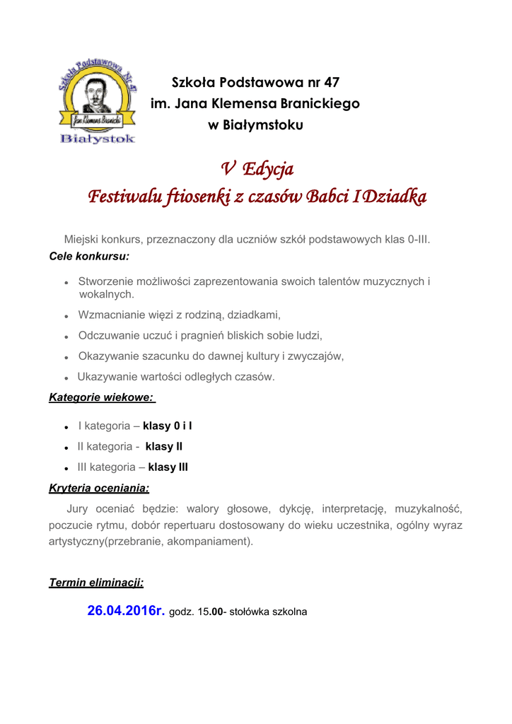 Szkoła Podstawowa nr 47 im. Jana Klemensa Branickiego w Białymstoku V Edycja Festiwalu ftiosenki z czasów Babci I Dziadka Miejski konkurs, przeznaczony dla uczniów szkół podstawowych klas 0-III. Cele konkursu: Stworzenie możliwości zaprezentowania swoich talentów muzycznych i wokalnych. Wzmacnianie więzi z rodziną, dziadkami, Odczuwanie uczuć i pragnień bliskich sobie ludzi, Okazywanie szacunku do dawnej kultury i zwyczajów, Ukazywanie wartości odległych czasów. Kategorie wiekowe: I kategoria – klasy 0 i I II kategoria - klasy II III kategoria – klasy III Kryteria oceniania: Jury oceniać będzie: walory głosowe, dykcję, interpretację, muzykalność, poczucie rytmu, dobór repertuaru dostosowany do wieku uczestnika, ogólny wyraz artystyczny(przebranie, akompaniament). Termin eliminacji: 26.04.2016r. godz. 15.00- stołówka szkolna Warunki uczestnictwa i regulamin konkursu: 1. Konkurs jest adresowany do uczniów szkół podstawowych klas 0 – III. 2. Każda szkoła może zgłosić 3 solistów (karta zgłoszeniowa) 3. Każdy z uczestników przygotowuje jedną piosenkę śpiewaną kiedyś przez dziadków, pradziadków lub z ich czasów (mile widziane piosenki z 20-lecia międzywojennego). 4. Utwór można wykonywać zarówno z własnym akompaniamentem jak i podkładem muzycznym na płycie CD - na karcie zgłoszeń prosimy o podanie informacji na ten temat (organizatorzy zapewniają nagłośnienie). 5. Nad przesłuchaniami będzie czuwać jury, które wyłoni laureatów. 6. Organizator zastrzega sobie prawo zmiany regulaminu lub przedłużenia konkursu w razie wystąpienia przyczyn od niego niezależnych. O zmianach uczestnicy zostaną poinformowani. 7. Organizator zastrzega sobie prawo do publikacji zdjęć z konkursu na stronach internetowych SP 47 im. Jana Klemensa Branickiego w Białymstoku. 8. Przystąpienie uczestnika do Konkursu jest równoznaczne z akceptacją treści niniejszego Regulaminu. Inauguracja konkursu Nagrody oraz dyplomy wręczone zostaną laureatom w dniu 05.05.2016r. w Muzeum Wojska Polskiego w Białymstoku, podczas którego nagrodzeni laureaci proszeni będą o ponowne wykonanie swoich utworów. Zgłoszenia: Zgłoszenia będą przyjmowane do 18.04.2016r.Prosimy wysyłać je na adres: SZKOŁA PODSTAWOWA NR 47 IM. JANA KLEMENSA BRANICKIEGO UL. PALMOWA 28 W BIAŁYMSTOKU (z dopiskiem „FESTIWAL PIOSENKI BABCI I DZIADKA”) elektronicznie lub telefonicznie (organizatorzy konkursu): Agnieszka Myszkowska [email protected] tel 607703830 Ewa Wojciuk [email protected] tel 669429105 KARTA ZGŁOSZENIOWA Imię i nazwisko solisty…………………………………………………………………… Wiek dziecka……………………………………………………………………………….. Imię i nazwisko opiekuna……………………………………………………………….. Tytuł wykonywanego utworu……………………………………………………………. Adres szkoły i nr telefonu……………………………………………………….………. KARTA ZGŁOSZENIOWA Imię i nazwisko solisty…………………………………………………………………… Wiek dziecka……………………………………………………………………………….. Imię i nazwisko opiekuna……………………………………………………………….. Tytuł wykonywanego utworu……………………………………………………………. Adres szkoły i nr telefonu……………………………………………………….……….