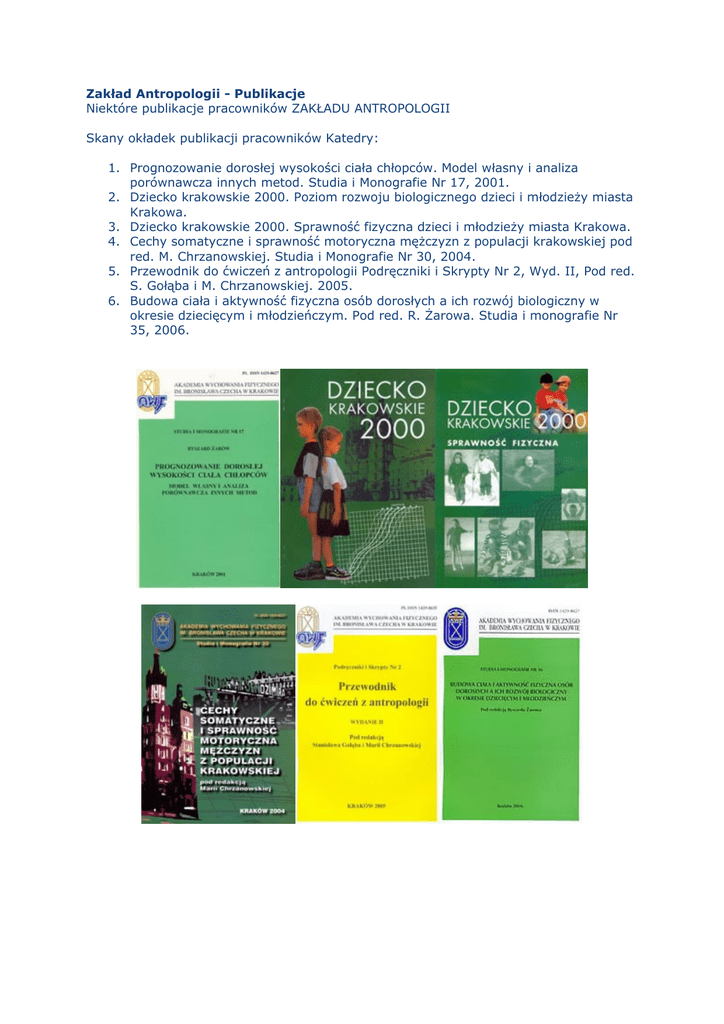 Zakład Antropologii - Publikacje Niektóre publikacje pracowników ZAKŁADU ANTROPOLOGII Skany okładek publikacji pracowników Katedry: 1. Prognozowanie dorosłej wysokości ciała chłopców. Model własny i analiza porównawcza innych metod. Studia i Monografie Nr 17, 2001. 2. Dziecko krakowskie 2000. Poziom rozwoju biologicznego dzieci i młodzieży miasta Krakowa. 3. Dziecko krakowskie 2000. Sprawność fizyczna dzieci i młodzieży miasta Krakowa. 4. Cechy somatyczne i sprawność motoryczna mężczyzn z populacji krakowskiej pod red. M. Chrzanowskiej. Studia i Monografie Nr 30, 2004. 5. Przewodnik do ćwiczeń z antropologii Podręczniki i Skrypty Nr 2, Wyd. II, Pod red. S. Gołąba i M. Chrzanowskiej. 2005. 6. Budowa ciała i aktywność fizyczna osób dorosłych a ich rozwój biologiczny w okresie dziecięcym i młodzieńczym. Pod red. R. Żarowa. Studia i monografie Nr 35, 2006. prof. dr hab. Maria Chrzanowska 1. Chrzanowska M., 1992. Biologiczne i społeczno-ekonomiczne determinanty rozwoju podskórnej tkanki tłuszczowej u dzieci i młodzieży (rozprawa habilitacyjna). Wyd. Monograf. Nr 49 AWF w Krakowie, s. 293. 2. Chrzanowska M., 1993. Niektóre odrębności rozwojowe dzieci otyłych i nadmiernie szczupłych. Przegląd Antropol. Tom 56, z. 1 - 2, s. 37 - 52. 3. Chrzanowska M., 1998. Niektóre epidemiologiczne i społeczno-kulturowe aspekty nadwagi i otyłości na przykładzie populacji dorosłych z regionu Polski PołudniowoWschodniej. W: Społeczne kontrasty w stanie zdrowia Polaków, AWF Warszawa, s. 41 - 54. 4. Chrzanowska M., 1999. Wpływ otłuszczenia ciała w dzieciństwie na występowanie otyłości we wczesnym wieku dorosłym (12-letnie badania longitudinalne). Pediatria Polska, Tom LXXIV, Nr 3, s. 239 - 245. 5. Chrzanowska M., Gołąb, Żarów R., Sobiecki J., Brudecki J., 2002. Dziecko Krakowskie 2000. Poziom rozwoju biologicznego dzieci i młodzieży miasta Krakowa. Studia i Monografie AWF w Krakowie Nr 19, s. 98. 6. Gołąb S., M. Chrzanowska, J. Sobiecki, R. Żarów, T. Kościuk, J. Brudecki, S. Matusik, J. Pałosz, T. Gwardjak, A. Suder, K. Cadel 2003. Dziecko Krakowskie 2000. Sprawność fizyczna i postawa ciała i młodzieży miasta Krakowa. Pod red. S. Gołąba i M. Chrzanowskiej. Studia i Monografie Nr 22 AWF w Krakowie, s. 98. 7. Gołąb S., M. Chrzanowska, J. Sobiecki, R. Żarów, A. Woronkowicz, J. Brudecki, 2004. Cechy somatyczne i sprawność motoryczna mężczyzn z populacji krakowskiej. Pod red. M. Chrzanowskiej. Studia i Monografie Nr 30, AWF w Krakowie, s. 151-152. 8. Chrzanowska M., Matusik S., 2006. Male Inhabitants of Krakow and Their Selfassessment of Health Condition in the Light of Selected Biological Traits, social Variables, and Lifestyles. Polish J. Environ. Stud. Vol. 15, No 2b, s. 1034-1037. 9. Chrzanowska M., Sobiecki J., Kowal M., Kościuk T., Matusik S., 2006. Is there a relationship beetween body build and serum level of cholesterol and triglycerides in women? Przegląd Antropologiczny - Anthropological Review, vol. 69. 10. Chrzanowska M., 2006. Nadwaga i otyłość dzieci i młodzieży Krakowa na tle standardów międzynarodowych. W: Otyłość - epidemią XXI wieku. Dziewiąte Warsztaty Antropologiczne. Warszawa. 11. Chrzanowska M., J. Sobiecki, M. Kowal, T. Kościuk, S. Matusik. S., 2006. Is there a relationship beetween body build and the serum level of cholesterol and triglycerides in women? Przegląd Antropologiczny – Anthropological Review, Vol. 69, s. 37 – 47. 12. Żychowicz P., M. Chrzanowska, 2006. Sexual maturation in vissually disabled boys and girls. Polish Journal of Environmental Studies, Vol. 15, Nr 5B, cz. I, s. 79 – 82. 13. Chrzanowska M., S. Kozieł, Stanley J. Uliaszek 2007. Changes in BMI and the prevalence of overweight and obesity in children and adolescents. Economics and Human Biology 5: 370-378. 14. Chrzanowska Maria, Agnieszka Suder, 2008. Ontogenesis changes and sex dimorphism of subcutaneous fat distribution: 12-year longitudianl study of children and adolescents from Cracow, Poland. American Journal of Human Biology. 15. Curyło Marta, Maria Chrzanowska, Maria Gacek, 2008. The level of body fatness versus eating habits in adolescents of 16 – 19 years of age. Polish Journal of Environmental Studies, Vol. 17, No 4A, s. 77-81. 16. Maria Chrzanowska, 2010. Ekspansja nadwagi w populacji dzieci i młodzieży Krakowa w okresie 1971 – 2000 w świetle wskaźnika EOW (Extent Overweight). Extent of overweight in population of children and adolescents in Cracow in 1971 – 2000 on the ground EOW (Extent of Overweight) index. Pediatria Polska. Tom 85, nr 1 (2010), s. 481 – 484. 17. Maria Chrzanowska, Agnieszka Suder, 2010. Canges in central fatness and abdominal obesity in children and adolescents from Cracow, Poland 1983 – 2000. Annals of Human Biology. 37(2) s. 243 – 253. 37(2), s. 243 – 253. 18. Maria Chrzanowska, Agnieszka Suder, 2010. The extent of overweight index in children and adolescents from Cracow, Poland (1971 – 2000). Homo – Journal of Comparative Human Biology. 61 (2010), s. 453 – 458. 19. Bartłomiej Sokołowski, Maria Chrzanowska. 2010. Changes in somatic and motor development in children and adolescents in the years 1980-1988 and in 2000. Zmiany w rozwoju somatycznym i motorycznym u dzieci i młodzieży w latach 1980 – 1988 i w roku 2000. Antropomotoryka. Vol. 20, nr 49, s. 81 – 88. 20. Marta Curyło, Maria Chrzanowska. 2010. The influence of selected lifestyle elements on body mass index and the level of body lipomatosis. Wpływ wybranych elementów stylu życia na wskaźnik masy ciała i poziom otłuszczenia.(W): Medical and social problem of human in different periods of life. Edited by Zbigniew Kotwica. Monografia Nr 149, s. 479 – 489. Technical University of Radom. prof. dr hab. Stanisław Gołąb 1. Gołąb S., 1979, Wpływ wybranych czynników rodzicielskich (wysokości ciała, wieku w chwili urodzenia dziecka, kolejności urodzenia dziecka oraz aktywności ruc