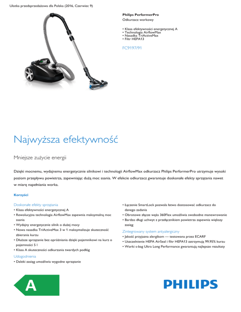 Ulotka przedsprzedażowa dla Polska (2016, Czerwiec 9) Philips PerformerPro Odkurzacz workowy • Klasa efektywności energetycznej A • Technologia AirflowMax • Nasadka TriActiveMax • Filtr HEPA13 FC9197/91 Najwyższa efektywność Mniejsze zużycie energii Dzięki mocnemu, wydajnemu energetycznie silnikowi i technologii AirflowMax odkurzacz Philips PerformerPro utrzymuje wysoki poziom przepływu powietrza, zapewniając dużą moc ssania. W efekcie odkurzacz gwarantuje doskonałe efekty sprzątania nawet w miarę napełniania worka. Korzyści Doskonałe efekty sprzątania • Klasa efektywności energetycznej A • Rewolucyjna technologia AirflowMax zapewnia maksymalną moc ssania • Wydajny energetycznie silnik o dużej mocy • Nowa nasadka TriActiveMax 3 w 1 maksymalizuje skuteczność zbierania kurzu • Dłuższe sprzątanie bez opróżniania dzięki pojemnikowi na kurz o pojemności 5 l • Klasa A skuteczności odkurzania twardych podłóg Udogodnienia • Daleki zasięg umożliwia wygodne sprzątanie • Łączenie SmartLock pozwala łatwo dostosować odkurzacz do danego zadania • Obrotowe złącze węża 360Flex umożliwia swobodne manewrowanie • Bardzo długi uchwyt z przełącznikiem powietrza zapewnia większy zasięg Zintegrowany system antyalergiczny • Jakość przyjazna alergikom — testowana przez ECARF • Uszczelnienie HEPA AirSeal i filtr HEPA13 zatrzymują 99,95% kurzu • Worki s-bag Ultra Long Performance gwarantują najlepsze rezultaty PerformerPro Cechy Klasa efektywności energetycznej A Łączenie SmartLock Ten odkurzacz został stworzony z myślą o uzyskaniu najwyższej wydajności przy zachowaniu klasy efektywności energetycznej A. Unikalne połączenie Philips SmartLock na nasadkach i rurze teleskopowej umożliwia łatwe łączenie i rozłączanie tych części podczas czyszczenia. Połączenie SmartLock pozwala na intuicyjne regulowanie długości rury teleskopowej do preferowanej wysokości. Technologia AirflowMax Pojemność pojemnika na kurz — 5 l Technologia AirflowMax maksymalizuje przepływ powietrza, co sprawia, że worek równomiernie się rozwija. Dzięki temu w miarę napełniania worka moc ssania utrzymuje się na wysokim poziomie. Wydajny energetycznie silnik Specjalnie zaprojektowana komora na kurz o pojemności 5 l umożliwia optymalne wykorzystanie worka na kurz, dzięki czemu można sprzątać dłużej. Obrotowe złącze węża 360Flex Obrotowe złącze węża 360Flex obraca się o 360 stopni, dzięki czemu umożliwia swobodne manewrowanie wężem odkurzacza w całym domu. Znak jakości ECARF Wysoce wydajny silnik zużywa mniej energii, aby zapewnić przepływ powietrza. W połączeniu z dedykowaną nasadką zapewnia najlepsze wyniki w zakresie zbierania kurzu. Nasadka TriActiveMax Odkurzacz z filtrem HEPA 13 otrzymał znak jakości Europejskiego Centrum Badań nad Alergiami (ECARF) jako przyjazny chorym na alergię. Filtr HEPA 13 oczyszcza powietrze wylotowe z 99,95% alergenów z sierści psów i kotów, a także z roztoczy i pyłków, tworząc w domu atmosferę przyjazną alergikom. Uszczelnienie HEPA AirSeal, filtr HEPA13 Nasadka TriActiveMax 3 w 1 zapewnia idealne przyleganie do podłogi, aby zmaksymalizować skuteczność zbierania kurzu. 1) Za pomocą specjalnie zaprojektowanej stopy delikatnie „otwiera” dywan w celu dokładnego usunięcia kurzu. 2) Wysysa duże cząsteczki przez duży otwór z przodu. 3) Zamiata kurz i brud wzdłuż mebli i ścian za pomocą dwóch szczotek bocznych. Daleki zasięg Filtr HEPA13 i uszczelnienie AirSeal wyłapuje nawet najdrobniejsze cząsteczki kurzu znajdujące się w wydmuchiwanym powietrzu, co zapewnia ochronę przed kurzem i czyste powietrze, które jest wolne od alergenów. Wydmuchiwane powietrze jest nawet czystsze niż powietrze w pokoju. s-bag Ultra Long Performance Zasięg 11 m umożliwia czyszczenie większych powierzchni bez konieczności przełączania wtyczki. Bardzo duży, 5-litrowy worek s-bag Ultra Long Performance zapewnia najlepsze efekty odkurzania przez jeszcze dłuższy czas. Wykonany z najwyższej jakości wielowarstwowego, niezatykającego się materiału worek s-bag Ultra Dane wkrótce ulegną zmianie 2016, Czerwiec 9 PerformerPro Long Performance gwarantuje doskonałą moc ssania i filtrację. Ponadto można wykorzystywać go o 80% dłużej niż standardowy worek na kurz. Przełącznik powietrza umożliwia regulowanie mocy ssania bez konieczności schylania. Długi uchwyt z przełącznikiem powietrza Klasa A odkurzania twardych podłóg Ergonomiczny uchwyt jest wygodny w użytkowaniu. Jego wyjątkowa długość sprawia, że można sięgać dalej i łatwo czyścić trudno dostępne miejsca. Ten produkt osiąga najwyższą klasę skuteczności odkurzania twardych podłóg. Zbiera 100% kurzu! Specyfikacje Prosimy pamiętać, że jest to ulotka przedsprzedażowa. Treść ulotki jest zgodna z naszą najlepszą wiedzą w momencie publikacji i w odniesieniu do danego kraju (podane powyżej). Treść ulotki może ulec zmianie bez powiadomienia. Firma Philips nie ponosi odpowiedzialności za treść ulotki. Wydajność Klasa efektywności energetycznej Roczne zużycie energii Klasa skuteczności odkurzania dywanów Klasa skuteczności odkurzania podłóg twardych Klasa reemisji kurzu Poziom głośności Moc wejściowa (IEC) Nadmuch (maks.) Podciśnienie (maks.) Nasadki i akcesoria A Standardowa nasadka Akcesoria w zestawie 27,8 kWh Schowek na akcesoria Dodatkowa nasadka C A Waga produktu Wymiary produktu (D x S x W) A 78 dB 650 W 30,2 l/s 16,3 kPa Opakowanie Instrukcja obsługi Głęboka czerń oraz zieleń Typ rury Łączenie rury Uchwyt do przenoszenia System ułatwiający przechowywanie Typ kółek Regulacja mocy 5L s-bag Ultra Long Performance Filtr Ultra Clean Air HEPA 13 Potrójna warstwa 11 m 8m Ergonomiczny uchwyt z przełącznikiem powietrza Metalowa, dwuczęściowa rura teleskopowa SmartLock U góry i z przodu W pionie i w poziomie Gumowe Elektroniczna, na