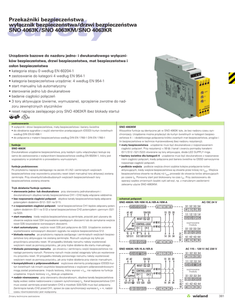 Przekaźniki bezpieczeństwa wyłącznik bezpieczeństwa/drzwi bezpieczeństwa SNO 4063K/SNO 4063KM/SNO 4063KR safety Urządzenie bazowe do nazdoru jedno- i dwukanałowego wyłączników bezpieczeństwa, drzwi bezpieczeństwa, mat bezpieczeństwa i osłon bezpieczeństwa • kategoria stopu 0 według EN 60204-1 • zastoswanie do kategorii 4 według EN 954-1 • kategoria bezpieczeństwa urządznie: 4 według EN 954-1 • start manualny lub automatyczny • sterowanie jedno lub dwukanałowe • badanie ciągłości połączeń • 3 tory aktywujące (zwierne, wymuszane), sprzężenie zwrotne do nadzoru zewnętrznych styczników • reset napięcia zasilającego przy SNO 4063KR (bez blokady startu) bE zastosowanie • wyłącznik i drzwi bezpieczeństwa, maty bezpieczeństwa i bariery świetlne • do obrabiania sygnałów z wyjść elementów przełączających (OSSD) kurtyn świetlnych według DIN EN 61496-1 • do połączenia z matami bezpieczeństwa według DIN EN 1760-1 DIN EN 1760-1 funkcje SNO 4063K Dwukanałowe urządzenie bezpieczeństwa, przy każdym cyklu włącz/wyłącz testuje się samo do zastosowania z wyłącznikiem bezpieczeństwa według EN 60204-1, który jest wyposażony w przekaźniki o prowadzeniu wymuszonym. funkcje podstawowe: Po przyłożeniu napięcia zasilającego na zaciski A1 / A2 i zamkniętych wejściach bezpieczeństwa oraz wyzwoleniu przycisku reset (start manualny) tory aktywacji zostaną zamknięte. Przy otwartych/ odwzbudzonych wejściach bezpieczeństwach tory bezpieczeństwa zostaną otwarte. Tryb działania/ funkcje systemu • sterowanie jedno- lub dwukanałowe przy sterowaniu jednokanałowym i dwukanałowym obydwa kanały bezpieczeństwa CH1 i CH2 będą włączane oddzielnie. • bez rozpoznania ciągłości połączeń obydwa kanały bezpieczeństwa będą załączane potencjałem dodatnim (S12 i S31 na S11). • z rozpoznaniem ciągłości połączeń kanał bezpieczeństwa CH1 będzie załączany potencjałem dodatnim (S11 na S12) a kanał bezpieczeństwa CH2 potencjałem ujemnym (S21 na S22). • start manulany kiedy wejścia bezpieczeństwa są zamknięte, przycisk jest używany do otwarcia wejścia reset S34 (wyzwalanie opadającym zboczem) lub do zamykania wejścia reset S35 (wyzwalanie wznoszącym zboczem). • start automatyczny wejście reset S35 jest połączone do S33. Urządzenie zostanie wystartowane wznoszącym zboczem sygnału na wejście bezpieczeństwa S12. • blokada rozruchu po przyłożeniu napięcia zasiljącego i zamkniętych wejściach bezpieczeństwa tory aktywujące nie zostaną zamknięte. Rozruch uzyskuje się tylko po przyciśnięciu przycisku reset. W przypadku blokady rozruchu należy wysterować wejściem reset za pomocą przycisku, jak przy trybie działania dla startu manualnego. • blokada ponownego rozruchu po otwarciu i zamknięciu wejść bezpieczeństwa nie nastąpi ponowny rozruch. Ponowny rozruch może zostać osiągnięty tylko po wysterowaniu przycisku reset. W przypadku blokady ponownego rozruchu należy wysterować wejściem reset za pomocą przycisku, jak przy trybie działania przy starcie manualnym. • kompatybilność z półprzewodnikami wyjściowe elementy przełączające (OSSD) kurtyn świetlnych lub innych czujników bezpieczeństwa z wyjściami półprzewodnikowymi mogą zostać przetwarzane. Impuls testowy, który wynosi < tTP, nie wpływa na funkcje urządzenia. Impuls testowy > tTP blokuje urządzenie. • nadzór równoczesny przy sterowaniu dwukanałowym, obydwa kanały bezpieczeństwa będą wobec siebie nadzorowane z czasem synchronizacji tS. Kanał bezpieczeństwa CH1 musi zostać zamknięty przed kanałem CH2 a mostkek S33 / S35 musi być połączony. Zamknięcie kanału CH2 przed CH1, sprawi że czas synchronizacji wyniesie tS = ∞, nadzór czasu równiczesności jest wyłączony. Zmiany techniczne zastrzeżone SNO 4063KM Wszystkie funkcje są identyczne jak w SNO 4063K tyle, że bez nadzoru czasu synchronizacji. Urządzenie można przyłaczyć do kurtyn świetlnych w kategorii bezpieczeństwa 4 i i dodatkowego połączenia krótko zwartych mat bezpieczeństwa, progów i lin bezpieczeństwa w technice 4-przewodowej (bez nadzoru rezystancji). • maty bezpieczeństwa urządzenie musi być dwukanałowe z rozpoznawaniem ciągłości połączeń. Przy rezystancji < 50 Ω / kanał i zwarciu pomiędzy kanałami (S11 / S12 i S21 / S22) otwierane są tory aktywujące, dioda LED SUPPLY miga. • bariery świetlne dla kategorii 4 urządzenie musi być dwukanałowe z rozpoznawaniem ciągłości połączeń, kiedy połączona jest bariera świetlna na OSSD samoczynnie rozpoznaje ciągłość połączeń. • podbicie wejścia podbicie wejścia chroni szybkie kolejne przełączenie torów aktywujących, kiedy wejścia bezpieczeństwa są otwarte przez krócej niż tASP. Wejścia bezpieczeństwa otwarte na dłużej niż tASP prowadzi do otwarcia torów aktywujących po czasie tR. Ponowny start jest blokowany na czas tSP. Przy zastosowaniu do operacji szybko zmiennych (szybki cykl zał-wył, np. z manulanym zasileniem) zalecamy użycie SNO 4063KM. schemat połączeń SNO 4063K / KR / KM / K-A / KR-A / KM-A AC / DC 24 V wyjmowane moduły SNO 4063K / KR / K-A / KR-A AC 115 – 120 V / AC 230 V wyjmowane moduły 381 Przekaźniki bezpieczeństwa wyłącznik bezpieczeństwa/drzwi bezpieczeństwa SNO 4063K/SNO 4063KM/SNO 4063KR safety safety funkcje (kontynuacja) SNO 4063KR Funkcje odpowiadają urządzeniu SNO 4063K bez blokady startu. Po przyłożeniu napięcia zasilającego i zamkniętych wejściach bezpieczenstwa, tory aktywujące zostaną zamknięte, niezależnie od tego czy zostanie wystartowane automatycznie czy manualnie. Urządzenie może być zainstalowane tam, gdzie po załączeniu napięcia niezbędne jest automatyczne uruchomienie (np. kompresory lub urządzenia uzdatniania wody ze szczegółowo podzielonymi obwodami wyłącznika bezpieczeństwa). Wykres funkcji SNO 4063K start manualny