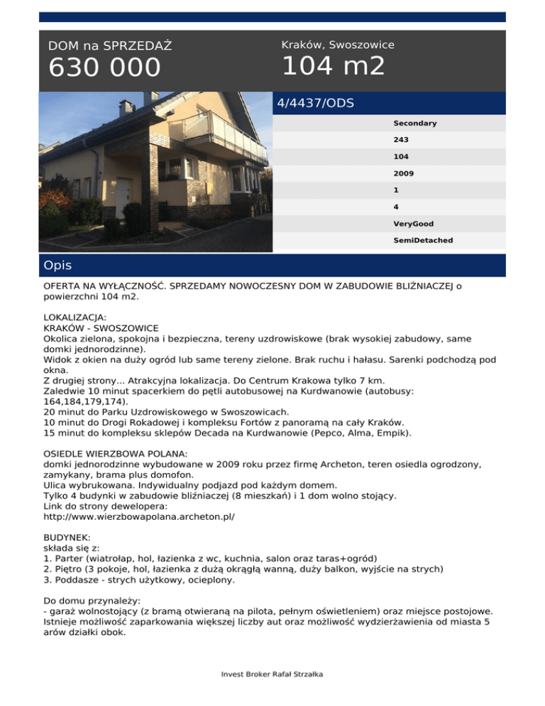 DOM na SPRZEDAŻ 630 000 Kraków, Swoszowice 104 m2 4/4437/ODS Secondary 243 104 2009 1 4 VeryGood SemiDetached Opis OFERTA NA WYŁĄCZNOŚĆ. SPRZEDAMY NOWOCZESNY DOM W ZABUDOWIE BLIŹNIACZEJ o powierzchni 104 m2. LOKALIZACJA: KRAKÓW - SWOSZOWICE Okolica zielona, spokojna i bezpieczna, tereny uzdrowiskowe (brak wysokiej zabudowy, same domki jednorodzinne). Widok z okien na duży ogród lub same tereny zielone. Brak ruchu i hałasu. Sarenki podchodzą pod okna. Z drugiej strony... Atrakcyjna lokalizacja. Do Centrum Krakowa tylko 7 km. Zaledwie 10 minut spacerkiem do pętli autobusowej na Kurdwanowie (autobusy: 164,184,179,174). 20 minut do Parku Uzdrowiskowego w Swoszowicach. 10 minut do Drogi Rokadowej i kompleksu Fortów z panoramą na cały Kraków. 15 minut do kompleksu sklepów Decada na Kurdwanowie (Pepco, Alma, Empik). OSIEDLE WIERZBOWA POLANA: domki jednorodzinne wybudowane w 2009 roku przez firmę Archeton, teren osiedla ogrodzony, zamykany, brama plus domofon. Ulica wybrukowana. Indywidualny podjazd pod każdym domem. Tylko 4 budynki w zabudowie bliźniaczej (8 mieszkań) i 1 dom wolno stojący. Link do strony dewelopera: http://www.wierzbowapolana.archeton.pl/ BUDYNEK: składa się z: 1. Parter (wiatrołap, hol, łazienka z wc, kuchnia, salon oraz taras+ogród) 2. Piętro (3 pokoje, hol, łazienka z dużą okrągłą wanną, duży balkon, wyjście na strych) 3. Poddasze - strych użytkowy, ocieplony. Do domu przynależy: - garaż wolnostojący (z bramą otwieraną na pilota, pełnym oświetleniem) oraz miejsce postojowe. Istnieje możliwość zaparkowania większej liczby aut oraz możliwość wydzierżawienia od miasta 5 arów działki obok. Invest Broker Rafał Strzałka INFORMACJE NA TEMAT DOMU: Dom po remoncie w grudniu 2014 roku, podczas którego odświeżono wszystkie pomieszczenia, zmieniając kolory oraz rozprowadzając dodatkową instalację elektryczną (zgodnie z projektem dekoratora wnętrz). Ponadto wykonany został także remont balkonu na którym znajduje się obecnie wysokiej jakości deska kompozytowa. Do domu przynależy ogródek z tarasem. Ogród posiada możliwość wejścia również przez bramkę z podjazdu od strony garażu. PODŁOGI: deska barlinecka (pietro) oraz drewno egzotyczne (parter). Wiatrołap, holl i łazienki płytki. ŁAZIENKI: - dolna łazienka z wc dla gości - posiada kabinę prysznicową, umywalkę oraz wc. - górna łazienka - posiada ogrzewanie podłogowe oraz dużą owalną wannę. Istnieje możliwość podłączenia bidetu. Łazienka projektowana przez projektanta wnętrz z elementami marmuru. Schody drewniane na piętro. POMIESZCZENIA: Parter 1. pokój dzienny + jadalnia 25.10 m2 2. kuchnia 9.70 m2 3. hol 6.50 m2 4. wiatrołap 3.90 m2 5. łazienka 3.70 m2 6. klatka schodowa 1.80 m2 Piętro 1. pokój 11.90 m2 (sypialnia - z oknem balkonowym oraz dachowym) 2. pokój 8.70 m2 (pokój dziecka - z oknem balkonowym) 3. pokój 5.60 m2 (pokój biurowy - z oknem dachowym) 4. łazienka 4.70 m2 5. przedpokój 3.60 m2 6. klatka schodowa 1.80 m2 Powierzchnia użytkowa domu to około 85 m2. Ogrzewanie: piec dwu-funkcyjny Dietrich. Kanalizacja w trakcie budowy. Planowana podłączenie w 2016 roku. Gotowy projekt jest już w MPWiK. Piotr Przychodzki tel. 660416297 email: [email protected] Invest Broker Rafał Strzałka Powered by TCPDF (www.tcpdf.org)