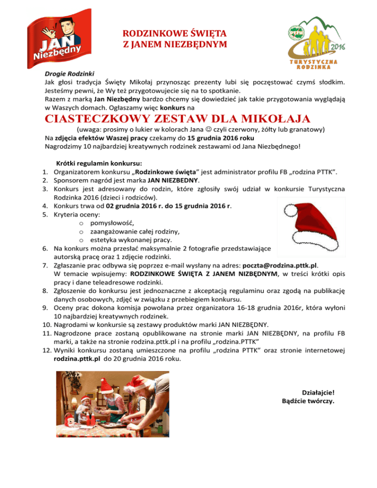 RODZINKOWE ŚWIĘTA Z JANEM NIEZBĘDNYM Drogie Rodzinki Jak głosi tradycja Święty Mikołaj przynosząc prezenty lubi się poczęstować czymś słodkim. Jesteśmy pewni, że Wy też przygotowujecie się na to spotkanie. Razem z marką Jan Niezbędny bardzo chcemy się dowiedzieć jak takie przygotowania wyglądają w Waszych domach. Ogłaszamy więc konkurs na CIASTECZKOWY ZESTAW DLA MIKOŁAJA (uwaga: prosimy o lukier w kolorach Jana czyli czerwony, żółty lub granatowy) Na zdjęcia efektów Waszej pracy czekamy do 15 grudnia 2016 roku Nagrodzimy 10 najbardziej kreatywnych rodzinek zestawami od Jana Niezbędnego! Krótki regulamin konkursu: 1. Organizatorem konkursu „Rodzinkowe święta” jest administrator profilu FB „rodzina PTTK”. 2. Sponsorem nagród jest marka JAN NIEZBEDNY. 3. Konkurs jest adresowany do rodzin, które zgłosiły swój udział w konkursie Turystyczna Rodzinka 2016 (dzieci i rodziców). 4. Konkurs trwa od 02 grudnia 2016 r. do 15 grudnia 2016 r. 5. Kryteria oceny: o pomysłowość, o zaangażowanie całej rodziny, o estetyka wykonanej pracy. 6. Na konkurs można przesłać maksymalnie 2 fotografie przedstawiające autorską pracę oraz 1 zdjęcie rodzinki. 7. Zgłaszanie prac odbywa się poprzez e-mail wysłany na adres: [email protected]. W temacie wpisujemy: RODZINKOWE ŚWIĘTA Z JANEM NIZBĘDNYM, w treści krótki opis pracy i dane teleadresowe rodzinki. 8. Zgłoszenie do konkursu jest jednoznaczne z akceptacją regulaminu oraz zgodą na publikację danych osobowych, zdjęć w związku z przebiegiem konkursu. 9. Oceny prac dokona komisja powołana przez organizatora 16-18 grudnia 2016r, która wyłoni 10 najbardziej kreatywnych rodzinek. 10. Nagrodami w konkursie są zestawy produktów marki JAN NIEZBĘDNY. 11. Nagrodzone prace zostaną opublikowane na stronie marki JAN NIEZBĘDNY, na profilu FB marki, a także na stronie rodzina.pttk.pl i na profilu „rodzina.PTTK” 12. Wyniki konkursu zostaną umieszczone na profilu „rodzina PTTK” oraz stronie internetowej rodzina.pttk.pl do 20 grudnia 2016 roku. Działajcie! Bądźcie twórczy.