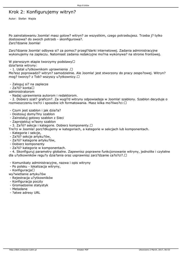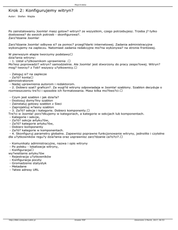 Moje 8 bitów Krok 2: Konfigurujemy witryn? Autor: Stefan Wajda Po zainstalowaniu Joomla! masz gotow? witryn? ze wszystkim, czego potrzebujesz. Trzeba j? tylko dostosowa? do swoich potrzeb - skonfigurowa?. Zarz?dzanie Joomla! Zarz?dzanie Joomla! odbywa si? za pomoc? przegl?darki internetowej. Zadania administracyjne wykonujemy na zapleczu. Natomiast zadania redakcyjne mo?na wykonywa? na stronie frontowej. W pierwszym etapie tworzymy podstawy dzia?ania witryny: - 1. Ustal u?ytkownikom uprawnienia . Mo?esz poprowadzi? witryn? samodzielnie. Ale Joomla! jest stworzony do pracy zespo?owej. Witryn? mog? tworzy? z Tob? wszyscy u?ytkownicy. - Zaloguj si? na zaplecze - Za?ó? konta administratorom - Nadaj uprawnienia autorom i redaktorom. - 2. Dobierz szat? graficzn?. Za wygl?d witryny odpowiadaja w Joomla! szablony. Szablon decyduje o rozmieszczeniu tre?ci i sposobie ich formatowania. Masz kilka mo?liwo?ci: - Czym jest szablon i jak dzia?a? - Dostosuj domy?lny szablon - Zainstaluj gotowy szablon z Sieci - Zaprojektuj w?asny szablon - 3. Za?ó? sekcje i kategorie. Dobierz komponenty. Tre?ci w Joomla! porz?dkujemy w kategoriach, a kategorie w sekcjach lub komponentach. - Kategorie i sekcje, - Za?ó? sekcje artyku?ów, - Za?ó? kategorie artyku?ów, - Dobierz komponenty - Za?ó? kategorie w komponentach. - 4. Skonfiguruj parametry globalne. Zapewnisz poprawne funkcjonowanie witryny, jednolite i czytelne dla u?ytkowników regu?y dzia?ania oraz usprawnisz zarz?dzanie ca?o?ci?. - Komunikaty administracyjne, nazwa i opis witryny - Po polsku - lokalizacja witryny, - Konfiguracja wy?wietlanie artyku?ów - Rejestracja u?ytkowników - Konfiguracja poczty - Gromadzenie statystyk - Metadane - ?atwe adresy URL http://8bit.computer.lublin.pl Kreator PDF Utworzono 2 March, 2017, 06:53