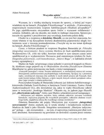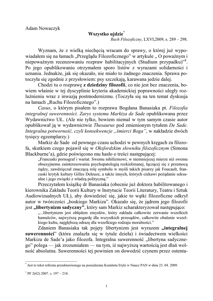 Adam Nowaczyk Wszystko ujdzie* Ruch Filozoficzny, LXVI,2009, s. 289 – 298. Wyznam, że z wielką niechęcią wracam do sprawy, o której już wypowiadałem się na łamach „Przeglądu Filozoficznego” w artykule „ O poważnym i niepoważnym recenzowaniu rozpraw habilitacyjnych (Studium przypadku)”1. Po jego opublikowaniu otrzymałem sporo listów z wyrazami solidarności i uznania. Jednakże, jak się okazało, nie miało to żadnego znaczenia. Sprawa potoczyła się zgodnie z przysłowiem: psy szczekają, karawana jedzie dalej. Chodzi tu o rozprawę z dziedziny filozofii, co nie jest bez znaczenia, bowiem właśnie w tej dyscyplinie kryteria akademickiej poprawności uległy rozluźnieniu wraz z inwazją postmodernizmu. (Toczyła się na ten temat dyskusja na łamach „Ruchu Filozoficznego”.) Casus, o którym pisałem to rozprawa Bogdana Banasiaka pt. Filozofia integralnej suwerenności. Zarys systemu Markiza de Sade opublikowana przez Wydawnictwo UŁ. (Ale nie tylko, bowiem niemal w tym samym czasie autor opublikował ją w wydawnictwie Thesaurus pod zmienionym tytułem De Sade. Integralna potworność, czyli konsekwencje „śmierci Boga”, w nakładzie dwóch tysięcy egzemplarzy.) Markiz de Sade od pewnego czasu uchodzi w pewnych kręgach za filozofa, skutkiem czego pojawił się w Oksfordzkim słowniku filozoficznym (Simona Blackburne’a), gdzie poświęcono mu hasło o treści następującej: „Francuski pornograf i wariat. Swemu nihilizmowi, w niemniejszej mierze niż swemu obsesyjnemu zainteresowaniu psychopatologią rozkiełznanej, łączącej się z przemocą żądzy, zawdzięczał znaczącą rolę symbolu w myśli takich pisarzy jak Foucault, francuski krytyk kultury Gilles Deleuze, a także innych, których ciekawi pożądanie seksualne i jego związki z władzą polityczną.” Przeczytałem książkę dr Banasiaka (obecnie już doktora habilitowanego i kierownika Zakładu Teorii Kultury w Instytucie Teorii Literatury, Teatru i Sztuk Audiowizualnych UŁ), aby dowiedzieć się, jakie to wątki filozoficzne odkrył autor w twórczości „boskiego Markiza”. Okazało się, że jądrem jego filozofii jest „libertynizm sadyczny”, który sam Markiz scharakteryzował następująco: „...libertynizm jest obłędem zmysłów, który zakłada całkowite zerwanie wszelkich hamulców, najwyższą pogardę dla wszystkich przesądów, całkowite obalenie wszelkiego kultu, najgłębszą odrazę dla wszelkiego rodzaju moralności.” Zdaniem Banasiaka tak pojęty libertynizm jest wyrazem „integralnej suwerenności” (która znalazła się w tytule dzieła) i świadectwem wielkości Markiza de Sade’a jako filozofa. Integralna suwerenność „libertyna sadycznego” polega — jak zrozumiałem — na tym, iż najwyższą wartością jest dlań wolność absolutna. Suwerenności tej powinien on dowodzić czynem przez ostenta* Jest to tekst referatu przedstawionego na posiedzeniu Komitetu Etyki w Nauce PAN w dniu 23. 04. 2009. 1 PF 2(62) 2007. s. 197 – 210. 1 cyjne gwałcenie norm uchodzących za obowiązujące, najlepiej tych, których pogwałcenie wywołuje najsilniejsze potępienie i uczucie odrazy. (Sam Markiz — jak wiadomo — zalecał zbrodnie seksualne i koprofagię.) Tak rozumiany libertynizm jest po prostu wzorcem osobowym adresowanym do ludzi „silnych”, którzy urodzili się libertynami, zaś wątek filozoficzny pojawia się tu jedynie w postaci nieporadnych prób jego metafizycznego uzasadnienia (na przykład:. bo tak nakazuje Natura, która sama jest okrutna). Jednakże wielkość Markiza polega — według Bogdana Banasiaka — również na tym, że: • był „prekursorem współczesnej wiedzy” w psychiatrii, seksuologii, psychoanalizie, a także w nauce o wychowaniu (świadczyć ma o tym fakt, że jego spuścizną zajmują się uczeni), • antycypował odkrycia całej plejady myślicieli: Hegla, Feuerbacha, Marksa, Proudona, Malthusa, Spencera, Bakunina, Kropotkina, a przede wszystkim Nietzschego, • wzorem Tomasza Morusa zaprojektował „zbiorowość godną złotego wieku”, • był „rzecznikiem postępu, obrońcą praw obywatelskich, bojownikiem o niezależność myśli” a także „rzecznikiem ruchu wyzwolenia kobiet” (czyli tych — według jego własnego określenia — „zwierząt najniższego gatunku”). Osobliwością rozprawy Banasiaka jest to, że głosząc takie rewelacje sytuujące de Sade’a wśród najwybitniejszych przedstawicieli epoki Oświecenia, autor nie odwołuje się do jego dzieł, lecz posługuje obficie się cytatami zaczerpniętymi z tekstów jego współczesnych wielbicieli: Foucaulta, Deleuze’a, Bataille’a, Blanchota, Klossowskiego, Lacana, Henaffa i innych. Wszystko, co autorzy ci napisali przyjmuje bez zastrzeżeń, ponieważ są oni — jak pisze — „najwybitniejszymi umysłami współczesności”. Nie zauważa, iż przytaczane przezeń ich wypowiedzi są często bełkotliwe, absurdalne i wzajemnie się wykluczające. Aby to zauważyć, nie trzeba być znawcą filozofii Oświecenia i twórczości Markiza; wystarczy odrobina zdrowego rozsądku.. Oto przykłady: • „...dzieje się coś, co gmatwa granice wiedzy i pożądania: filozofii naucza się w buduarze, wykład ma miejsce podczas orgii”; „(stosunek scena/rozprawa nie jest jedynie grą wymiany — trochę seksu za trochę filozofii — lecz wewnątrztekstualnym dowodem libidalnego ataku wywodu)” [Henaff]. • Myśl Sade’a „polega na przejściu od rozumowania do orgii i od orgii do rozumowania, dzięki czemu przekracza on język i wyraża — za pomocą ubogiego słownictwa mechanistycznego, jakie miał do dyspozycji — prawdę, której złożoność i bogactwo były nieredukowalne do słów” [Brochier]. (Tu — jak widać — autor stara się nas przekonać, że pewne doniosłe prawdy — zapewne filozoficzne — dają się wyrazić za pomocą mechanicznego słownictwa jedynie w połączeniu z orgią.) 2 • Inny autor 