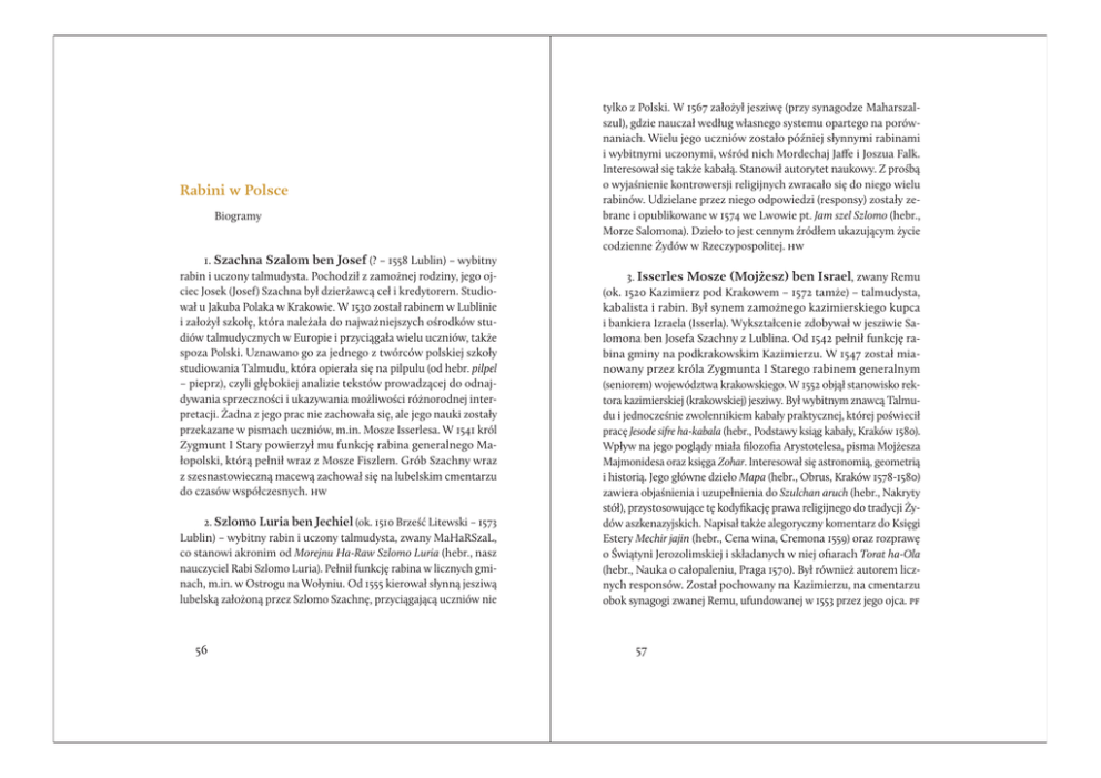 Rabini w Polsce Biogramy 1. Szachna Szalom ben Josef (? – 1558 Lublin) – wybitny rabin i uczony talmudysta. Pochodził z zamożnej rodziny, jego ojciec Josek (Josef) Szachna był dzierżawcą ceł i kredytorem. Studiował u Jakuba Polaka w Krakowie. W 1530 został rabinem w Lublinie i założył szkołę, która należała do najważniejszych ośrodków studiów talmudycznych w Europie i przyciągała wielu uczniów, także spoza Polski. Uznawano go za jednego z twórców polskiej szkoły studiowania Talmudu, która opierała się na pilpulu (od hebr. pilpel – pieprz), czyli głębokiej analizie tekstów prowadzącej do odnajdywania sprzeczności i ukazywania możliwości różnorodnej interpretacji. Żadna z jego prac nie zachowała się, ale jego nauki zostały przekazane w pismach uczniów, m.in. Mosze Isserlesa. W 1541 król Zygmunt I Stary powierzył mu funkcję rabina generalnego Małopolski, którą pełnił wraz z Mosze Fiszlem. Grób Szachny wraz z szesnastowieczną macewą zachował się na lubelskim cmentarzu do czasów współczesnych. hw 2. Szlomo Luria ben Jechiel (ok. 1510 Brześć Litewski – 1573 Lublin) – wybitny rabin i uczony talmudysta, zwany MaHaRSzaL, co stanowi akronim od Morejnu Ha-Raw Szlomo Luria (hebr., nasz nauczyciel Rabi Szlomo Luria). Pełnił funkcję rabina w licznych gminach, m.in. w Ostrogu na Wołyniu. Od 1555 kierował słynną jesziwą lubelską założoną przez Szlomo Szachnę, przyciągającą uczniów nie 56 tylko z Polski. W 1567 założył jesziwę (przy synagodze Maharszalszul), gdzie nauczał według własnego systemu opartego na porównaniach. Wielu jego uczniów zostało później słynnymi rabinami i wybitnymi uczonymi, wśród nich Mordechaj Jaffe i Joszua Falk. Interesował się także kabałą. Stanowił autorytet naukowy. Z prośbą o wyjaśnienie kontrowersji religijnych zwracało się do niego wielu rabinów. Udzielane przez niego odpowiedzi (responsy) zostały zebrane i opublikowane w 1574 we Lwowie pt. Jam szel Szlomo (hebr., Morze Salomona). Dzieło to jest cennym źródłem ukazującym życie codzienne Żydów w Rzeczypospolitej. hw 3. Isserles Mosze (Mojżesz) ben Israel, zwany Remu (ok. 1520 Kazimierz pod Krakowem – 1572 tamże) – talmudysta, kabalista i rabin. Był synem zamożnego kazimierskiego kupca i bankiera Izraela (Isserla). Wykształcenie zdobywał w jesziwie Salomona ben Josefa Szachny z Lublina. Od 1542 pełnił funkcję rabina gminy na podkrakowskim Kazimierzu. W 1547 został mianowany przez króla Zygmunta I Starego rabinem generalnym (seniorem) województwa krakowskiego. W 1552 objął stanowisko rektora kazimierskiej (krakowskiej) jesziwy. Był wybitnym znawcą Talmudu i jednocześnie zwolennikiem kabały praktycznej, której poświecił pracę Jesode sifre ha-kabala (hebr., Podstawy ksiąg kabały, Kraków 1580). Wpływ na jego poglądy miała filozofia Arystotelesa, pisma Mojżesza Majmonidesa oraz księga Zohar. Interesował się astronomią, geometrią i historią. Jego główne dzieło Mapa (hebr., Obrus, Kraków 1578-1580) zawiera objaśnienia i uzupełnienia do Szulchan aruch (hebr., Nakryty stół), przystosowujące tę kodyfikację prawa religijnego do tradycji Żydów aszkenazyjskich. Napisał także alegoryczny komentarz do Księgi Estery Mechir jajin (hebr., Cena wina, Cremona 1559) oraz rozprawę o Świątyni Jerozolimskiej i składanych w niej ofiarach Torat ha-Ola (hebr., Nauka o całopaleniu, Praga 1570). Był również autorem licznych responsów. Został pochowany na Kazimierzu, na cmentarzu obok synagogi zwanej Remu, ufundowanej w 1553 przez jego ojca. pf 57 4. Loew Jehudah ben Becalel (ok. 1525 Poznań – 1609 Praga) – wybitny rabin i uczony talmudysta, nazywany MaHaRaL, co stanowi akronim od Morejnu Ha-Raw Loew (hebr., nasz nauczyciel Rabi Loew). Pochodził z wpływowej rodziny rabinackiej, jego wuj pełnił funkcję rabina Rzeszy. Studiował w Polsce oraz w Niemczech. Pełnił funkcję rabina w Mikulovie na Morawach oraz w Poznaniu, ale najbardziej znany stał się jako główny rabin Pragi, gdzie założył też słynną jesziwę. Studiowali u niego późniejsi wybitni talmudyści, m.in. Jom Tow Heller i Dawid Gans. Zyskał sławę uczonego także w środowisku chrześcijańskim dzięki znajomości astronomii i matematyki. Pozostawił liczne prace, m.in. komentarze do dzieł Rasziego – Gur Arjeh (Młody Lew). XIX-wieczna legenda przypisuje mu stworzenie golema (hebr., nieuformowany), czyli sztucznego człowieka ożywionego za pomocą imienia Stwórcy. Jego grób na cmentarzu na praskim Josefovie nadal jest odwiedzany przez religijnych Żydów. hw 5. Meir (Majer) ben Gedalia (ok. 1558 Lublin – 1616 Lublin) – rabin i uczony talmudysta, zwany MaHaRaM, co stanowi akronim od Morejnu Ha-Raw Meir (hebr., nasz nauczyciel Rabi Meir). W wieku 24 lat został rabinem i rektorem szkoły talmudycznej w Krakowie. W latach 1595–1613 pełnił funkcję rabina we Lwowie. Koniec życia spędził w Lublinie, jako rabin i rektor jesziwy. Uznawano go za wybitny autorytet w dziedzinie prawa religijnego, wydawał rozstrzygnięcia w kwestiach spornych jako posek (hebr., decydujący). Zachowała się jedynie część jego prac, są to komentarze wydawane wraz z edycjami Talmudu – Meir ejnej chachamim (hebr., Rozjaśniający oczy mędrcom) oraz zbiór responsów (odpowiedzi na pytania w kwestiach religijnych) Manhir ejnej chachamim (hebr., Otwierający oczy mędrcom) na temat działalności gospodarczej i politycznej Żydów polskich, a także ich życia codziennego m.in. funkcjonowania Waadu, czyli sejmu żydowskiego. Jego imię Maharam nosiła wzniesiona w XVI w. synagoga lubelska. hw 58 6. Serkes (Sirkes, Syrkin) Joel ben Samuel (Szmuel), zw. BaCh (1561 Lublin – 1640 Kazimierz pod Krakowem) – talmudysta, rabin. Wykształcenie religijne zdobywał m.in. w jesziwie Samuela Meszulama Phoebusa ben Izraela w Brześciu Litewskim. Pełnił funkcję rabina w wielu miastach: Prużanach, Lublini