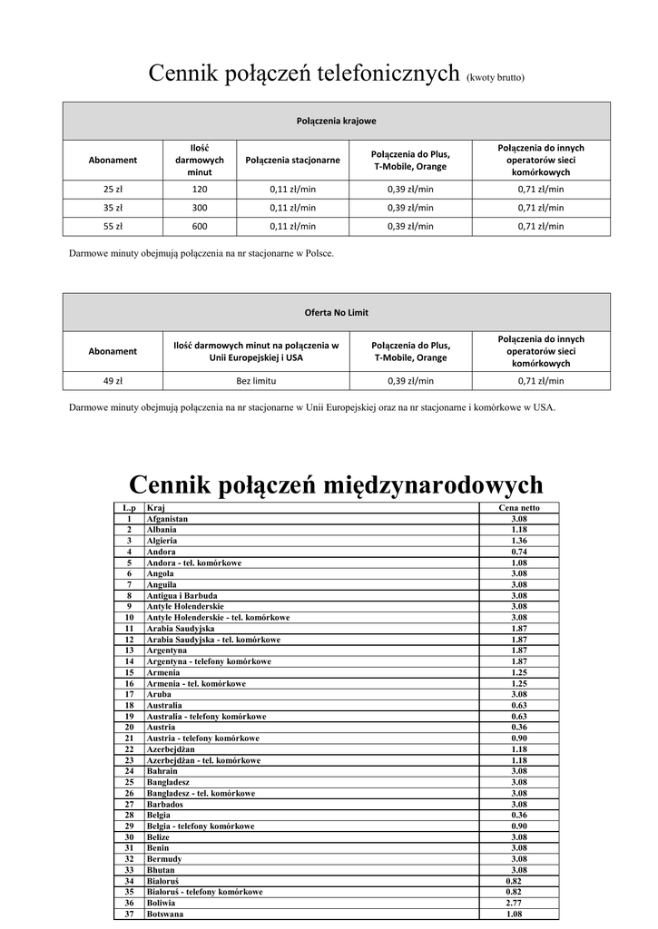 Cennik połączeń telefonicznych (kwoty brutto) Połączenia krajowe Abonament Ilość darmowych minut Połączenia stacjonarne Połączenia do Plus, T-Mobile, Orange Połączenia do innych operatorów sieci komórkowych 25 zł 120 0,11 zł/min 0,39 zł/min 0,71 zł/min 35 zł 300 0,11 zł/min 0,39 zł/min 0,71 zł/min 55 zł 600 0,11 zł/min 0,39 zł/min 0,71 zł/min Darmowe minuty obejmują połączenia na nr stacjonarne w Polsce. Oferta No Limit Abonament Ilość darmowych minut na połączenia w Unii Europejskiej i USA Połączenia do Plus, T-Mobile, Orange Połączenia do innych operatorów sieci komórkowych 49 zł Bez limitu 0,39 zł/min 0,71 zł/min Darmowe minuty obejmują połączenia na nr stacjonarne w Unii Europejskiej oraz na nr stacjonarne i komórkowe w USA. Cennik połączeń międzynarodowych L.p 1 2 3 4 5 6 7 8 9 10 11 12 13 14 15 16 17 18 19 20 21 22 23 24 25 26 27 28 29 30 31 32 33 34 35 36 37 Kraj Afganistan Albania Algieria Andora Andora - teł. komórkowe Angola Anguila Antigua i Barbuda Antyle Holenderskie Antyle Holenderskie - tel. komórkowe Arabia Saudyjska Arabia Saudyjska - tel. komórkowe Argentyna Argentyna - telefony komórkowe Armenia Armenia - tel. komórkowe Aruba Australia Australia - telefony komórkowe Austria Austria - telefony komórkowe Azerbejdżan Azerbejdżan - tel. komórkowe Bahrain Bangladesz Bangladesz - tel. komórkowe Barbados Belgia Belgia - telefony komórkowe Belize Benin Bermudy Bhutan Białoruś Białoruś - telefony komórkowe Boliwia Botswana Cena netto 3.08 1.18 1.36 0.74 1.08 3.08 3.08 3.08 3.08 3.08 1.87 1.87 1.87 1.87 1.25 1.25 3.08 0.63 0.63 0.36 0.90 1.18 1.18 3.08 3.08 3.08 3.08 0.36 0.90 3.08 3.08 3.08 3.08 0.82 0.82 2.77 1.08 38 39 40 41 42 43 44 45 46 47 48 49 50 51 52 53 54 55 56 57 58 59 60 61 62 63 64 65 66 67 68 69 70 71 72 73 74 75 76 77 78 79 80 81 82 83 84 Bośnia i Hercegowina Bośnia i Hercegowina - teł. komórkowe Brazylia Brazylia - tel. komórkowe Brunei Darussalam Burkina Faso Burundi Bułgaria Bułgaria - tel. komórkowe Chile Chile - tel. komórkowe Chiny Chiny - tel. komórkowe Chorwacja Chorwacja - telefony komórkowe Cypr Cypr - tel. komórkowe Czad Czechy Czechy - telefony komórkowe Dania Dania - telefony komórkowe Diego Garcia Dominika Dominikana Dżibutti Egipt Ekwador Ekwador - tel. komórkowe Erytrea Estonia Estonia - komórki Etiopia Falklandy Fidżi Fidżi - telefony komórkowe Filipiny Filipiny - telefony komórkowe Finlandia Finlandia - telefony komórkowe Francja Francja - telefony komórkowe Gabon Gabon - telefony komórkowe Gambia Ghana Ghana - telefony komórkowe 85 Gibraltar 86 Gibraltar - telefony komórkowe 87 Grecja 88 89 90 91 92 93 94 95 96 97 98 99 100 101 102 103 104 105 106 107 108 109 110 111 112 113 114 115 116 Grecja - telefony komórkowe Grenada Grenlandia Gruzja Gruzja - telefony komórkowe Guam Gujana Gujana Francuska Gujana Francuska - telefony komórkowe Gwadelupa Gwadelupa - telefony komórkowe Gwatemala Gwatemala - telefony komórkowe Gwinea Gwinea - Bissau Gwinea - Bissau - telefony komórkowe Gwinea Równikowa Haiti Haiti - telefony komórkowe Hiszpania Hiszpania - telefony komórkowe Holandia Holandia - telefony komórkowe Honduras Hong Kong Hong Kong - telefony komórkowe Indie Indie - telefony komórkowe Indonezja 1.08 1.08 3.08 3.08 3.08 3.08 3.08 1.00 1.00 3.08 3.08 3.08 3.08 0.97 0.97 0.36 1.18 3.08 0.36 0.90 0.36 0.90 3.08 3.08 3.08 3.08 3.08 2.49 2.49 3.08 0.36 1.46 3.08 3.08 3.08 3.08 3.08 3.08 0.36 0.97 0.36 0.97 2.49 2.49 3.08 3.08 3.08 0.74 1.36 0.36 0.97 3.08 3.08 1.06 1.06 3.08 3.08 2.49 2.49 2.49 2.49 2.49 2.49 3.08 3.08 3.08 3.08 3.08 3.08 0.36 1.06 0.36 1.08 3.08 3.08 3.08 3.08 3.08 3.08 117 118 119 120 121 122 123 124 125 126 127 128 129 130 131 132 133 134 135 136 137 138 139 140 141 142 143 144 145 146 147 148 149 150 151 152 153 154 155 156 157 158 159 160 161 162 163 164 165 166 167 168 169 170 171 172 173 174 175 176 177 178 179 180 181 182 183 184 185 186 187 188 189 190 191 192 193 194 195 196 Indonezja - telefony komórkowe Irak Iran Iran - telefony komórkowe Irlandia Irlandia - telefony komórkowe Islandia Islandia - telefony komórkowe Izrael Jamajka Jamajka - telefony komórkowe Japonia Japonia - telefony komórkowe Jemen Jordania Jordania - telefony komórkowe Jugosławia Jugosławia - telefony komórkowe Kajmany Kambodża Kamerun Kamerun - telefony komórkowe Kanada Katar Kazachstan Kazachstan - telefony komórkowe Kenia Kenia - telefony komórkowe Kirgistan Kirgistan -telefony komórkowe Kiribati Kiribati - telefony komórkowe Kolumbia Kolumbia - telefony komórkowe Komory Kongo Kongo - telefony komórkowe Kongo Rep. Kongo Rep.- telefony komórkowe Korea Północna Korea Południowa Korea Południowa - telefony komórkowe Kostaryka Kostaryka - telefony komórkowe Kuba Kuba - telefony komórkowe Kuwejt Kuwejt - telefony komórkowe Laos Lesotho Lesotho - telefony komórkowe Liban Liban - telefony komórkowe Liberia Liberia - telefony komórkowe Libia Libia - telefony komórkowe Lichtenstein Lichtenstein - telefony komórkowe Litwa Litwa - telefony komórkowe Luksemburg Luksemburg - telefony komórkowe Macedonia Madagaskar Makau Malawi Malediwy Malezja Malezja - telefony komórkowe Mali Malta Malta - telefony komórkowe Mariany Maroko Maroko - telefony komórkowe Martynika Martynika - telefony komórkowe Mauretania Mauritius 3.08 3.08 3.08 3.08 0.36 1.06 0.74 1.36 3.08 3.08 3.08 1.87 1.87 3.08 3.08 3.08 0.97 0.97 3.08 3.08 3.08 3.08 0.36 3.08 1.18 1.18 3.08 3.08 1.18 1.75 3.08 3.08 3.08 3.08 3.08 3.08 3.08 3.08 3.08 3.08 3.08 3.08 3.08 3.08 3.08 3.08 3.08 3.08 3.08 3.08 3.08 3.08 3.08 3.08 3.08 1.18 1.18 0.36 1.40 0.36 0.82 0.36 1.08 1.08 3.08 3.08 3.08 3.08 3.08 3.08 3.08 0.36 1.18 3.08 1.36 1.36 2.49 2.49 3.08 3.08 197 198 199 200 201 202 203 204 205 206 207 208 209 210 211 212 213 214 215 216 217 218 219 220 221 222 223 224 225 226 227 228 229 230 231 232 233 234 235 236 237 238 239 240 241 242 243 244 245 Mayotte Mayotte - telefony 