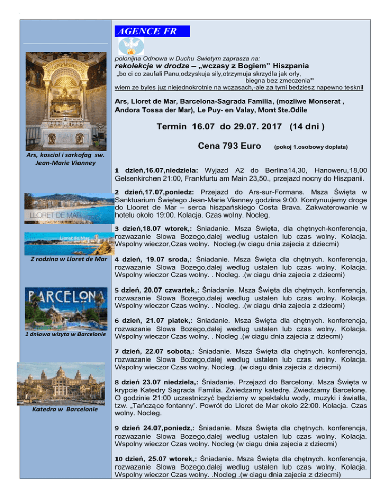 242+ AGENCE FR polonijna Odnowa w Duchu Swietym zaprasza na: rekolekcje w drodze – „wczasy z Bogiem” Hiszpania „bo ci co zaufali Panu,odzyskuja sily,otrzymuja skrzydla jak orly, biegna bez zmeczenia” wiem ze byles juz niejednokrotnie na wczasach,-ale za tymi bedziesz napewno tesknil Ars, Lloret de Mar, Barcelona-Sagrada Familia, (mozliwe Monserat , Andora Tossa der Mar), Le Puy- en Valay, Mont Ste.Odile Termin 16.07 do 29.07. 2017 (14 dni ) Cena 793 Euro (pokoj 1.osobowy doplata) Ars, kosciol i sarkofag sw. Jean-Marie Vianney 1 dzień,16.07,niedziela: Wyjazd A2 do Berlina14,30, Hanoweru,18,00 Gelsenkirchen 21:00, Frankfurtu am Main 23,50., przejazd nocny do Hiszpanii. 2 dzień,17.07,poniedz: Przejazd do Ars-sur-Formans. Msza Święta w Sanktuarium Świętego Jean-Marie Vianney godzina 9:00. Kontynuujemy droge do Llooret de Mar – serca hiszpańskiego Costa Brava. Zakwaterowanie w hotelu około 19:00. Kolacja. Czas wolny. Nocleg. 3 dzień,18.07 wtorek,: Śniadanie. Msza Święta, dla chętnych-konferencja, rozwazanie Slowa Bozego,dalej wedlug ustalen lub czas wolny. Kolacja. Wspolny wieczor,Czas wolny. Nocleg.(w ciagu dnia zajecia z dziecmi) Z rodzina w Lloret de Mar 4 dzień, 19.07 sroda,: Śniadanie. Msza Święta dla chętnych. konferencja, rozwazanie Slowa Bozego,dalej wedlug ustalen lub czas wolny. Kolacja. Wspolny wieczor Czas wolny. . Nocleg. .(w ciagu dnia zajecia z dziecmi) 5 dzień, 20.07 czwartek,: Śniadanie. Msza Święta dla chętnych. konferencja, rozwazanie Slowa Bozego,dalej wedlug ustalen lub czas wolny. Kolacja. Wspolny wieczor Czas wolny. . Nocleg. .(w ciagu dnia zajecia z dziecmi) 1 dniowa wizyta w Barcelonie 6 dzień, 21.07 piatek,: Śniadanie. Msza Święta dla chętnych. konferencja, rozwazanie Slowa Bozego,dalej wedlug ustalen lub czas wolny. Kolacja. Wspolny wieczor Czas wolny. . Nocleg .(w ciagu dnia zajecia z dziecmi) 7 dzień, 22.07 sobota,: Śniadanie. Msza Święta dla chętnych. konferencja, rozwazanie Slowa Bozego,dalej wedlug ustalen lub czas wolny. Kolacja. Wspolny wieczor Czas wolny. Nocleg. .(w ciagu dnia zajecia z dziecmi) Katedra w Barcelonie 8 dzień 23.07 niedziela,: Śniadanie. Przejazd do Barcelony. Msza Święta w krypcie Katedry Sagrada Familia. Zwiedzamy katedrę. Zwiedzamy Barcelonę. O godzinie 21:00 uczestniczyć będziemy w spektaklu wody, muzyki i światła, tzw. „Tańczące fontanny’. Powrót do Lloret de Mar około 22:00. Kolacja. Czas wolny. Nocleg. 9 dzień 24.07,poniedz,: Śniadanie. Msza Święta dla chętnych. konferencja, rozwazanie Slowa Bozego,dalej wedlug ustalen lub czas wolny. Kolacja. Wspolny wieczor Czas wolny. Nocleg (w ciagu dnia zajecia z dziecmi) 10 dzień, 25.07 wtorek,: Śniadanie. Msza Święta dla chętnych. konferencja, rozwazanie Slowa Bozego,dalej wedlug ustalen lub czas wolny. Kolacja. Wspolny wieczor Czas wolny. .Nocleg .(w ciagu dnia zajecia z dziecmi) 11 dzień, 26.07 sroda,: Śniadanie. Msza Święta dla chętnych. konferencja, rozwazanie Slowa Bozego,dalej wedlug ustalen lub czas wolny. Kolacja. Wspolny wieczor Czas wolny. . Nocleg .(w ciagu dnia zajecia z dziecmi) Le Puy-en-Velay Figura MB krolowej Francji 12 dzień, 27.07 czwartek,: Śniadanie. Msza Święta dla chętnych. konferencja, rozwazanie Slowa Bozego,dalej wedlug ustalen lub czas wolny. Kolacja. Wspolny wieczor Czas wolny. . Nocleg .(w ciagu dnia zajecia z dziecmi) 13 dzień, 28.07 piatek,: Śniadanie. Przejazd do Sanktuarium – Bazyliki Matki Bożej Królowej Francji w Le Puy-en-Velay. Spacer do dwóch Grot-Kaplic, położonych na wzgórzu wulkanicznym. Czas na zwiedzanie i modlitwę. Przejdziemy drogą procesji odbywających się tu 19 marca i 01 maja. Procesje odbywają się każdego roku do Sanktuarium Świętego Józefa dobrej Nadziei. Kolacja. 17:00. Msza Święta w Bazylice Świętego Józefa godzina 18:00. Czuwanie i Adoracja Najświętszego Sakramentu - Czas skupienia i modlitwy do godziny 22:00. Wyjazd w drogę powrotna do Niemiec około 22:00, przejazd przez Francje. Basilica sw.Jozefa dobrej nadzieji 14 dzień 29.07.17 sobota,: Po drodze zatrzymamy się w Alzackim Sanktuarium Świętej Odile (FR), Msza Święta. Przejazd przez Niemcy. Przejazd przez Frankfurt a M. . Planowany powrót do Gelsenkirchen około 16:00. Wczasy 13-dniowe w tym, 11–noclegów 11 śniadań, 12 obiadokolacji, woda i pieczywo do kolacji w cenie. Pozostałe napoje płatne dodatkowo. Hotel …. Wszystkie pokoje wyposażane w łazienkę, toaletę, telewizor, telefon, ręczniki i suszarkę. Noclegi w hotelach ****, pokoje 2-osobowe lub 3-osobowe. wliczone w cenę sa:.,opieka kaplana, opieka dla dzieci, opieka pilota, wycieczka do Barcelony, podatek klimatyczny Ubezpieczenie: koszty leczenia za granica 20 000,00 EUR , NNW 4.500 EUR Istnieje możliwość podpisania umowy ubezpieczeniowej od kosztów rezygnacji z wyjazdu (prosimy pytać), płatne dodatkowo Cena : 793,00 EUR od osoby dorosłej (pokoj 1 osob.220 Euro) Mont Ste.Odile Zniżki: (podamy za kilka dni) Dla dzieci do 3 lat xxxx :Dla dzieci do 11 lat :xxxx Za trzecią osobę w pokoju :xxx Za czwartą osobę w pokoju :xxx (Zniżki nie kompensują się ze sobą) Dla chętnych, za dodatkowa dopłatą (minimalna grupa 20 osób) : Stadion Camp Nou,Wieczór flamenco w Gran Casino Marineland – aqualand z delfinami,Wycieczka statkiem do Tossy de Mar Wycieczka do Monserrat i Andorry Gora sw. Odyli Organizatorem i odpowiedzialnym za wyjazd jest Agence FR, ,75001 Paris, France Dalsze informacje: Piotr Jessusek, tel. +49 172 7419570, E-mail : [email protected], zapisy na stronie: www.Odnowa.de Dalsze informacje : www.pielgrzymki-odnowy.de Wpłata przy zgloszeniu 50 % (do 14 dni od zapisu, reszta wpłaty do 30 dni przed wyjazdem. Konto: Verein EiHlG. IBAN:DE62 6047 0024 0020 040202 BIC DEUTDEDB604 dopisz: wczasy z Bogiem Agence FR |23, rue de RICHELIEU| 75001 Paris| France|