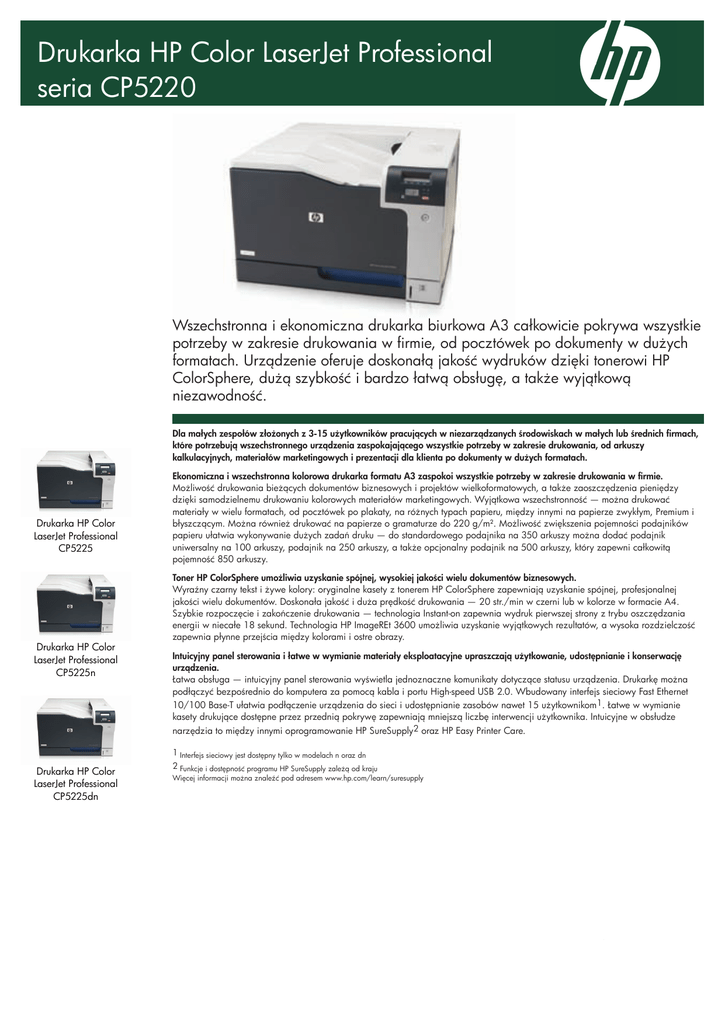 Drukarka HP Color LaserJet Professional seria CP5220 Wszechstronna i ekonomiczna drukarka biurkowa A3 całkowicie pokrywa wszystkie potrzeby w zakresie drukowania w firmie, od pocztówek po dokumenty w dużych formatach. Urządzenie oferuje doskonałą jakość wydruków dzięki tonerowi HP ColorSphere, dużą szybkość i bardzo łatwą obsługę, a także wyjątkową niezawodność. Dla małych zespołów złożonych z 3-15 użytkowników pracujących w niezarządzanych środowiskach w małych lub średnich firmach, które potrzebują wszechstronnego urządzenia zaspokajającego wszystkie potrzeby w zakresie drukowania, od arkuszy kalkulacyjnych, materiałów marketingowych i prezentacji dla klienta po dokumenty w dużych formatach. Drukarka HP Color LaserJet Professional CP5225 Drukarka HP Color LaserJet Professional CP5225n Ekonomiczna i wszechstronna kolorowa drukarka formatu A3 zaspokoi wszystkie potrzeby w zakresie drukowania w firmie. Możliwość drukowania bieżących dokumentów biznesowych i projektów wielkoformatowych, a także zaoszczędzenia pieniędzy dzięki samodzielnemu drukowaniu kolorowych materiałów marketingowych. Wyjątkowa wszechstronność — można drukować materiały w wielu formatach, od pocztówek po plakaty, na różnych typach papieru, między innymi na papierze zwykłym, Premium i błyszczącym. Można również drukować na papierze o gramaturze do 220 g/m². Możliwość zwiększenia pojemności podajników papieru ułatwia wykonywanie dużych zadań druku — do standardowego podajnika na 350 arkuszy można dodać podajnik uniwersalny na 100 arkuszy, podajnik na 250 arkuszy, a także opcjonalny podajnik na 500 arkuszy, który zapewni całkowitą pojemność 850 arkuszy. Toner HP ColorSphere umożliwia uzyskanie spójnej, wysokiej jakości wielu dokumentów biznesowych. Wyraźny czarny tekst i żywe kolory: oryginalne kasety z tonerem HP ColorSphere zapewniają uzyskanie spójnej, profesjonalnej jakości wielu dokumentów. Doskonała jakość i duża prędkość drukowania — 20 str./min w czerni lub w kolorze w formacie A4. Szybkie rozpoczęcie i zakończenie drukowania — technologia Instant-on zapewnia wydruk pierwszej strony z trybu oszczędzania energii w niecałe 18 sekund. Technologia HP ImageREt 3600 umożliwia uzyskanie wyjątkowych rezultatów, a wysoka rozdzielczość zapewnia płynne przejścia między kolorami i ostre obrazy. Intuicyjny panel sterowania i łatwe w wymianie materiały eksploatacyjne upraszczają użytkowanie, udostępnianie i konserwację urządzenia. Łatwa obsługa — intuicyjny panel sterowania wyświetla jednoznaczne komunikaty dotyczące statusu urządzenia. Drukarkę można podłączyć bezpośrednio do komputera za pomocą kabla i portu High-speed USB 2.0. Wbudowany interfejs sieciowy Fast Ethernet 10/100 Base-T ułatwia podłączenie urządzenia do sieci i udostępnianie zasobów nawet 15 użytkownikom1. Łatwe w wymianie kasety drukujące dostępne przez przednią pokrywę zapewniają mniejszą liczbę interwencji użytkownika. Intuicyjne w obsłudze narzędzia to między innymi oprogramowanie HP SureSupply2 oraz HP Easy Printer Care. 1 Interfejs sieciowy jest dostępny tylko w modelach n oraz dn Drukarka HP Color LaserJet Professional CP5225dn 2 Funkcje i dostępność programu HP SureSupply zależą od kraju Więcej informacji można znaleźć pod adresem www.hp.com/learn/suresupply Przegląd produktu Drukarka HP Color LaserJet Professional CP5225dn 1. Odbiornik na 250 arkuszy 2. Bezpośredni dostęp do łatwych w instalacji kaset z tonerem 3. Po d a j n i k 2 n a 250 a r ku sz y z sys t e m e m wspomagającym zamykanie 4. Intuicyjny panel sterowania z 2-wierszowym wyświetlaczem LCD 5. Podajnik uniwersalny na 100 ark. z listwą przedłużającą do papieru wstęgowego (długiego) obsługuje różne typy papierów specjalnych 6. Podświetlany włącznik na przedniej pokrywie 7. Pamięć 192 MB z możliwością rozbudowy do 448 MB oraz procesor 540 MHz 8. Wbudowany interfejs sieciowy Fast Ethernet 10/100 Base -T z obsługą IPv4/IPv6 umożliwia łatwe udostępnianie drukarki maksymalnie 15 osobom 9. Port USB 2.0 Hi-Speed do bezpośredniego połączenia z drukarką 10. Jednoprzebiegowy mechanizm druku zapewnia niezawodną, wysoką jakość druku 11. Wbudowany automatyczny druk dwustronny Krótka charakterystyka Drukarka HP Color LaserJet Professional CP5225 Drukarka HP Color LaserJet Professional CP5225n ● Prędkość drukowania do 20 str./min w czerni i w ● Jak w modelu podstawowym oraz wbudowany kolorze interfejs sieciowy Fast Ethernet 10/100 Base-T ● technologia ImageREt 3600 ● efektywna rozdzielczość wyjściowa 600 x 600 dpi ● 192 MB pamięci z możliwością rozszerzenia do 448 MB za pośrednictwem wolnego gniazda DDR2 DIMM ● procesor 540 MHz ● standardowa pojemność podajników 350 arkuszy oraz jeden podajnik uniwersalny na 100 arkuszy (nr 1) ● podajnik na 250 arkuszy (nr 2) oraz opcjonalny podajnik na 500 arkuszy (nr 3) Drukarka HP Color LaserJet Professional CP5225dn ● Jak w modelu podstawowym oraz moduł automatycznego druku dwustronnego i wbudowany interfejs sieciowy Fast Ethernet 10/100 Base-T Zalecane akcesoria CE860A Podajnik papieru na 500 arkuszy dla drukarek HP Color Laserjet Łatwy do zainstalowania podajnik papieru zwiększa wydajność pracy i umożliwia drukowanie większej liczby stron bez konieczności ponownego ładowania papieru. Pozwala również załadować dwa różne rodzaje papieru jednocześnie. CB421A Pamięć HP DDR2 64 MB (144-pinowy moduł DIMM) Dodatkowe moduły pamięci HP usprawniają przepływ danych, co zwiększa wydajność druku złożonych dokumentów. CB422A Pamięć HP DDR2 128 MB (144-pinowy moduł DIMM) Dodatkowe moduły pamięci HP usprawniają przepływ danych, co zwiększa wydajność druku złożonych dokumentów. CB423A Pamięć HP DDR2 256 MB (144-pinowy moduł DIMM) Dodatkowe moduły pamięci HP usprawniają przepływ danych, co zwięk