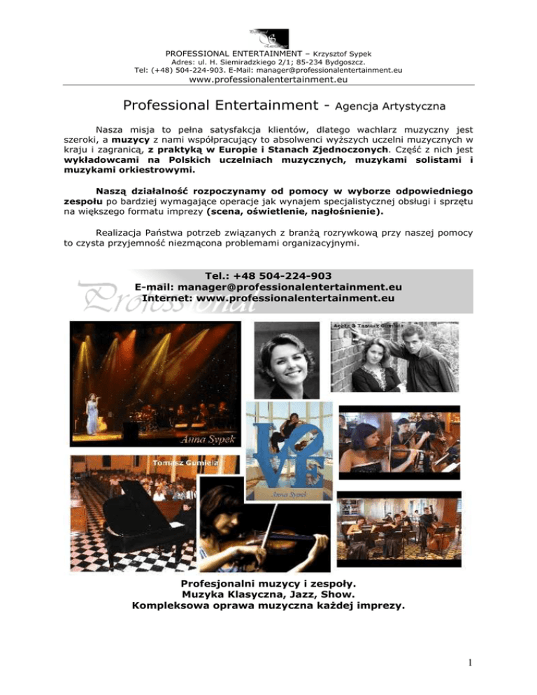 PROFESSIONAL ENTERTAINMENT – Krzysztof Sypek Adres: ul. H. Siemiradzkiego 2/1; 85-234 Bydgoszcz. Tel: (+48) 504-224-903. E-Mail: [email protected] www.professionalentertainment.eu Professional Entertainment - Agencja Artystyczna Nasza misja to pełna satysfakcja klientów, dlatego wachlarz muzyczny jest szeroki, a muzycy z nami współpracujący to absolwenci wyższych uczelni muzycznych w kraju i zagranicą, z praktyką w Europie i Stanach Zjednoczonych. Część z nich jest wykładowcami na Polskich uczelniach muzycznych, muzykami solistami i muzykami orkiestrowymi. Naszą działalność rozpoczynamy od pomocy w wyborze odpowiedniego zespołu po bardziej wymagające operacje jak wynajem specjalistycznej obsługi i sprzętu na większego formatu imprezy (scena, oświetlenie, nagłośnienie). Realizacja Państwa potrzeb związanych z branżą rozrywkową przy naszej pomocy to czysta przyjemność niezmącona problemami organizacyjnymi. Tel.: +48 504-224-903 E-mail: [email protected] Internet: www.professionalentertainment.eu Profesjonalni muzycy i zespoły. Muzyka Klasyczna, Jazz, Show. Kompleksowa oprawa muzyczna każdej imprezy. 1 PROFESSIONAL ENTERTAINMENT – Krzysztof Sypek Adres: ul. H. Siemiradzkiego 2/1; 85-234 Bydgoszcz. Tel: (+48) 504-224-903. E-Mail: [email protected] www.professionalentertainment.eu Wykaz zespołów wraz z opisem i cennikiem Wszyscy muzycy niżej wymienionych zespołów są magistrami sztuki o specjalności solista oraz kameralista, absolwentami Akademii Muzycznych w Polsce oraz w innych krajach Europejskich. Doświadczenie zdobywali podczas koncertów na scenach Europy i Stanów Zjednoczonych. Poniższa oferta agencji to tylko część propozycji, którymi dysponujemy. Jeśli nie znaleźliście Państwo odpowiedniego zespołu, proszę o kontakt w celu wyboru innej formacji z naszej bogatej oferty. Szczegóły oraz DEMO VIDEO poszczególnych zespołów na stronie internetowej w zakładce ARTYŚCI. LP Nazwa 1 “Anna Sypek – violin virtuoso show” 2 „Pro Baroque Orchestra” Skład zespołu Skrzypaczka i Big Band (minimum 7 osób) 15 osobowa orkiestra smyczkowa z solistą. Skrzypce, Skrzypce, Fortepian, Kontrabas 3 „4 Sound Quartet” 4 „Classical Quartet” Skrzypce, Skrzypce, Altówka, Wiolonczela. 5 “Seminote Duo” Skrzypce, Fortepian. 6 “Tomasz Gumiela – classical pianist” Fortepian “Agata Gumiela – classical pianist” Fortepian 7 „Solo violin” Skrzypce solo 8 „Solo Opera” Wokalista 9 „Agata & Tomasz Gumiela” 10 „Pro Jazz Quartet” 11 “ Unforgettable trio” 12 “ Jazz Trio” 13 „Bossa Nova Duo” Duet pianistów Saksofon,Fortepian, Kontrabas, Inst. perkusyjne. Skrzypce, Fortepian, Kontrabas Fortepian, Kontrabas, Instrumenty perkusyjne. Fortepian, kontrabas Rodzaj wykonywanej muzyki Czas Show w stylu amerykańskich pops concerts łączący muzykę klasyczną z popularną w aranżacjach na skrzypce i big band. Doskonały dla uświetnienia imprez większego formatu. Repertuar obejmuje muzykę baroku i współczesne kompozycje. Orkiestra smyczkowa na regularne koncerty jak i dla wyszukanej prywatnej klienteli dla uświetnienia każdego rodzaju przedsięwzięcia. Muzyka klasyczna i popularna. Tematy filmowe i hity muzyki rozrywkowej. Doskonały na koncerty na scenie i na mniejsze sale (restauracje, kluby, uroczyste otwarcia). Zróżnicowana muzyka od J.S. Bacha do współczesnych hitów muzyki rozrywkowej w aranżacji na klasyczny kwartet smyczkowy. Doskonały do uświetnienia wszelkiego rodzaju imprez, które chcą podkreślić elegancję i klasyczny styl. Wysokiej klasy koncerty muzyki klasycznej. Pianista mający w swoim repertuarze najwyższej jakości muzykę klasyczną i lekką muzykę rozrywkową. Koncerty klasyczne oraz wszelkiego rodzaju uroczyste imprezy. Pianistka mająca w swoim repertuarze najwyższej jakości muzykę klasyczną. Koncerty klasyczne oraz wszelkiego rodzaju uroczyste imprezy. Skrzypaczka dla uświetnienia imprez okolicznościowych. Muzyka klasyczna i rozrywkowa. Największe arie operowe w wykonaniu solisty Opery. Dwoje wysokiej klasy pianistów oferujących koncert z aranżacjami muzyki klasycznej i rozrywkowej na cztery ręce oraz solowe utwory każdego z nich. Elegancki jazz w wyszukanej formie. Doskonały w klubach, na uroczyste otwarcia i regularne koncerty. 50 min Cena netto 6000 zł 1,5 h 10 000zł 45 min 1400 zł 1h 1400 zł 45 min 1100 zł 1h 650 zł 1h 650 zł 45 min 500 zł 40 min 650 zł 45 min 1200 zł 1h 1400 zł Szeroki wachlarz repertuaru. Od muzyki klasycznej do współczesnej muzyki rozrywkowej w eleganckiej i spokojnej formie. Elegancki jazz w wyszukanej formie. Doskonały w klubach, na uroczyste otwarcia i regularne koncerty do stworzenia klimatu klubu jazzowego. 1h 1100 zł 1h 1100 zł Muzyka jazzowa na wszelkiego rodzaju imprezy. 1h 1000 zł 2