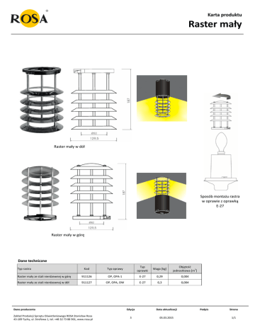 Karta produktu Raster mały Raster mały w dół Sposób montażu rastra w oprawie z oprawką E-27 Raster mały w górę Dane techniczne Kod Typ oprawy Typ oprawki Waga [kg] Objętość jednostkowa [m3] Raster mały ze stali nierdzewnej w górę 911126 OP, OPA-1 E-27 0,29 0,004 Raster mały ze stali nierdzewnej w dół 911127 OP, OPA, OW E-27 0,3 0,004 Typ rastra Dane producenta Zakład Produkcji Sprzętu Oświetleniowego ROSA Stanisław Rosa 43-109 Tychy, ul. Strefowa 1, tel. +48 32 73 88 901, www.rosa.pl Edycja Data aktualizacji 3 05.03.2015 Podpis Strona 1/1