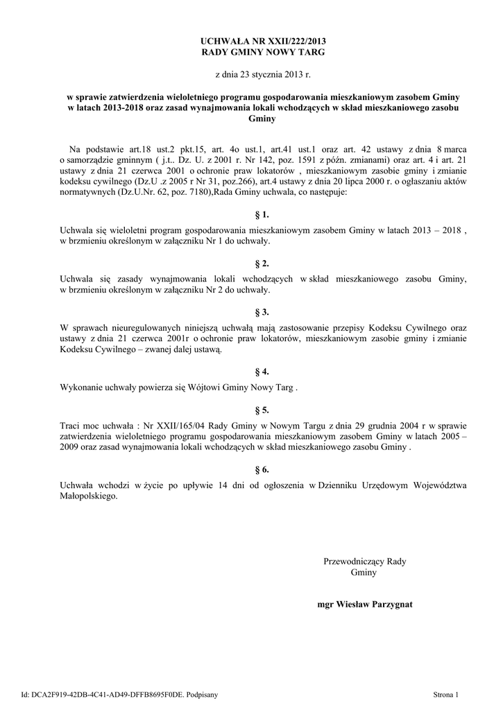 UCHWAŁA NR XXII/222/2013 RADY GMINY NOWY TARG z dnia 23 stycznia 2013 r. w sprawie zatwierdzenia wieloletniego programu gospodarowania mieszkaniowym zasobem Gminy w latach 2013-2018 oraz zasad wynajmowania lokali wchodzących w skład mieszkaniowego zasobu Gminy Na podstawie art.18 ust.2 pkt.15, art. 4o ust.1, art.41 ust.1 oraz art. 42 ustawy z dnia 8 marca o samorządzie gminnym ( j.t.. Dz. U. z 2001 r. Nr 142, poz. 1591 z późn. zmianami) oraz art. 4 i art. 21 ustawy z dnia 21 czerwca 2001 o ochronie praw lokatorów , mieszkaniowym zasobie gminy i zmianie kodeksu cywilnego (Dz.U .z 2005 r Nr 31, poz.266), art.4 ustawy z dnia 20 lipca 2000 r. o ogłaszaniu aktów normatywnych (Dz.U.Nr. 62, poz. 7180),Rada Gminy uchwala, co następuje: § 1. Uchwala się wieloletni program gospodarowania mieszkaniowym zasobem Gminy w latach 2013 – 2018 , w brzmieniu określonym w załączniku Nr 1 do uchwały. § 2. Uchwala się zasady wynajmowania lokali wchodzących w skład mieszkaniowego zasobu Gminy, w brzmieniu określonym w załączniku Nr 2 do uchwały. § 3. W sprawach nieuregulowanych niniejszą uchwałą mają zastosowanie przepisy Kodeksu Cywilnego oraz ustawy z dnia 21 czerwca 2001r o ochronie praw lokatorów, mieszkaniowym zasobie gminy i zmianie Kodeksu Cywilnego – zwanej dalej ustawą. § 4. Wykonanie uchwały powierza się Wójtowi Gminy Nowy Targ . § 5. Traci moc uchwała : Nr XXII/165/04 Rady Gminy w Nowym Targu z dnia 29 grudnia 2004 r w sprawie zatwierdzenia wieloletniego programu gospodarowania mieszkaniowym zasobem Gminy w latach 2005 – 2009 oraz zasad wynajmowania lokali wchodzących w skład mieszkaniowego zasobu Gminy . § 6. Uchwała wchodzi w życie po upływie 14 dni od ogłoszenia w Dzienniku Urzędowym Województwa Małopolskiego. Przewodniczący Rady Gminy mgr Wiesław Parzygnat Id: DCA2F919-42DB-4C41-AD49-DFFB8695F0DE. Podpisany Strona 1 Załącznik Nr 1 do Uchwały nr XII/222/2013 Rady Gminy Nowy Targ z dnia 23 stycznia 2013 r. PROGRAM GOSPODAROWANIA MIESZKANIOWYM ZASOBEM GMINY w latach 2013 – 2018 Stan mieszkaniowego zasobu Gminy Nowy Targ § 1. Mieszkaniowy zasób Gminy tworzą lokale mieszkalne : 1. w miejscowości Dursztyn: - 1 mieszkanie w budynku Szkoły Podstawowej 2. w miejscowosci Gronków: - 1 mieszkanie w Zespole Szkoły Podstawowej i Gimnazjum 1. w miejscowości Klikuszowa: - 1 mieszkanie w Gimnazjum 2. w miejscowości Krauszów: - 1 mieszkanie w Szkole Podstawowej 3. w miejscowości Krempachy: - 2 mieszkania w Gimnazjum 4. w miejscowości Ludźmierz: - 1 mieszkanie w Szkole Podstawowej - 4 mieszkania w Niepublicznym Zakładzie Opieki Zdrowotnej 7. w miejscowości Łopuszna: - 2 mieszkania w budynku przy ulicy Mickiewicza 2 5. w miejscowości Nowa Biała: - 1 mieszkania w Szkole Podstawowej 6. w miejscowości Ostrowsko: - 1 mieszkanie w Szkole Podstawowej 7. w miejscowości Pyzówka: - 1 mieszkanie w Szkole Podstawowej 8. w miejscowości Rogoźnik: - 4 mieszkania w Szkole Podstawowej W/w mieszkania są wyposażone w c.o. oraz instalację wodno – kanalizacyjną . 9. w miejscowości Nowa Biała: - 1 kontener mieszkalny wyposażony w instalację wodno-kanalizacyjną. W mieszkaniowym zasobie gminy Nowy Targ w miejscowości Nowa Biała znajduje się kontener mieszkalny wynajmowany na cele socjalne . Id: DCA2F919-42DB-4C41-AD49-DFFB8695F0DE. Podpisany Strona 1 Lokale mieszkalne wymienione w § 1 ust. 1 pkt 1;pkt 2; pkt 3; pkt 4; pkt 5;pkt 6 lit. a; pkt 8; pkt 9; pkt 10; pkt 11 przeznaczone są dowynajmowania na czas trwania stosunku pracy w placówkach oświatowych Gminy Nowy Targ . Prognoza wielkości zasobu mieszkaniowego i planowane sprzedaże lokali w latach 2013 – 2018 : § 2. W okresie 2013- 2018 nie przewiduje się budowy nowych mieszkań a jedynie utrzymanie istniejących w należytym stanie technicznym. Prognozuje się zakup kontenerów mieszkalnych na cele socjalne. § 3. W roku 2013 roku planuje się sprzedaż lokali mieszkalnych będących w zasobie w miejscowości Łopuszna . § 4. Plan remontów i modernizacji budynków i lokali w latach 2013- 2018 roku Lp Lokalizacja mieszkań lata 2013 2014 1 1 mieszkanie w Szkole Podstawowej w Dursztynie 2 1 mieszkanie w Zespole Szkoły Podstawowej i Gimnazjum w Gronkowie Remont instalacji wod-kan, i posadzek 3 1 mieszkanie w Szkole Podstawowej w Krauszowie Remont instalacji wod-kan, i posadzek 4 2 mieszkania w Gimnazjum w Krempachach 5 1 mieszkanie w budynku przy Szkole Podstawowej w Ludźmierzu 6 1 mieszkanie w budynku przy Szkole Podstawowej w Nowej Białej 7 1 mieszkanie w Szkole Podstawowej w Ostrowsku 8 2 mieszkania w Szkole Podstawowej w Pyzówce 9 4 mieszkania w Szkole Podstawowej w Rogoźniku 10 1 mieszkanie w Gimnazjum w Klikuszowej 11 2 mieszkania w budynku byłego posterunku policji w Łopusznej 12 3 mieszkania w budynku Ośrodka Zdrowia w Ludźmierzu 2015 2016 2017 2018 Wymiana stolarki drzwiowej, remont posadzek, malowanie Wymiana stolarki okiennej, remont posadzek, malowanie Wymiana stolarki okiennej, remont posadzek, malowanie Wymiana stolarki okiennej i drzwiowej Remont instalacji wod-kan,, posadzek i malowanie Remont instalacji wod-kan,i posadzek Wymiana stolarki drzwiowej Remont posadzek, malowanie Wymiana stolarki okiennej i drzwiowej, remont instalacji wod-kan,i posadzek § 5. Zakłada się systematyczną poprawę stanu technicznego zasobu mieszkaniowego Gminy poprzez remonty mieszkań , remonty pokryć dachowych, wyminę okien, ocieplanie itp. Nadzór nad eksploatacją, remontami i modernizacją sprawuje Wójt Gminy poprzez Wydział Gospodarki Przestrzennej, Inwestycji i Ochrony Środowiska. Zasady polityki czynszowej i warunki obniżki czynszu § 6. 1. Stawkę czynszu za 1 m2 powierzchni użytkowej lokali ustala Wójt Gminy na poziomie 1,44% wartości wskaźnika przeliczeniowego kosztu odtworzenia 1 m2 powierzchni użytkowej budynków mieszkalnych w stosunku rocznym , ogłoszonym przez Wojewodę Małopolskiego. 2. Czynsz obejmuje : podatek od nieruchomości, koszty administrowa