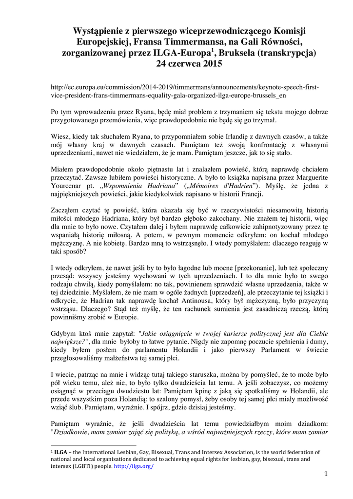 Wystąpienie z pierwszego wiceprzewodniczącego Komisji Europejskiej, Fransa Timmermansa, na Gali Równości, zorganizowanej przez ILGA-Europa1, Bruksela (transkrypcja) 24 czerwca 2015 http://ec.europa.eu/commission/2014-2019/timmermans/announcements/keynote-speech-firstvice-president-frans-timmermans-equality-gala-organized-ilga-europe-brussels_en Po tym wprowadzeniu przez Ryana, będę miał problem z trzymaniem się tekstu mojego dobrze przygotowanego przemówienia, więc prawdopodobnie nie będę się go trzymał. Wiesz, kiedy tak słuchałem Ryana, to przypomniałem sobie Irlandię z dawnych czasów, a także mój własny kraj w dawnych czasach. Pamiętam też swoją konfrontację z własnymi uprzedzeniami, nawet nie wiedziałem, że je mam. Pamiętam jeszcze, jak to się stało. Miałem prawdopodobnie około piętnastu lat i znalazłem powieść, którą naprawdę chciałem przeczytać. Zawsze lubiłem powieści historyczne. A było to książka napisana przez Marguerite Yourcenar pt. „Wspomnienia Hadriana” („Mémoires d'Hadrien”). Myślę, że jedna z najpiękniejszych powieści, jakie kiedykolwiek napisano w historii Francji. Zacząłem czytać tę powieść, która okazała się być w rzeczywistości niesamowitą historią miłości młodego Hadriana, który był bardzo głęboko zakochany. Nie znałem tej historii, więc dla mnie to było nowe. Czytałem dalej i byłem naprawdę całkowicie zahipnotyzowany przez tę wspaniałą historię miłosną. A potem, w pewnym momencie odkryłem: on kochał młodego mężczyznę. A nie kobietę. Bardzo mną to wstrząsnęło. I wtedy pomyślałem: dlaczego reaguję w taki sposób? I wtedy odkryłem, że nawet jeśli by to było łagodne lub mocne [przekonanie], lub też społeczny przesąd: wszyscy jesteśmy wychowani w tych uprzedzeniach. I to dla mnie było to swego rodzaju chwilą, kiedy pomyślałem: no tak, powinienem sprawdzić własne uprzedzenia, także w tej dziedzinie. Myślałem, że nie mam w ogóle żadnych [uprzedzeń], ale przeczytanie tej książki i odkrycie, że Hadrian tak naprawdę kochał Antinousa, który był mężczyzną, było przyczyną wstrząsu. Dlaczego? Stąd też myślę, że ten rachunek sumienia jest zasadniczą rzeczą, którą powinniśmy zrobić w Europie. Gdybym ktoś mnie zapytał: "Jakie osiągnięcie w twojej karierze politycznej jest dla Ciebie największe?", dla mnie byłoby to łatwe pytanie. Nigdy nie zapomnę poczucie spełnienia i dumy, kiedy byłem posłem do parlamentu Holandii i jako pierwszy Parlament w świecie przegłosowaliśmy małżeństwa tej samej płci. I wiecie, patrząc na mnie i widząc tutaj takiego staruszka, można by pomyśleć, że to może było pół wieku temu, ależ nie, to było tylko dwadzieścia lat temu. A jeśli zobaczysz, co możemy osiągnąć w przeciągu dwudziestu lat: Pamiętam kpinę z jaką się spotkaliśmy w Holandii, ale przede wszystkim poza Holandią: to szalony pomysł, żeby osoby tej samej płci miały możliwość wziąć ślub. Pamiętam, wyraźnie. I spójrz, gdzie dzisiaj jesteśmy. Pamiętam wyraźnie, że jeśli dwadzieścia lat temu powiedziałbym moim dziadkom: "Dziadkowie, mam zamiar zająć się polityką, a wśród najważniejszych rzeczy, które mam zamiar 1 ILGA – the International Lesbian, Gay, Bisexual, Trans and Intersex Association, is the world federation of national and local organisations dedicated to achieving equal rights for lesbian, gay, bisexual, trans and intersex (LGBTI) people. http://ilga.org/ 1 niezwłocznie zrobić, to ukazać, że osoby tej samej płci, które się kochają, mogą zawrzeć małżeństwo". Prawdopodobnie wezwaliby naszego lekarza ogólnego, żeby mnie wysłał do szpitala dla chorych umysłowo. Tak bardzo przekraczało to ich wyobraźnię. Gdybym miał rozmawiać o tym dzisiaj z moimi dziećmi, nie mogłyby sobie one nawet wyobrazić społeczeństwa, w którym nie byłoby dla ludzi, którzy kochają siebie, równości wobec prawa, niezależnie od tego, czy są innej płci czy też tej samej płci. To jest przemiana jaką przeszło moje społeczeństwo. Więc takie jest moje przesłanie do was, i jest to ważne przesłanie: spójrzcie na te wszystkie społeczeństwa europejskie, które przeszły tę transformację. W rzeczy samej, naprawdę bardzo, bardzo szybko. Irlandia jest tego przykładem. Ale spójrzcie co się wydarzyło w kraju takim jak Hiszpania. Spójrzcie na kraj taki, jak Polska, która dla wielu ludzi jeszcze kilka lat temu była daleko poza nadzieją na wybawienie ze względu na odwieczne prześladowanie przez Kościół Katolicki. Dokonała się ogromna przemiana w tym społeczeństwie. Widzieliśmy ogromne zmiany. A to się działo w całej Europie. Ale to nie jest tylko dobra wiadomość. Widzieliśmy również inną ewolucję. Widzieliśmy również, że nadal można manipulować ludźmi by byli homofobiczni. Żyłem w Rosji przez kilka lat, w czasie, gdy homoseksualizm był traktowany tak, jak to było za czasów moich dziadków. Tak naprawdę nie przeszkadza ci to, jak długo się o tym nie mówi. Pojawiają się żarty. Znacie wszystkie te kawały, jesteście ekspertami od żartów. Nie będzie otwartej homofobii. I widzieliśmy, że poprzez polityczną, ale muszę powiedzieć, że także przez religijną manipulację, jest teraz homofobia. I stała się ona widoczna na ulicach. Stała się czymś, co skrajnie prawicowym gangom wydaje się obowiązkiem do spełnienia, bo mają błogosławieństwo kościoła lub błogosławieństwo swojego przywódcy. Otóż to nie jest śledzone. A nie jest to śledzone, bo po prostu nie ma zmian w kierunku lepszej sytuacji. A nawet - muszę powiedzieć jest jeszcze możliwość regresu we wszystkich naszych społeczeństwach. Tak więc pierwszą rzeczą, którą musisz zrobić, to być niezwykle czujni. Nie możemy sobie pozwolić na samozadowolenie. Nie możemy. I myślę, że wszystkim nam się to może zdarzyć i że czasami tacy jes
