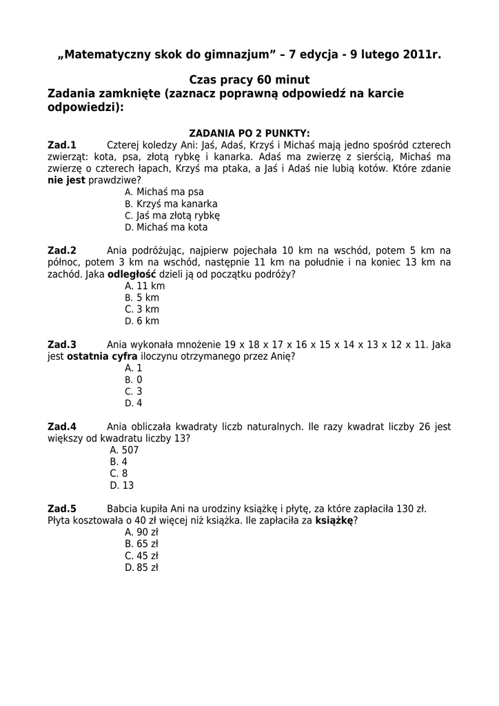 „Matematyczny skok do gimnazjum” – 7 edycja - 9 lutego 2011r. Czas pracy 60 minut Zadania zamknięte (zaznacz poprawną odpowiedź na karcie odpowiedzi): ZADANIA PO 2 PUNKTY: Zad.1 Czterej koledzy Ani: Jaś, Adaś, Krzyś i Michaś mają jedno spośród czterech zwierząt: kota, psa, złotą rybkę i kanarka. Adaś ma zwierzę z sierścią, Michaś ma zwierzę o czterech łapach, Krzyś ma ptaka, a Jaś i Adaś nie lubią kotów. Które zdanie nie jest prawdziwe? A. Michaś ma psa B. Krzyś ma kanarka C. Jaś ma złotą rybkę D. Michaś ma kota Zad.2 Ania podróżując, najpierw pojechała 10 km na wschód, potem 5 km na północ, potem 3 km na wschód, następnie 11 km na południe i na koniec 13 km na zachód. Jaka odległość dzieli ją od początku podróży? A. 11 km B. 5 km C. 3 km D. 6 km Zad.3 Ania wykonała mnożenie 19 x 18 x 17 x 16 x 15 x 14 x 13 x 12 x 11. Jaka jest ostatnia cyfra iloczynu otrzymanego przez Anię? A. 1 B. 0 C. 3 D. 4 Zad.4 Ania obliczała kwadraty liczb naturalnych. Ile razy kwadrat liczby 26 jest większy od kwadratu liczby 13? A. 507 B. 4 C. 8 D. 13 Zad.5 Babcia kupiła Ani na urodziny książkę i płytę, za które zapłaciła 130 zł. Płyta kosztowała o 40 zł więcej niż książka. Ile zapłaciła za książkę? A. 90 zł B. 65 zł C. 45 zł D. 85 zł Zad.6 W sześciokącie foremnym Ania narysowała dwie linie symetrii, jak na rysunku. Jaki procent sześciokąta został zamalowany przez Anię? A. B. C. D. 5 45 % 6 2 41 % 3 1 33 % 3 37,5% Zad.7 W szkole Ani remontowana jest sala gimnastyczna. Ile metrów kwadratowych wykładziny trzeba kupić, aby pokryć nią podłogę tej sali w kształcie 1 prostokąta o bokach 12 m i 15,5m? 2 A. 192,75m2 B. 193,25m2 C. 180,25m2 D.193,75m2 Zad.8 Ania narysowała czworokąt z przekątnymi. Ile trójkątów widzisz na rysunku Ani? A. 8 B. 10 C. 4 D. 6 Zadania otwarte (zapisz wszystkie obliczenia): ZADANIA PO 5 PUNKTÓW: Zad.9 Ania narysowała trapez równoramienny, w którym dwusieczne kątów ostrych wyznaczają na krótszej podstawie punkt będący jej środkiem. Wykaż, że kąt utworzony przez dwusieczne jest przystający do kąta trapezu przy krótszej podstawie. Skonstruuj trapez taki jak Ania. Zad.10 W bibliotece szkoły do której uczęszcza Ania jest 10000 książek. Uczniowie klasy 6a (klasa Ani) w ciągu roku przeczytali 6% wszystkich książek, a uczniowie klasy 6b - 0,085 pozostałych i 10 książek. Ilu uczniów jest w klasie Ani, jeżeli wiadomo, że średnia przeczytanych książek na jednego ucznia tej klasy wynosi 24 książki?