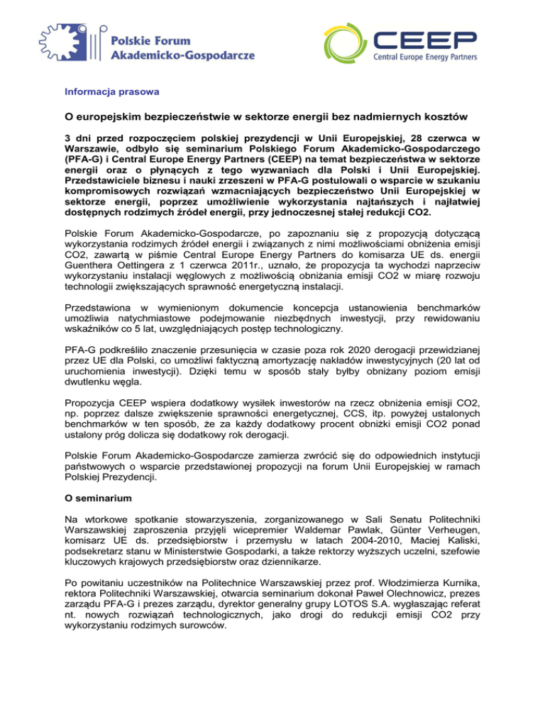 Informacja prasowa O europejskim bezpieczeństwie w sektorze energii bez nadmiernych kosztów 3 dni przed rozpoczęciem polskiej prezydencji w Unii Europejskiej, 28 czerwca w Warszawie, odbyło się seminarium Polskiego Forum Akademicko-Gospodarczego (PFA-G) i Central Europe Energy Partners (CEEP) na temat bezpieczeństwa w sektorze energii oraz o płynących z tego wyzwaniach dla Polski i Unii Europejskiej. Przedstawiciele biznesu i nauki zrzeszeni w PFA-G postulowali o wsparcie w szukaniu kompromisowych rozwiązań wzmacniających bezpieczeństwo Unii Europejskiej w sektorze energii, poprzez umożliwienie wykorzystania najtańszych i najłatwiej dostępnych rodzimych źródeł energii, przy jednoczesnej stałej redukcji CO2. Polskie Forum Akademicko-Gospodarcze, po zapoznaniu się z propozycją dotyczącą wykorzystania rodzimych źródeł energii i związanych z nimi możliwościami obniżenia emisji CO2, zawartą w piśmie Central Europe Energy Partners do komisarza UE ds. energii Guenthera Oettingera z 1 czerwca 2011r., uznało, że propozycja ta wychodzi naprzeciw wykorzystaniu instalacji węglowych z możliwością obniżania emisji CO2 w miarę rozwoju technologii zwiększających sprawność energetyczną instalacji. Przedstawiona w wymienionym dokumencie koncepcja ustanowienia benchmarków umożliwia natychmiastowe podejmowanie niezbędnych inwestycji, przy rewidowaniu wskaźników co 5 lat, uwzględniających postęp technologiczny. PFA-G podkreśliło znaczenie przesunięcia w czasie poza rok 2020 derogacji przewidzianej przez UE dla Polski, co umożliwi faktyczną amortyzację nakładów inwestycyjnych (20 lat od uruchomienia inwestycji). Dzięki temu w sposób stały byłby obniżany poziom emisji dwutlenku węgla. Propozycja CEEP wspiera dodatkowy wysiłek inwestorów na rzecz obniżenia emisji CO2, np. poprzez dalsze zwiększenie sprawności energetycznej, CCS, itp. powyżej ustalonych benchmarków w ten sposób, że za każdy dodatkowy procent obniżki emisji CO2 ponad ustalony próg dolicza się dodatkowy rok derogacji. Polskie Forum Akademicko-Gospodarcze zamierza zwrócić się do odpowiednich instytucji państwowych o wsparcie przedstawionej propozycji na forum Unii Europejskiej w ramach Polskiej Prezydencji. O seminarium Na wtorkowe spotkanie stowarzyszenia, zorganizowanego w Sali Senatu Politechniki Warszawskiej zaproszenia przyjęli wicepremier Waldemar Pawlak, Günter Verheugen, komisarz UE ds. przedsiębiorstw i przemysłu w latach 2004-2010, Maciej Kaliski, podsekretarz stanu w Ministerstwie Gospodarki, a także rektorzy wyższych uczelni, szefowie kluczowych krajowych przedsiębiorstw oraz dziennikarze. Po powitaniu uczestników na Politechnice Warszawskiej przez prof. Włodzimierza Kurnika, rektora Politechniki Warszawskiej, otwarcia seminarium dokonał Paweł Olechnowicz, prezes zarządu PFA-G i prezes zarządu, dyrektor generalny grupy LOTOS S.A. wygłaszając referat nt. nowych rozwiązań technologicznych, jako drogi do redukcji emisji CO2 przy wykorzystaniu rodzimych surowców. Wśród zagadnień dotyczących bezpieczeństwa energetycznego nie zabrakło prezentacji Roberta Soszyńskiego, prezesa zarządu PERN „Przyjaźń” S.A. na temat projektu rozwoju kawern solnych (na gaz, ropę i paliwa). List intencyjny w tej sprawie podpisały w czerwcu właśnie PERN oraz Grupa LOTOS. Miejsce energetyki jądrowej w bilansie energetycznym świata to tytuł ostatniego referatu prof. Romana Domańskiego, dyrektora Uczelnianego Centrum Badawczego Zrównoważonych Systemów Energetycznych Politechniki Warszawskiej. Równie ważny w dyskusji był głos Piotra Pieli, partnera Ernst & Young, który mówił o bilansie otwarcia sektora energii Europy Centralnej jego perspektywach rozwoju i możliwości współpracy w regionie. Natomiast Günter Verheugen przedstawił opinię o miejscu i roli krajów Europy Centralnej (EU 10) w strategii i polityce UE do roku 2050. Komisarz powiedział, żę zapotrzebowanie na energię będzie rosło, dlatego wymagane są inwestycje w ten sektor gospodarki. Energia jest kluczem do wzrostu gospodarczego, a skoro Unia Europejska nie jest monoblokiem, lecz społecznością wielu narodów i punktów widzenia, powinna rozmawiać o wielu możliwych kierunkach rozwoju na Starym Kontynencie. Unia Europejska powinna zmienić swoją jednoogniskowe spojrzenie na wspólne sprawy i wykorzystywać argumenty przedstawiane w Europie Centralnej. Prawidłowo zdefiniowana i koordynowana polityka podczas prezydencji polskiej może przynieść istotny impuls dla całej europejskiej społeczności. Ostatni gość seminarium – Maciej Kaliski, dokonał podsumowania spotkania. Minister podkreślił możliwe zagrożenia dla europejskiego systemu bezpieczeństwa w sektorze energii: ideologiczną niechęć do energetyki węglowej i jądrowej, brak entuzjazmu dla gazu łupkowego oraz wybór OZE, które są 3-krotnie droższe od konwencjonalnych źródeł energii. Coraz większe uzależnienie od eksportu energii. Przed Unią Europejską, wg ministra krystalizują się dwa odmienne scenariusze – załamanie energetyki albo derogacja i skorzystanie z przemyśleń i doświadczeń Nowej Europy, które jest szansą na zmianę kierunku polityki. Podczas przemówienia minister zwrócił uwagę na trzy prioryety w prezydencji europejskiej: polityka zewnętrza energii, wewnętrzy rynek energii i efektywność energetyczna. Polski rząd będzie myśleć o całej Unii, zgodnie z zasadą prezentowanej solidarności. Warto wspomnieć, że seminarium PFA-G na Politechnice Warszawskiej było już czwartym z rzędu, jakie zorganizowano podczas niecałych dwóch lat od objęcia przez Pawła Olechnowicza, stanowiska prezesa zarządu stowarzyszenia. PFA-G Polskie Forum Akademicko-Gospodarcze zostało założone w 1992 roku i jest stowarzyszeniem budującym współpracę między środowiskiem akademickim i gospodarczym. Przez 19 lat działań, Forum stało się płaszczyzną dialogu 