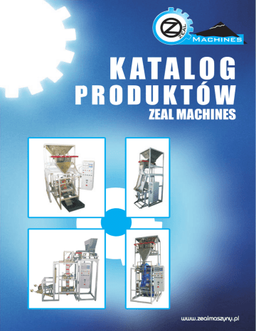 z Machines K ATA L O G PRODUKTÓW ZEAL MACHINES www.zealmaszyny.pl Drogi Przedsiêbiorco, Jesteœmy grup¹ Przyjació³, razem z Tob¹, maj¹cych do zaspokojenia konkretn¹ potrzebê. Wszyscy mamy firmy, produkuj¹ce pewne wyroby, które nastêpnie musimy zapakowaæ. Jednoczeœnie wiemy, ¿e s¹ to dzie³a z których jesteœmy bardzo dumni, poniewa¿ w ich powstanie w³o¿yliœmy wiele pracy, zaanga¿owania i serca. Nas wszystkich ³¹czy jedna potrzeba – towary musz¹ zostaæ godnie opakowane, a przy tym szybko oraz solidnie. Dlatego spotkaliœmy siê i za³o¿yliœmy ZEAL – MASZYNY. Oferta naszej firmy obejmuje sprzeda¿ nowoczesnych i solidnych maszyn pakuj¹cych, których nabycie mo¿liwe jest równie¿ na zasadzie atrakcyjnego leasingu. Pozostajemy w œcis³ej wspó³pracy z producentami maszyn, co pozwala nam na doskona³e rozeznanie w zakresie innowacyjnych rozwi¹zañ oraz aktualnych potrzeb rynku. Nieustannie poszerzamy nasz¹ ofertê tak, aby spe³niæ wszystkie, nawet najbardziej nietypowe, wymagania naszych obecnych i przysz³ych klientów. Podstawow¹ zasad¹ naszej firmy jest dostarczanie rozwi¹zañ odpowiadaj¹cych potrzebom klienta. Chcemy stworzyæ Ci realn¹ mo¿liwoœæ : - zamówienia u nas maszyny – szeroka oferta naszej firmy rozci¹ga siê zarówno na proste maszyny rêczne, jak i na najnowoczeœniejsz¹ liniê produkcyjn¹ - kontaktu z profesjonalnym zespo³em techniczno – konstrukcyjnym, który pomo¿e Ci nie tylko dopasowaæ maszynê do Twoich konkretnych potrzeb, ale równie¿ udzieli informacji niezbêdnych dla jej prawid³owej obs³ugi - korzystania ze wsparcia profesjonalnego serwisu technicznego – nasza firma oferuje specjalistyczne poradnictwo oraz poœrednictwo w zakupie czêœci zamiennych do maszyn. Rozumiemy, ¿e mo¿esz nie mieæ wystarczaj¹cej iloœci œrodków finansowych, bez obaw, nasz leasing pomo¿e Ci ten k³opot rozwi¹zaæ. Wierzymy, ¿e relacje zbudowane na zadowoleniu i zaufaniu obu stron, stanowi¹ fundament odpowiedzialnego oraz silnego biznesu. Pozdrawiamy ZEAL - MASZYNY Machines www.zealmaszyny.pl z www.zealmaszyny.pl Machines ZM-5 (model 01) Urz¹dzenie s³u¿y do nape³niania i pakowania automatycznego, spo¿ywczych / niespo¿ywczych produktów sypkich, które nie maj¹ sk³onnoœci do klejenia i zbicia (zbo¿a, cukier, galaretki fasola, makaron z max d³ugoœci¹ 65 mm), w polipropylenow¹ lub wielowarstwow¹ foliê. Maszyna ta jest w komplecie z jedn¹, dwoma lub trzema wagami. Istnieje mo¿liwoœæ, przystosowania maszyny do produktów pylistych (m¹ka, cukier puder). ZM-5 (model 01) machine is used for filling and packing automatically food/nonfood free flowing products that are not prone to sticking and clumping (cereals, sugar, jelly beans, pasta with max length 65 mm, etc.) in a polypropylene or multilayer film. This machine comes complete with one, two or three electronic gravimetric cup fillers. Dane techniczne / Technical data: Prêdkoœæ pakowania / Packing capacity /: pcs/min max 28 Zakres b³êdu w granicach GOST / Error range within the limits of GOST Skala / Measuring range /: kg 0,03-1,0 Szerokoœæ folii / Film width /: mm max 450 D³ugoœæ worka / Bag length /: mm max 360 Zalecane napiêcie V/Hz / Rated voltage V/Hz /: 220/50 Moc kW / Power kW /: 1,5 Ca³kowite wymiary mm max / Overall dimensions mm max/: 1150 õ 1600 ? 2820 Pojemnoœæ pojemnika partii / Batch hopper capacity /: l min 110 Waga maszyny kg / Machine weight kg /: max 280 Ciœnienie skompresowanego powietrza / Compressed air pressure /: bar 5-7 Zu¿ycie skompresowanego powietrza / Compressed air consumption /: l/min max 500 -1- z www.zealmaszyny.pl Machines ZM-5 (model 02) Maszyna przeznaczona jest do nape³niania i pakowania automatycznego, spo¿ywczych / niespo¿ywczych produktów sypkich, które nie s¹ podatne na sklejanie i zbicia (nasiona, orzechy, kaszki na szybko, etc.) w polipropylenow¹ lub wielowarstwow¹ foliê. Maszyna ta jest w komplecie z jedn¹, dwoma lub trzema wagami. ZM-5 (model 02) machine is designed for filling and packing automatically food/nonfood free flowing products that are not prone to sticking and clumping (seeds, nuts, fast-cooking porridges, etc.) in a polypropylene or multilayer film. This machine comes complete with one, two or three electronic gravimetric cup fillers. Dane techniczne / Technical data: Prêdkoœæ pakowania / Packing capacity /: pcs/min max 30 Zakres b³êdu w granicach GOST / Error range within the limits of GOST Skala / Measuring range /: kg 0,5-100 Szerokoœæ folii / Film width /: mm max 320 D³ugoœæ worka / Bag length /: mm max 180 Zalecane napiêcie V/Hz / Rated voltage V/Hz /: 220/50 Moc kW / Power kW /: 1,5 Ca³kowite wymiary mm max / Overall dimensions mm max/: 1150 õ 1250 ? 1900 Pojemnoœæ pojemnika partii / Batch hopper capacity /: l min 15,0 Waga maszyny kg / Machine weight kg /: max 250 Ciœnienie skompresowanego powietrza / Compressed air pressure /: bar 5-7 Zu¿ycie skompresowanego powietrza / Compressed air consumption /: l/min max 360 -2- z www.zealmaszyny.pl Machines ZM-5 (model 03) Maszyna przeznaczona jest do nape³niania i pakowania automatycznego, art. spo¿yczych / niespo¿ywczych sypkich produktów, które nie s¹ sk³onne do klejenia i zbicia (nasiona, kaszki na szybko, zbo¿a, cukier wanilinowy, etc.) w foliê polipropylenow¹ lub wielowarstwow¹. Maszyna ta jest w komplecie z jedn¹, dwoma lub trzema wagami. ZM-5 (model 03) machine is designed for filling and packing automatically food/nonfood free flowing products that are not prone to sticking and clumping (seeds, fast-cooking porridges, cereals, vanilla sugar, etc.) in a polypropylene or multilayer film. This machine comes complete with one, two or three electronic gravimetric cup fillers. Dane techniczne / Technical data: Prêdkoœæ pakowania / Packing capacity /: pcs/min max 30 Zakres b³êdu w granicach GOST / Error range within the limits of GOST Skala / Measuring range /: kg 0,03-1,0 Szerokoœæ foli