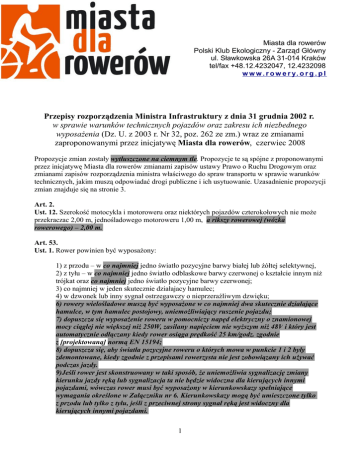 Miasta dla rowerów Polski Klub Ekologiczny - Zarząd Główny ul. Sławkowska 26A 31-014 Kraków tel/fax +48.12.4232047, 12.4232098 w w w . r o w e r y. o r g . p l Przepisy rozporządzenia Ministra Infrastruktury z dnia 31 grudnia 2002 r. w sprawie warunków technicznych pojazdów oraz zakresu ich niezbednego wyposażenia (Dz. U. z 2003 r. Nr 32, poz. 262 ze zm.) wraz ze zmianami zaproponowanymi przez inicjatywę Miasta dla rowerów, czerwiec 2008 Propozycje zmian zostały wytłuszczone na ciemnym tle. Propozycje te są spójne z proponowanymi przez inicjatywę Miasta dla rowerów zmianami zapisów ustawy Prawo o Ruchu Drogowym oraz zmianami zapisów rozporządzenia ministra właściwego do spraw transportu w sprawie warunków technicznych, jakim muszą odpowiadać drogi publiczne i ich usytuowanie. Uzasadnienie propozycji zmian znajduje się na stronie 3. Art. 2. Ust. 12. Szerokość motocykla i motoroweru oraz niektórych pojazdów czterokołowych nie może przekraczac 2,00 m, jednośladowego motoroweru 1,00 m, a rikszy rowerowej (wózka rowerowego) – 2,00 m. Art. 53. Ust. 1. Rower powinien być wyposażony: 1) z przodu – w co najmniej jedno światło pozycyjne barwy białej lub żółtej selektywnej, 2) z tyłu – w co najmniej jedno światło odblaskowe barwy czerwonej o kształcie innym niż trójkat oraz co najmniej jedno światło pozycyjne barwy czerwonej; 3) co najmniej w jeden skutecznie działajacy hamulec; 4) w dzwonek lub inny sygnał ostrzegawczy o nieprzeraźliwym dzwięku; 6) rowery wielośladowe muszą być wyposażone w co najmniej dwa skutecznie działające hamulce, w tym hamulec postojowy, uniemożliwiający ruszenie pojazdu; 7) dopuszcza się wyposażenie roweru w pomocniczy napęd elektryczny o znamionowej mocy ciągłej nie większej niż 250W, zasilany napięciem nie wyższym niż 48V i który jest automatycznie odłączany kiedy rower osiąga prędkość 25 km/godz. zgodnie z [projektowaną] normą EN 15194; 8) dopuszcza się, aby światła pozycyjne roweru o których mowa w punkcie 1 i 2 były zdemontowane, kiedy zgodnie z przepisami rowerzysta nie jest zobowiązany ich używać podczas jazdy. 9)Jeśli rower jest skonstruowany w taki sposób, że uniemożliwia sygnalizację zmiany kierunku jazdy ręką lub sygnalizacja ta nie będzie widoczna dla kierujących innymi pojazdami, wówczas rower musi być wyposażony w kierunkowskazy spełniające wymagania określone w Załączniku nr 6. Kierunkowskazy mogą być umieszczone tylko z przodu lub tylko z tyłu, jeśli z przeciwnej strony sygnał ręką jest widoczny dla kierujących innymi pojazdami. 1 Art. 56. Ust. 1. Światła pojazdu, o których mowa w Art. 53-55, powinny odpowiadać następującym warunkom: 1) światła pozycyjne oraz światła odblaskowe oświetlone światłem drogowym innego pojazdu powinny być widoczne w nocy przy dobrej przejrzystości powietrza z odległości co najmniej 150 m. W przypadku rowerów dopuszcza się światła pozycyjne migające ze stałą częstotliwością nie mniejszą niż 1 Hz (60 przerw na minutę) przy czym czas świecenia powinien być zbliżony do czasu trwania przerw. 2) powinny być umieszczone nie wyżej niż 2000 mm i nie niżej niż 350 mm od powierzchni jezdni; 3) światła pojedyncze na pojeździe wielośladowym powinny być umieszczone po lewej stronie pojazdu możliwie najbliżej jego bocznego obrysu, jednak nie dalej niż 150 mm od tego obrysu; przepisu nie stosuje sie do świateł oświetlających drogę, które powinny być umieszczone pośrodku; 4) dwa światła powinny byc umieszczone symetrycznie po obu stronach pojazdu możliwie najbliżej jego bocznego obrysu, jednak nie dalej niż 100 mm od tego obrysu oraz na jednakowej wysokości nad jezdnią; widoczność dwóch świateł powinna być jednakowa; 5) światła czerwone nie moga być widoczne z przodu, a światła białe (żółte selektywne) z tyłu. Ust. 2. Dopuszcza się umieszczanie świateł odblaskowych barwy żółtej samochodowej lub białej: 1) na bocznych płaszczyznach kół i ramy pojazdu, o którym mowa w § 53-55, 2) na pedałach roweru i motoroweru – barwy żółtej; światła, o których mowa w pkt 1 i 2, nie musza spełniac warunków okreslonych w ust.1 pkt 2-4. 3) świateł odblaskowych barwy białej – z przodu pojazdu. Ust. 3. Jeżeli do pojazdu zaprzęgowego lub roweru (motoroweru) przyczepiony jest inny pojazd, maszyna lub urządzenie, powinien on być wyposażony w co najmniej jedno światło pozycyjne barwy czerwonej oraz w co najmniej jedno światło odblaskowe barwy czerwonej widoczne z tyłu, a ponadto w jedno światło pozycyjne barwy białej widoczne z przodu, jeżeli szerokość pojazdu ciągnietego (maszyny, urzadzenia) przekracza szerokość pojazdu ciagnącego; światła te powinny odpowiadać warunkom określonym w ust. 1. Ust. 4. Do świateł pojazdu, o którym mowa w niniejszym rozdziale, stosuje sie zasady rozmieszczenia okreslone w § 1 ust. 2-4 załacznika nr 6 do rozporzadzenia. Uzasadnienie: 1. Zaproponowana dopuszczalna szerokość rikszy rowerowej pozwala na standaryzację infrastruktury przeznaczonej dla rowerów i jest spójna z zapisem tego samego artykułu o szerokości „niektórych innych pojazdów czterokołowych” co jest istotne ze względu na to, że istnieją riksze trójkołowe. Szerokość roweru jednośladowego jest określona w propozycji zmian w ustawie Prawo o Ruchu Drogowym. 2. Stosowanie co najmniej jednego światła pozycyjnego z przodu lub tyłu sankcjonuje stosowanie kilku reflektorów w sytuacji kiedy tylko jeden ze względu na parametry techniczne oświetlenia rowerowego dostępnego na rynku jest niewystarczający dla oświetlenia drogi przed rowerem. Stosowanie kilku świateł pozycyjnych z przodu czy tyłu 2 poprawia też widoczność rowerzysty. 3. Ze względu na rozwój rynku wskazane jest wprowadzenie odrębnych wymogów także dla rowerów wielośladowych. Ponieważ w przeciwieństwie do rowerów jednośladowych mog