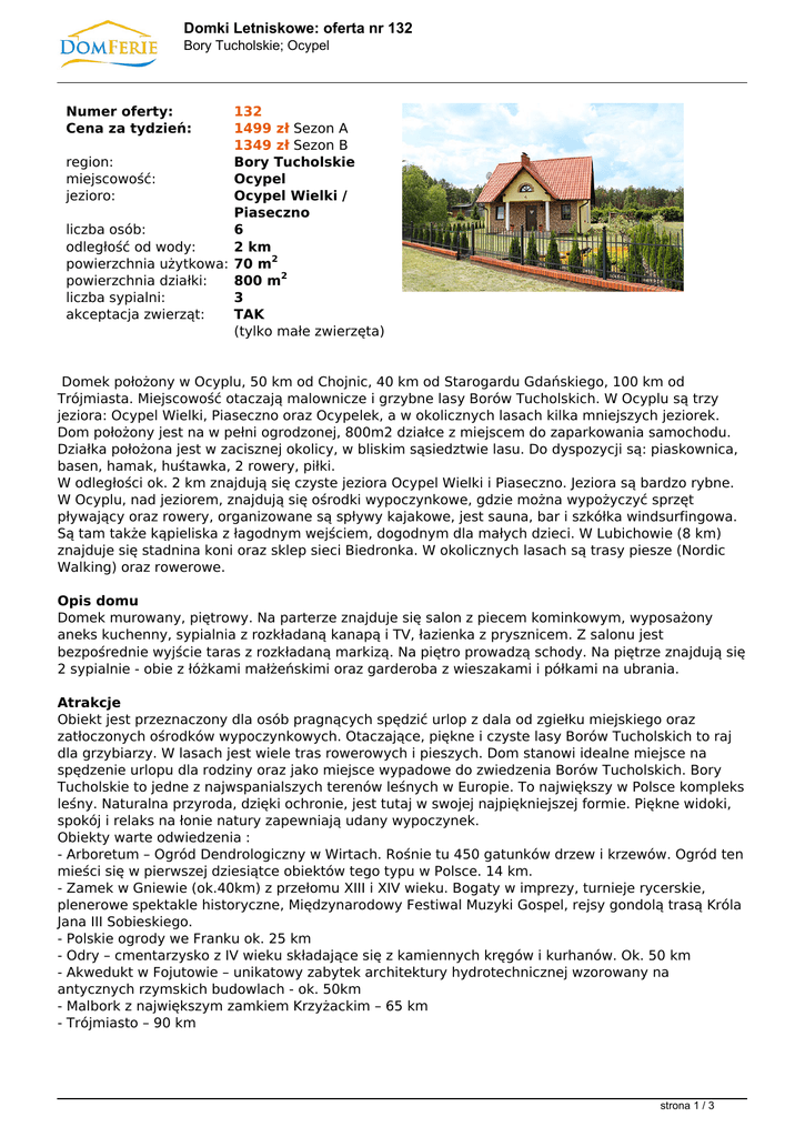 Domki Letniskowe: oferta nr 132 Bory Tucholskie; Ocypel Numer oferty: Cena za tydzień: 132 1499 zł Sezon A 1349 zł Sezon B region: Bory Tucholskie miejscowość: Ocypel jezioro: Ocypel Wielki / Piaseczno liczba osób: 6 odległość od wody: 2 km powierzchnia użytkowa: 70 m2 powierzchnia działki: 800 m2 liczba sypialni: 3 akceptacja zwierząt: TAK (tylko małe zwierzęta) Domek położony w Ocyplu, 50 km od Chojnic, 40 km od Starogardu Gdańskiego, 100 km od Trójmiasta. Miejscowość otaczają malownicze i grzybne lasy Borów Tucholskich. W Ocyplu są trzy jeziora: Ocypel Wielki, Piaseczno oraz Ocypelek, a w okolicznych lasach kilka mniejszych jeziorek. Dom położony jest na w pełni ogrodzonej, 800m2 działce z miejscem do zaparkowania samochodu. Działka położona jest w zacisznej okolicy, w bliskim sąsiedztwie lasu. Do dyspozycji są: piaskownica, basen, hamak, huśtawka, 2 rowery, piłki. W odległości ok. 2 km znajdują się czyste jeziora Ocypel Wielki i Piaseczno. Jeziora są bardzo rybne. W Ocyplu, nad jeziorem, znajdują się ośrodki wypoczynkowe, gdzie można wypożyczyć sprzęt pływający oraz rowery, organizowane są spływy kajakowe, jest sauna, bar i szkółka windsurfingowa. Są tam także kąpieliska z łagodnym wejściem, dogodnym dla małych dzieci. W Lubichowie (8 km) znajduje się stadnina koni oraz sklep sieci Biedronka. W okolicznych lasach są trasy piesze (Nordic Walking) oraz rowerowe. Opis domu Domek murowany, piętrowy. Na parterze znajduje się salon z piecem kominkowym, wyposażony aneks kuchenny, sypialnia z rozkładaną kanapą i TV, łazienka z prysznicem. Z salonu jest bezpośrednie wyjście taras z rozkładaną markizą. Na piętro prowadzą schody. Na piętrze znajdują się 2 sypialnie - obie z łóżkami małżeńskimi oraz garderoba z wieszakami i półkami na ubrania. Atrakcje Obiekt jest przeznaczony dla osób pragnących spędzić urlop z dala od zgiełku miejskiego oraz zatłoczonych ośrodków wypoczynkowych. Otaczające, piękne i czyste lasy Borów Tucholskich to raj dla grzybiarzy. W lasach jest wiele tras rowerowych i pieszych. Dom stanowi idealne miejsce na spędzenie urlopu dla rodziny oraz jako miejsce wypadowe do zwiedzenia Borów Tucholskich. Bory Tucholskie to jedne z najwspanialszych terenów leśnych w Europie. To największy w Polsce kompleks leśny. Naturalna przyroda, dzięki ochronie, jest tutaj w swojej najpiękniejszej formie. Piękne widoki, spokój i relaks na łonie natury zapewniają udany wypoczynek. Obiekty warte odwiedzenia : - Arboretum – Ogród Dendrologiczny w Wirtach. Rośnie tu 450 gatunków drzew i krzewów. Ogród ten mieści się w pierwszej dziesiątce obiektów tego typu w Polsce. 14 km. - Zamek w Gniewie (ok.40km) z przełomu XIII i XIV wieku. Bogaty w imprezy, turnieje rycerskie, plenerowe spektakle historyczne, Międzynarodowy Festiwal Muzyki Gospel, rejsy gondolą trasą Króla Jana III Sobieskiego. - Polskie ogrody we Franku ok. 25 km - Odry – cmentarzysko z IV wieku składające się z kamiennych kręgów i kurhanów. Ok. 50 km - Akwedukt w Fojutowie – unikatowy zabytek architektury hydrotechnicznej wzorowany na antycznych rzymskich budowlach - ok. 50km - Malbork z największym zamkiem Krzyżackim – 65 km - Trójmiasto – 90 km strona 1 / 3 Domki Letniskowe: oferta nr 132 Bory Tucholskie; Ocypel Charakterystyka obiektu: - Maksymalna liczba osób: 6 - 1 Sypialnia: kanapa 2 os.: parter - 2 Sypialnia: łóżko 2 os.: piętro - 3 Sypialnia: łóżko 2 os.: piętro - Bielizna pościelowa: 10zł/os/pobyt - Lodówka: tak - Aneks kuchenny: parter - Kuchenka: elektryczna 4 płyty + piekarnik - Czajnik: tak - Łazienka: z prysznicem + WC: parter Charakterystyka obiektu, c.d.: - TV: Polsat Cyfrowy - Grill ogrodowy: tak - Meble ogrodowe: tak + 2 leżaki - Kąpiel w jeziorze: 2 km - Rowery: 2 szt. - Wypożyczalnia rowerów i sprzętu pływającego: Ocypel - Wędkowanie: wykup zezwolenia w Ocyplu - Restauracja/bar: Ocypel, 2km - Lekarz, ośr. zdrowia: Lubichowo, 8km - Sklep spożywczy: 2km/8km Biedronka - Pralka: tak - Ogrzewanie: kominek - Bankomat: Lubichowo, 8km - Stadnina koni: Lubichowo, 8km - Ciepła woda: bojler 80l - Zwierzęta: tylko małe CENNIK: Podana poniżej i wyróżniona na pomarańczowo cena jest całkowitą ceną wynajmu domu na 1 tydzień - od soboty do soboty (zawiera w sobie kwotę rezerwacji i zaliczki). Dodatkowo dolicza się podane niżej opłady obowiązkowe i/lub nieobowiązkowe. Sezon A Sezon B TYLKO Weekendy: 25.06. - 20.08.2011. Poza sezonem A 29.04 - 03.05 (4 doby) wynajem za 1 tydzień w tym: 1499 zł/tydz 1349 zł/tydz nie jest wynajmowany na weekendy - rezerwacja 299 zł/tydz 249 zł/tydz --- - zaliczka 200 zł/tydz 200 zł/tydz --- OPŁATY DODATKOWE: 1. Zużycie energii elekt. wg wskazań licznika; koszt 70 gr. za 1 kWh. 2. Zryczałtowana opłata za wodę i szambo: 50zł/tydz* 3. Sprzątanie domu po zakończeniu turnusu 100 zł jeżeli najemca nie chce sam wykonać tej pracy 4. Drewno do kominka wiązka 30 zł 5. Bielizna pościelowa: 10 zł/osoba/pobyt 6. Każde zwierzę 50 zł/tydzień* strona 2 / 3 Domki Letniskowe: oferta nr 132 Bory Tucholskie; Ocypel * przy krótszych pobytach opłata jak za cały tydzień KAUCJA 300 zł Kaucja, pobierana przez właściciela w momencie przekazania kluczy, jest zwracana najemcy po potrąceniu kwoty opłat dodatkowych oraz ewentualnych uzasadnionych kosztów szkód powstałych z jego winy. strona 3 / 3 Powered by TCPDF (www.tcpdf.org)