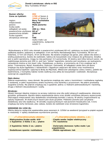 Domki Letniskowe: oferta nr 092 Bory Tucholskie; M?cika? Numer oferty: Cena za tydzień: 092 1799 zł Sezon A 1649 zł Sezon B region: Bory Tucholskie miejscowość: Męcikał jezioro: Małe Jeziorko liczba osób: 6 odległość od wody: 200 m / 5km powierzchnia użytkowa: 60 m2 powierzchnia działki: 2000 m2 liczba sypialni: 2 akceptacja zwierząt: TAK (tylko małe i po uzgodnieniu, wyłącznie suczki !) Wybudowany w 2015 roku domek o powierzchni użytkowej 60 m2, położony na dużej (2000 m2) i zadbanej działce, położony w odległości 3 km od Parku Narodowego Bory Tucholskie, 90 km od Gdańska, 17 km od Chojnic, 8 km od Brusów. Na działce znajduje się garaż, plac zabaw dla dzieci z wielką piaskownica, boisko do siatkówki, tablica do koszykówki oraz miejsce do grillowania. Działka jest w pełni ogrodzona, mogą na niej parkować 3-4 samochody. W okolicy jest kilka leśnych jezior, do najbliższego jeziorka jest 200 m, jest tam "dzikie" kąpielisko. Jeziorko jest zarybiane, po wykupieniu zezwolenia można w nim łowić ryby. Dodatkowo, w okolicy, w promieniu ok.3 km znajduje się 5 jezior: Trzemeszno, Mylof, Kosobudno, Dybrzyk i Ostrowite. W odległości około 5km od domu znajduje się duże kąpielisko z ratownikiem i łagodnym wejściem dla dzieci oraz możliwością wypożyczenia kajaków i spłynięcia Brdą do Męcikału. Właściciel udostępnia cztery rowery, paletki do badmintona, 2 komplety kijków nordic-walking oraz piłkę do koszykówki i siatkówki. Akceptacja zwierząt do uzgodnienia. Opis domu: Dobrze wyposażony, nowy domek. Na parterze znajdują się: salon z kominkiem i rozkładaną rogówką 2 osobową, w pełni wyposażony aneks kuchenny oraz łazienka z prysznicem. Na piętro prowadzą wygodne schody. Na piętrze znajdują się 2 sypialnie: jedna z 2 łóżkami jednoosobowymi i łazienką, druga z łóżkiem dwuosobowym i szafą. Atrakcje: Obiekt stanowi idealne miejsce na wczasy rodzinne oraz dla osób lubiących wędkowanie, zbieranie grzybów, grillowanie. Bardzo dobre wyposażenie domu oraz działki umożliwia aktywny wypoczynek. Otaczające miejscowość lasy dodatkowo umożliwiają kontakt z naturą. W okolicy organizowane są spływy kajakowe. W okolicznych lasach jest dużo grzybów. Pobliskie jeziorko jest zarybiane dodatkowy atut dla wędkarzy. W ośrodku wypoczynkowym nad jeziorem Kosobudno (ok. 5 km) znajdują się korty tenisowe, plac zabaw, boisko do siatkówki oraz strzeżone kąpielisko. WEEKEND ZA 1250 ZŁ: Oferta dotyczy wyłącznie weekendów poza sezonem A: 1250zł za weekend (przyjazd w piątek wyjazd w niedzielę) + opłaty dodatkowe wymienione poniżej Charakterystyka obiektu: - Maksymalna liczba osób: 4/6* - 1 Sypialnia: 2 łóżka 1 os..: piętro Charakterystyka obiektu, c.d.: - Ciepła woda: bojler elektryczny - TV: naziemna - 2 Sypialnia: łóżko 2 os.: piętro - Zwierzęta domowe: tylko małe i po uzgodnieniu - Meble ogrodowe: tak - Dodatkowe spanie: rozkładana strona 1 / 3 Domki Letniskowe: oferta nr 092 Bory Tucholskie; M?cika? rogówka 2 os.: salon, parter - 1 Łazienka z kabiną prysznicową: parter - 2 Łazienka: piętro, przy sypialni 1 - Bielizna pościelowa: 10 zł/os/pobyt - Salon z kominkiem: parter - Aneks kuchenny z wyposażeniem: parter - Kuchenka elektryczna: 4 palniki z piekarnikiem - Grill ogrodowy: tak - Duże leżaki: 3szt. - Rowery: 4 szt. - Kąpiel w jeziorku leśnym: 200 m - Kąpiel z ratownikiem: 5 km - Wędkowanie: wykup zezwolenia na miejscu - Ośrodek wypoczynkowy: ok. 5 km - Restauracja: 8 km - Lekarz: 8 km - Sklep spożywczy: 1,2 km - Wypożyczalnia sprzętu wodnego: 5 km - Czajnik: tak - Lodówka: tak - Ogrzewanie: kominek * 6 osób przy wykorzystaniu spania dodatkowego w salonie CENNIK: Podana poniżej i wyróżniona na pomarańczowo cena jest całkowitą ceną wynajmu domu na 1 tydzień - od soboty do soboty (zawiera w sobie kwotę rezerwacji i zaliczki). Dodatkowo dolicza się podane niżej opłady obowiązkowe i/lub nieobowiązkowe. Sezon A Sezon B TYLKO Weekendy: 25.06. - 20.08.2011. Poza sezonem A 29.04 - 03.05 (4 doby) wynajem za 1 tydzień w tym: 1799 zł/tydz 1649 zł/tydz 1249 zł za 3 doby 1632 zł za 3 doby - rezerwacja 299 zł/tydz 249 zł/tydz 249 zł/pobyt - zaliczka --- --- --- OPŁATY DODATKOWE: 1. Zużycie energii elekt. wg wskazań licznika; koszt 60 gr. za 1 kWh. 2. Sprzątanie domu po zakończeniu turnusu 150 zł jeżeli najemca nie chce sam wykonać tej pracy. 3. Bielizna pościelowa 10 zł/osoba/pobyt 4. Każde zwierzę 50 zł/tydzień 5. Drewno do kominka 1 wsad gratis, dodatkowa wiązka 30 zł strona 2 / 3 Domki Letniskowe: oferta nr 092 Bory Tucholskie; M?cika? KAUCJA 300 zł Kaucja, pobierana przez właściciela w momencie przekazania kluczy, jest zwracana najemcy po potrąceniu kwoty opłat dodatkowych oraz ewentualnych uzasadnionych kosztów szkód powstałych z jego winy. strona 3 / 3 Powered by TCPDF (www.tcpdf.org)