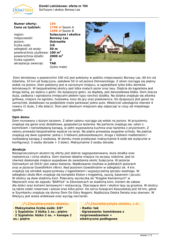 Domki Letniskowe: oferta nr 104 Sul?czyno i okolice; Borowy Las Numer oferty: Cena za tydzień: 104 1799 zł Sezon A 1599 zł Sezon B region: Sulęczyno i okolice miejscowość: Borowy Las jezioro: Ostrowite liczba osób: 3/6 odległość od wody: 50 m powierzchnia użytkowa: 100 m2 powierzchnia działki: 2000 m2 liczba sypialni: 2 akceptacja zwierząt: TAK (tylko małe) Dom letniskowy o powierzchni 100 m2 jest położony w pobliżu miejscowości Borowy Las, 60 km od Gdańska, 10 km od Sulęczyna, zaledwie 50 m od jeziora Ostrowickiego. Z okien rozciąga się piękny widok na jezioro. Dom położony jest w zacisznym miejscu, w sąsiedztwie tylko kilku domków letniskowych. W bezpośredniej okolicy jest kilka małych jezior oraz lasy. Dojście do kąpieliska jest drogą leśną, po zejściu z górki. Do dyspozycji gości, za dopłatą, jest dwuosobowa łódka. Dom otacza duża, zadbana i ogrodzona (miejscami płotem typu rancho) działka. Na działce znajduje się altanka grillowa, miejsce na ognisko, huśtawka, kosz do gry oraz piaskownica. Do dyspozycji jest garaż na samochód, dodatkowo na podjeździe może parkować jedno auto. Właściciel udostępnia również 4 rowery (2 duże, 2 dla dzieci). Dom jest idealnym miejscem aby odpocząć w ciszy od miejskiego zgiełku. Opis domu Dom murowany z dużym tarasem. Z okien salonu rozciąga się widok na jezioro. W przyziemiu znajduje się garaż oraz dodatkowa, gospodarcza łazienka. Na parterze znajdują się: salon z kominkiem i nierozkładaną kanapą, w pełni wyposażona kuchnia oraz łazienka z prysznicem. Z salonu prowadzi bezpośrednie wyjście na taras. Na piętro prowadzą wygodne schody. Na piętrze znajdują się dwie sypialnie: jedna z 3 łóżkami jednoosobowymi, druga z łóżkiem małżeńskim i rozkładaną kanapą 2 osobową. W domku może przebywać maksymalnie 6 osób ale wyłącznie w konfiguracji: 3 osoby dorosłe + 3 dzieci. Maksymalnie 3 osoby dorosłe. Atrakcje Niezaprzeczalnym atutem tej oferty jest dobrze zagospodarowana, duża działka oraz malownicza i cicha okolica. Dom stanowi idealne miejsce na wczasy rodzinne. Jest to również doskonałe miejsce wypadowe do zwiedzenia okolic Sulęczyna. W jeziorze Ostrowitym od 2015r jest zakaz łowienia. Wędkowanie możliwe w pobliskich jeziorach oraz w Jeziorze Gowidlińkim (4km). Nad jeziorem Gowidlinskim w odległości ok. 4 km. znajduje się ośrodek wypoczynkowy z kąpieliskiem i wypożyczalnią sprzętu wodnego. W odległości około 8km znajduje się kompleks Kiston z kręgielnią, sauną, basenem i jacuzzi. W okolicy są dwie stadniny koni. Polecamy wycieczkę do "Kręgów Kamiennych" w Węsiorach oraz do zajazdu "BARYŁA" w Zdunowicach ze stadniną koni, trenem do zabaw dla dzieci oraz kortami tenisowymi i restauracją. Otaczające dom i okolice lasy są grzybne. W okolicy są także szlaki rowerowe i piesze oraz kilka jezior. Do serca Szwajcarii Kaszubskiej jest 40 km, gdzie w Szymbarku znajduje się słynny Dom Do Góry Nogami, Najdłuższa Deska Świata oraz skansen. W Wieżycy jest wieża widokowa oraz wyciąg narciarski. Charakterystyka obiektu: - Maksymalna liczba osób: 3/6* - 1 Sypialnia: 3 łóżka 1 os.: piętro - 2 Sypialnia: łóżko 2 os. + kanapa 2 os.: piętro Charakterystyka obiektu, c.d.: - Radio: tak - Ogrzewanie: kominkowe z rozprowadzeniem + elektryczne podłogowe strona 1 / 3 Domki Letniskowe: oferta nr 104 Sul?czyno i okolice; Borowy Las - Dodatkowe spanie: kanapa 1 os., salon - Salon z kominkiem: parter - Łazienka z prysznicem + WC: parter - Bielizna pościelowa: 10 zł/os/pobyt - Kuchnia z wyposażeniem: parter - Kuchenka: 4 płyty, elektryczna + piekarnik - Czajnik: elektr. - Kuchenka mikrofalowa: tak - TV: krajowa darmowa - Odtwarzacz DVD + płyty z bajkami i filmami - Zwierzęta domowe: tylko małe - Łódka: 100zł/tydz - Rowery: 2 duże, 2 małe Kąpiel w jeziorze: 50 m Grill: tak Meble ogrodowe: tak Huśtawka - Piaskownica - Wędkowanie: 300m - Lodówka: tak - Ciepła woda: bojler - Sklep spożywczy: 5 km * 6 osób przy wykorzystaniu spania na nierozkładanej kanapie w salonie (dla dziecka lub nastolatka) i wyłącznie w konfiguracji 3 osoby dorosłe + 3 dzieci CENNIK: Podana poniżej i wyróżniona na pomarańczowo cena jest całkowitą ceną wynajmu domu na 1 tydzień - od soboty do soboty (zawiera w sobie kwotę rezerwacji i zaliczki). Dodatkowo dolicza się podane niżej opłady obowiązkowe i/lub nieobowiązkowe. wynajem za 1 tydzień w tym: Sezon A Sezon B TYLKO Weekendy: 25.06. - 20.08.2011. Poza sezonem A 29.04 - 03.05 (4 doby) 1799 zł/tydz 1599 zł/tydz 1050 zł za 3 doby 1300 zł za 4 doby - rezerwacja 299 zł/tydz 299 zł/tydz 300 zł/pobyt - zaliczka 200 zł/tydz 200 zł/tydz 200 zł/pobyt OPŁATY DODATKOWE: 1. Zużycie energii elekt. wg wskazań licznika; koszt 60gr za 1 kWh. 2. Zużycie wody 5 zł za 1 m3 3. Sprzątanie domu po zakończeniu turnusu 150 zł jeżeli najemca nie chce sam wykonać tej pracy 4. Drewno do kominka 1 wsad gratis, dodatkowa wiązka 30 zł 5. Korzystanie z łódki 100 zł za 1 tydzień/szt.* 6. Bielizna pościelowa 10 zł/osoba/pobyt 7. Każde zwierzę 50 zł/tydzień* * w przypadku krótszych wynajmów opłata jest pobierana za 1 tydzień KAUCJA 300 zł Kaucja, pobierana przez właściciela w momencie przekazania kluczy, jest zwracana najemcy po potrąceniu kwoty opłat dodatkowych oraz ewentualnych uzasadnionych kosztów szkód powstałych z jego winy. strona 2 / 3 Domki Letniskowe: oferta nr 104 Sul?czyno i okolice; Borowy Las strona 3 / 3 Powered by TCPDF (www.tcpdf.org)