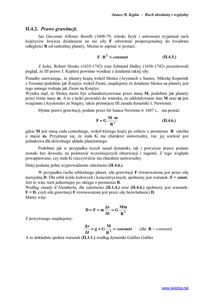 Janusz B. Kępka – Ruch absolutny i względny II.4.2. Prawo grawitacji. Już Giovanni Alfonso Borelli (1608-79, włoski fizyk i astronom) wyjaśniał ruch księżyców Jowisza działaniem na nie siły F odwrotnie proporcjonalnej do kwadratu odległości R od centralnej planety. Można to zapisać w postaci: F × R 2 = constant (II.4.5.) Z kolei, Robert Hooke (1635-1742) oraz Edmund Halley (1656-1742) prezentowali pogląd, że III prawo J. Keplera powinno wynikać z działania takiej siły. Ponadto zauważając, że planety krążą wokół Słońca (Arystarch z Samos, Mikołaj Kopernik z Torunia) podobnie jak Księżyc wokół Ziemi, znajdujemy że działanie Słońca na planety jest tego samego rodzaju jak Ziemi na Księżyc. Wynika stąd, że Słońce może być scharakteryzowane przez masę M, podobnie jak planety przez różne masy m. A to z kolei prowadzi do wniosku, że oddziaływanie mas M oraz m jest wzajemne (Arystoteles ze Stagiry, także późniejsza III zasada dynamiki I. Newtona). Słynne prawo grawitacji, podane przez Sir Isaaca Newtona w 1687 r., ma postać: F=G M ×m R2 (II.4.6.) gdzie M jest masą ciała centralnego, wokół którego krąży po orbicie o promieniu R satelita o masie m. Przyjmuje się, że stała G ma charakter uniwersalny, tzn. jej wartość jest jednakowa dla dowolnego układu planetarnego. Podobnie jak w przypadku trzech zasad dynamiki, tak i powyższe prawo podane zostało bez dowodu, na podstawie wcześniejszych obserwacji i sugestii. Z tego względu powątpiewano, czy stała G rzeczywiście ma charakter uniwersalny. Dalej podamy pełne wyprowadzenie zależności (II.4.6.). W przypadku ruchu orbitalnego planet, siła grawitacji F równoważona jest przez siłę inercjalną D. Dla orbit ściśle kołowych i koncentrycznych, spełniony jest warunek: F = const. Jest to więc ruch jednostajny po okręgu o promieniu R. Według zasady d’Alemberta, dla zależności (II.1.4.) oraz (II.4.6.) spełniony jest warunek: F = D, czyli siła grawitacji F równoważona jest przez siłę bezwładności D. Mamy więc: D=F=m Z powyższego znajdujemy: Dv Mm =G 2 Dt R Dv M = g = G 2 = constant (dla R = constant) Dt R A to dokładnie spełnia warunek (II.3.1.) według dynamiki Galileo Galilei. www.iwiedza.net