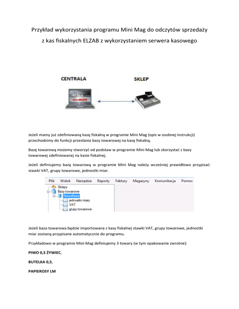 Przykład wykorzystania programu Mini Mag do odczytów sprzedaży z kas fiskalnych ELZAB z wykorzystaniem serwera kasowego Jeżeli mamy już zdefiniowaną kasę fiskalną w programie Mini Mag (opis w osobnej instrukcji) przechodzimy do funkcji przesłania bazy towarowej na kasę fiskalną. Bazę towarową możemy stworzyć od podstaw w programie Mini Mag lub skorzystać z bazy towarowej zdefiniowanej na kasie fiskalnej. Jeżeli definiujemy bazę towarową w programie Mini Mag należy wcześniej prawidłowo przypisać: stawki VAT, grupy towarowe, jednostki miar. Jeżeli baza towarowa będzie importowana z kasy fiskalnej stawki VAT, grupy towarowe, jednostki miar zostaną przypisane automatycznie do programu. Przykładowo w programie Mini Mag definiujemy 3 towary (w tym opakowanie zwrotne): PIWO 0,5 ŻYWIEC, BUTELKA 0,5, PAPIEROSY LM Następnie przesyłamy zdefiniowane towary na kasę fiskalną (Inicjalizuj bazę na kasie): Następnie ustalamy harmonogram odczytu sprzedaży z kas fiskalnych (Lista harmonogramów). Definiujemy nowy harmonogram oraz ustalamy datę oraz czas odczytów sprzedaży z kas fiskalnych. Na kasie fiskalnej sprzedajemy następujące towary (poniżej przykłady na kasie fiskalnej w trybie szkoleniowym). Po odczycie sprzedaży z kas fiskalnych według harmonogramu serwera możemy sprawdzić odczytane paragony w Raportach Sprzedaży. Jeżeli korzystamy z wersji programu Mini Mag z modułem magazynowym po każdorazowym odczycie sprzedaży następuje aktualizacja stanów magazynowych.