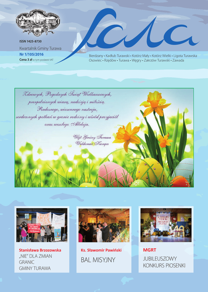 ISSN 1425-8730 Kwartalnik Gminy Turawa Nr 1/105/2016 Cena 3 zł w tym podatek VAT Stanisława Brzozowska „NIE” DLA ZMIAN GRANIC GMINY TURAWA Bierdzany • Kadłub Turawski • Kotórz Mały • Kotórz Wielki • Ligota Turawska Osowiec • Rzędów • Turawa • Węgry • Zakrzów Turawski • Zawada Ks. Sławomir Pawiński MGRT BAL MIsYjNY jUBILEUsZOWY KONKURs PIOsENKI 2 Kwartalnik Gminy Turawa KONKURS Wiejska Izba Regionalna w Ligocie Turawskiej przy wsparciu Towarzystwa Miłośników Ziemi Turawskiej ogłasza kolejny konkurs na najciekawszy obiekt muzealny. Zwracamy się do mieszkańców Gminy Turawa z prośbą o aktywne uczestnictwo w przedsięwzięciu. Bardzo często nie zdajemy sobie nawet sprawy z tego, że wokół nas ulegają zniszczeniu przedmioty o historycznej wartości, mówiące o przeszłości naszych przodków. Zapewniamy, że dostarczone eksponaty znajdą opiekę w dobrze zorganizowanej Izbie Regionalnej w Ligocie Turawskiej. Poniżej przedstawiamy regulamin organizacyjny konkursu. Regulamin organizacyjny konkursu na najciekawszy obiekt wykonany do 1945 roku, nierozerwalnie związany z życiem i pracą ludności na terenie Gminy Turawa. § 1. Konkurs zorganizowano z inicjatywy Towarzystwa Miłośników Ziemi Turawskiej przy daleko idącym wsparciu organizacyjnym Wiejskiej Izby Regionalnej w Ligocie Turawskiej. Jego głównym celem jest ocalenie pamiątek kultury materialnej regionu turawskiego oraz wzbogacenie już istniejącej ekspozycji wystawienniczej. § 2. Konkurs trwa od chwili ogłoszenia na łamach „ Fali” do 30 kwietnia 2016 r., natomiast jego wyniki ogłoszone zostaną w piątek 20 maja 2016 r. o godz. 13.00 w Wiejskiej Izbie Regionalnej w Ligocie Turawskiej. § 3. W konkursie mogą wziąć udział wszystkie obiekty (przedmioty) kultury materialnej: a) pisane – książki, czasopisma, dokumenty, banknoty, zdjęcia, albumy, kroniki, obrazy itp., b) przedmioty – z ceramiki, szkła, porcelany i metalu, c) wystrój wnętrz – nakrycia stołowe, pościel, stroje itp., d) drobne narzędzia rolnicze i rzemieślnicze. Przedmioty przekazane do konkursu nie mogą być przed ich przekazaniem celowo odnawiane (malowane), z wyjątkiem bieżącej konserwacji. § 4. Komisja konkursowa dokona oceny punktowej dostarczonych przedmiotów za pomocą szczegółowych kryteriów. § 5. Każdy dostarczony do konkursu eksponat staje się własnością Wiejskiej Izby Regionalnej i powinien posiadać informację zawierającą nazwę, wiek, miejsce pochodzenia, przeznaczenie oraz adres właściciela. § 6. Właścicielom najciekawszych eksponatów zostaną przyznane nagrody i wyróżnienia. Szczegółowe informacje dotyczące konkursu uzyskać można pod tel. 77 4213062 oraz 604887743. Zarząd Towarzystwa Miłośników Ziemi Turawskiej KWaRTaLnIK ToWaRZySTWa MIłośnIKóW ZIeMI TuRaWSKIeJ „FaLa” – finansowany z budżetu Gminy Turawa. Kolegium redakcyjne: Redaktor naczelna – Brygida Kansy, Sekretarz – Teresa Żulewska, Stanisława Brzozowska, Jerzy Farys. Z redakcją na stale współpracują: Waldemar Kampa, alfred Kupka, Piotr Jendrzej, adam Bochenek, radni, sołtysi wsi, stowarzyszenia sportowe, dyrektorzy, nauczyciele szkół i przedszkoli. Korekta: Brygida Kansy. Skład i druk: Wydawnictwo i Drukarnia świętego Krzyża, ul. Katedralna 8a, 45-007 opole, tel. 77 44 17 140, fax 77 44 17 141 [email protected]; www.drukujunas.eu Redakcja nie odpowiada za treści umieszczonych reklam i ogłoszeń, nie zwraca nie zamówionych materiałów oraz zastrzega sobie prawo dokonywania skrótów i nie umieszczania zdjęć. 3 MaRzec 2016 25 laT KwarTalniKa „Fala” rozmowa z pomysłodawcą i twórcą „Fali” panem walterem Świercem Rozmawiała TereSa ŻulewSKa – W 2015 roku minęło 25 lat od pierwszego wydania kwartalnika „Fala”. W tamtym czasie Pan sprawował funkcję Wójta Gminy Turawa. Co sprawiło, że powstała chęć utworzenia takiej lokalnej gazety? – Powodem istnienia takiego czasopisma w naszej gminie było to, że jako wójt widziałem potrzebę podzielenia się ważnymi informacjami ze wszystkimi mieszkańcami gminy. Z praktyki wiedziałem, że mieszkańcy słabo uczestniczyli w zebraniach wiejskich, nie mieli więc możliwości posiadania wiedzy o tym, co dzieje się w gminie. Dlatego chciałem poprzez słowo pisane dotrzeć do nich. Drugim powodem była chęć, aby na stałe utrwalać bieżącą historię naszej gminy, a także przekazywać wydarzenia z przeszłości, co – moim zdaniem – całkowicie się udało, ponieważ taki ugruntowany opis wsi, np. Turawa, to rzadko która gmina posiada. – Kto de facto był założycielem kwartalnika Fala, kto ponosił koszty jego wydania? – Instytucjonalnym założycielem było Towarzystwo Miłośników Ziemi Turawskiej, które powstało w 1983 roku. W początkowym okresie koszty wydawania „Fali” były wpisane w budżet Towarzystwa. Budżet ten pochodził ze składek członków Towarzystwa, a także z reklam, umieszczanych na łamach „Fali”. Były to nikłe koszty. Kwartalnik drukowany był na ksero w Urzędzie Gminy, po kilkanaście egzemplarzy dla każdego sołectwa. Dopiero później zdecydowano o zwiększeniu nakładu do druku, wybrano drukarnię i wówczas wzrosły koszty. – W ciągu tych 25 lat nastąpiły duże zmiany w składzie redakcji, we władzach gminy i osobach piszących do „Fali”. Dzięki komu i czemu udaje się nadal go wydawać? – Przede wszystkim dzięki grupie ludzi zaangażowanych w tworzenie artykułów z życia społecznego, kulturalnego, historycznego, sportowego, po prostu naszej rzeczywistości. Kwartalnik istnieje jednak dlatego, że ma duże wsparcie finansowe ze strony Urzędu Gminy w Turawie. Kierownictwo Urzędu angażuje się w tworzenie kolejnych numerów „Fali”, zamieszczając ważne dla mieszkańców gminy informacje płynące z urzędu. Redaktorami naczelnymi kwartalnika „Fala” w kolejności byli: Walter Świerc, Leonard Richta, ponownie Walt