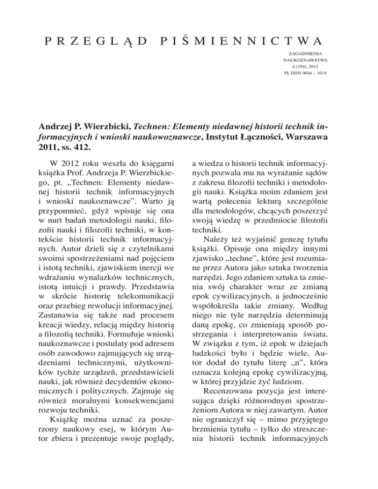 przegląd 287 piśmiennictwa ZAGADNIENIA NAUKOZNAWSTWA 4 (194), 2012 PL ISSN 0044 – 1619 Andrzej P. Wierzbicki, Technen: Elementy niedawnej historii technik informacyjnych i wnioski naukowoznawcze, Instytut Łączności, Warszawa 2011, ss. 412. W 2012 roku weszła do księgarni książka Prof. Andrzeja P. Wierzbickiego, pt. „Technen: Elementy niedawnej historii technik informacyjnych i wnioski naukoznawcze”. Warto ją przypomnieć, gdyż wpisuje się ona w nurt badań metodologii nauki, filozofii nauki i filozofii techniki, w kontekście historii technik informacyjnych. Autor dzieli się z czytelnikami swoimi spostrzeżeniami nad pojęciem i istotą techniki, zjawiskiem inercji we wdrażaniu wynalazków technicznych, istotą intuicji i prawdy. Przedstawia w skrócie historię telekomunikacji oraz przebieg rewolucji informacyjnej. Zastanawia się także nad procesem kreacji wiedzy, relacją między historią a filozofią techniki. Formułuje wnioski naukoznawcze i postulaty pod adresem osób zawodowo zajmujących się urządzeniami technicznymi, użytkowników tychże urządzeń, przedstawicieli nauki, jak również decydentów ekonomicznych i politycznych. Zajmuje się również moralnymi konsekwencjami rozwoju techniki. Książkę można uznać za poszerzony naukowy esej, w którym Autor zbiera i prezentuje swoje poglądy, a wiedza o historii technik informacyjnych pozwala mu na wyrażanie sądów z zakresu filozofii techniki i metodologii nauki. Książka moim zdaniem jest wartą polecenia lekturą szczególnie dla metodologów, chcących poszerzyć swoją wiedzę w przedmiocie filozofii techniki. Należy też wyjaśnić genezę tytułu książki. Opisuje ona między innymi zjawisko „techne”, które jest rozumiane przez Autora jako sztuka tworzenia narzędzi. Jego zdaniem sztuka ta zmienia swój charakter wraz ze zmianą epok cywilizacyjnych, a jednocześnie współokreśla takie zmiany. Według niego nie tyle narzędzia determinują daną epokę, co zmieniają sposób postrzegania i interpretowania świata. W związku z tym, iż epok w dziejach ludzkości było i będzie wiele, Autor dodał do tytułu literę „n”, która oznacza kolejną epokę cywilizacyjną, w której przyjdzie żyć ludziom. Recenzowana pozycja jest interesująca dzięki różnorodnym spostrzeżeniom Autora w niej zawartym. Autor nie ograniczył się – mimo przyjętego brzmienia tytułu – tylko do streszczenia historii technik informacyjnych 288 przegląd piśmiennictwa w XX i XXI wieku i sformułowania na tej podstawie wniosków naukoznawczych. Wykroczył poza temat publikacji, nawiązując w szczególności do: teorii ewolucji, chaosu, postmodernizmu, innowacyjności, ale także aktualnych problemów geopolitycznych (miejsca korporacji międzynarodowych w systemie suwerennych państw), globalizacji i ruchu otwartej nauki. Poza tym Autor nadał swej pracy rys biograficzny, ponieważ jest inżynierem, technikiem, z wieloletnim doświadczeniem w pracy zawodowej i naukowej. Do napisania książki wykorzystał swoje wieloletnie obserwacje rozwoju techniki, jakie prowadził przez ponad pięćdziesiąt lat w Polsce i za granicą. Wspomniał o tym wyraźnie w aneksie dołączonym do recenzowanej publikacji, podkreślając rolę modeli w tłumaczeniu rzeczywistości czy zastosowania probabilizmu, o czym przekonał się w trakcie swej pracy badawczej w podwarszawskim Instytucie Łączności oraz Japonii. Wnioski ze swoich doświadczeń wykorzystał między innymi w rozdziale dwunastym, prezentując modele kreowania wiedzy. Nawiązywał do wątków biograficznych dla zobrazowania danego zjawiska lub podania przykładu określonego działania, np. awarii elektrowni w Czarnobylu i prowadzonych przez siebie rozmów z ukraińskimi technikami. Recenzowana pozycja składa się z trzech części: spostrzeżeń naukoznawczych; elementów niedawnej historii technik informacyjnych oraz wniosków naukoznawczych. Pracę wieńczą: aneks z autobiografią autora, która uświadamia czytelnikowi genezę pewnych wątków poruszonych w książce; bibliografia; jak też – rzadziej już obecnie spotykany w opracowaniach naukowych, a tak przydatny – indeks nazwisk. Część pierwsza została podzielona na pięć rozdziałów. Autor zakreślił w niej pojęcie nowej epoki w dziejach ludzkości, tj. cywilizacji wiedzy. Podkreślił, iż każda z epok korzystała z własnej, swoistej platformy pojęciowej (zespołu nowych pojęć i idei, poprzedzających zmianę epoki cywilizacyjnej). Wymienił – jego zdaniem najważniejsze – megatrendy rewolucji informacyjnej: cyfrowej integracji, dematerializacji pracy oraz zmiany sposobu widzenia świata, w tym różnic między naukami ścisłymi a społecznymi i humanistycznymi. Definiował termin „technika”, wyodrębniając pojęcie „techniki właściwej”, jako podstawowej umiejętności człowieka, która umożliwia mu tworzenie potrzebnych narzędzi. W tej części zaprezentował także poglądy wybranych przedstawicieli filozofii techniki (w tym Heideggera). Nawiązał do odpowiedzialności za zastosowanie techniki, które nie zawsze przynosi skutki pozytywne dla ludzkości. Zastanawiał się nad możliwościami przewidywania skutków zastosowania danego wynalazku przez ludzi i zapobieganiu negatywnym zjawiskom z tym związanym, zwłaszcza w sytuacji, gdy ludzkość jako całość nie zdaje sobie sprawy z postępujących lawinowo niszczycielskich przegląd piśmiennictwa zmian w przyrodzie, niewidocznych z jednostkowego punktu widzenia. W pierwszej części zajął się również problematyką zjawiska inercji, intuicji, metafizyki, prawdy i hermeneutyki. Część pierwsza stanowi więc pojęciową podbudowę do rozważań prezentowanych w kolejnych partiach tekstu. Druga część książki odnosi się do historii technik informacyjnych. Autor w poszczególnych rozdziałach zaprezentował w skrócie rozwój telekomunikacji, radiofonii, telewizji, informatyki, elektroniki,