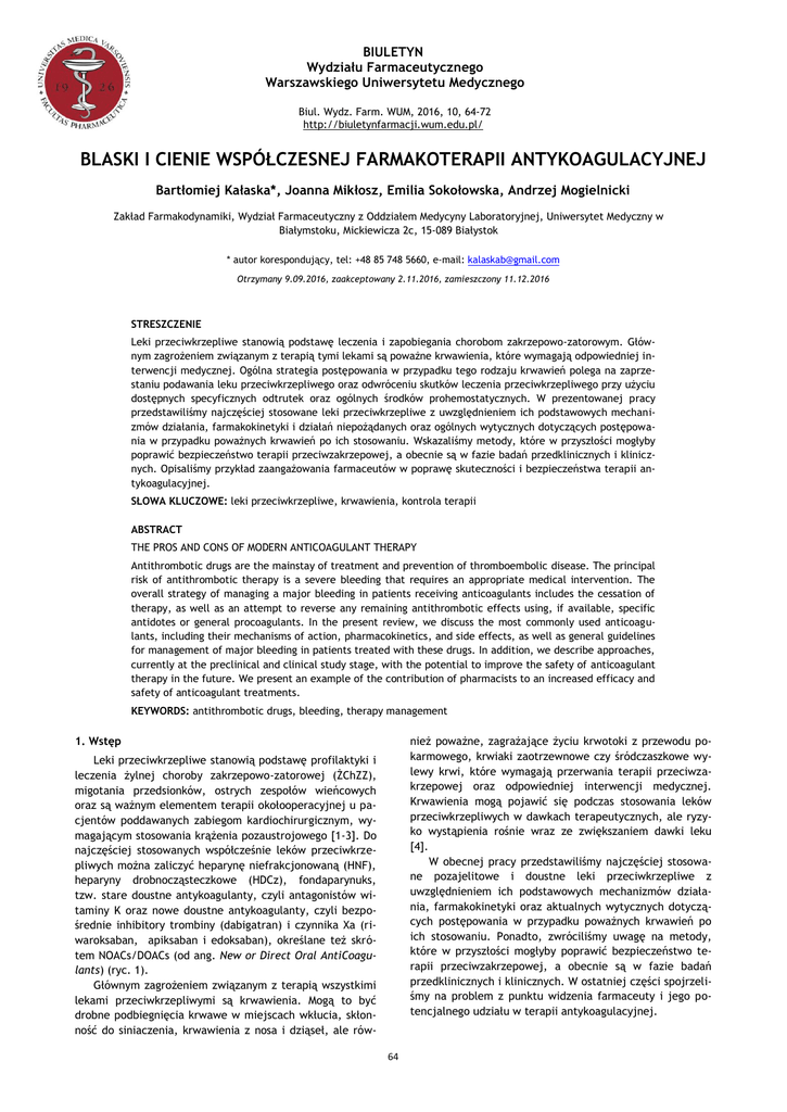 BIULETYN Wydziału Farmaceutycznego Warszawskiego Uniwersytetu Medycznego Biul. Wydz. Farm. WUM, 2016, 10, 64-72 http://biuletynfarmacji.wum.edu.pl/ BLASKI I CIENIE WSPÓŁCZESNEJ FARMAKOTERAPII ANTYKOAGULACYJNEJ Bartłomiej Kałaska*, Joanna Mikłosz, Emilia Sokołowska, Andrzej Mogielnicki Zakład Farmakodynamiki, Wydział Farmaceutyczny z Oddziałem Medycyny Laboratoryjnej, Uniwersytet Medyczny w Białymstoku, Mickiewicza 2c, 15-089 Białystok * autor korespondujący, tel: +48 85 748 5660, e-mail: [email protected] Otrzymany 9.09.2016, zaakceptowany 2.11.2016, zamieszczony 11.12.2016 STRESZCZENIE Leki przeciwkrzepliwe stanowią podstawę leczenia i zapobiegania chorobom zakrzepowo-zatorowym. Głównym zagrożeniem związanym z terapią tymi lekami są poważne krwawienia, które wymagają odpowiedniej interwencji medycznej. Ogólna strategia postępowania w przypadku tego rodzaju krwawień polega na zaprzestaniu podawania leku przeciwkrzepliwego oraz odwróceniu skutków leczenia przeciwkrzepliwego przy użyciu dostępnych specyficznych odtrutek oraz ogólnych środków prohemostatycznych. W prezentowanej pracy przedstawiliśmy najczęściej stosowane leki przeciwkrzepliwe z uwzględnieniem ich podstawowych mechanizmów działania, farmakokinetyki i działań niepożądanych oraz ogólnych wytycznych dotyczących postępowania w przypadku poważnych krwawień po ich stosowaniu. Wskazaliśmy metody, które w przyszłości mogłyby poprawić bezpieczeństwo terapii przeciwzakrzepowej, a obecnie są w fazie badań przedklinicznych i klinicznych. Opisaliśmy przykład zaangażowania farmaceutów w poprawę skuteczności i bezpieczeństwa terapii antykoagulacyjnej. SŁOWA KLUCZOWE: leki przeciwkrzepliwe, krwawienia, kontrola terapii ABSTRACT THE PROS AND CONS OF MODERN ANTICOAGULANT THERAPY Antithrombotic drugs are the mainstay of treatment and prevention of thromboembolic disease. The principal risk of antithrombotic therapy is a severe bleeding that requires an appropriate medical intervention. The overall strategy of managing a major bleeding in patients receiving anticoagulants includes the cessation of therapy, as well as an attempt to reverse any remaining antithrombotic effects using, if available, specific antidotes or general procoagulants. In the present review, we discuss the most commonly used anticoagulants, including their mechanisms of action, pharmacokinetics, and side effects, as well as general guidelines for management of major bleeding in patients treated with these drugs. In addition, we describe approaches, currently at the preclinical and clinical study stage, with the potential to improve the safety of anticoagulant therapy in the future. We present an example of the contribution of pharmacists to an increased efficacy and safety of anticoagulant treatments. KEYWORDS: antithrombotic drugs, bleeding, therapy management 1. Wstęp nież poważne, zagrażające życiu krwotoki z przewodu pokarmowego, krwiaki zaotrzewnowe czy śródczaszkowe wylewy krwi, które wymagają przerwania terapii przeciwzakrzepowej oraz odpowiedniej interwencji medycznej. Krwawienia mogą pojawić się podczas stosowania leków przeciwkrzepliwych w dawkach terapeutycznych, ale ryzyko wystąpienia rośnie wraz ze zwiększaniem dawki leku [4]. W obecnej pracy przedstawiliśmy najczęściej stosowane pozajelitowe i doustne leki przeciwkrzepliwe z uwzględnieniem ich podstawowych mechanizmów działania, farmakokinetyki oraz aktualnych wytycznych dotyczących postępowania w przypadku poważnych krwawień po ich stosowaniu. Ponadto, zwróciliśmy uwagę na metody, które w przyszłości mogłyby poprawić bezpieczeństwo terapii przeciwzakrzepowej, a obecnie są w fazie badań przedklinicznych i klinicznych. W ostatniej części spojrzeliśmy na problem z punktu widzenia farmaceuty i jego potencjalnego udziału w terapii antykoagulacyjnej. Leki przeciwkrzepliwe stanowią podstawę profilaktyki i leczenia żylnej choroby zakrzepowo-zatorowej (ŻChZZ), migotania przedsionków, ostrych zespołów wieńcowych oraz są ważnym elementem terapii okołooperacyjnej u pacjentów poddawanych zabiegom kardiochirurgicznym, wymagającym stosowania krążenia pozaustrojowego [1-3]. Do najczęściej stosowanych współcześnie leków przeciwkrzepliwych można zaliczyć heparynę niefrakcjonowaną (HNF), heparyny drobnocząsteczkowe (HDCz), fondaparynuks, tzw. stare doustne antykoagulanty, czyli antagonistów witaminy K oraz nowe doustne antykoagulanty, czyli bezpośrednie inhibitory trombiny (dabigatran) i czynnika Xa (riwaroksaban, apiksaban i edoksaban), określane też skrótem NOACs/DOACs (od ang. New or Direct Oral AntiCoagulants) (ryc. 1). Głównym zagrożeniem związanym z terapią wszystkimi lekami przeciwkrzepliwymi są krwawienia. Mogą to być drobne podbiegnięcia krwawe w miejscach wkłucia, skłonność do siniaczenia, krwawienia z nosa i dziąseł, ale rów64 B. Kałaska et al./Biul. Wydz. Farm. WUM, 2016, 10, 64-72 racji kardiochirurgicznych w celu hamowania powstawania skrzepów w urządzeniach stosowanych w krążeniu pozaustrojowym, takich jak dializatory lub oksygenatory [3,1517]. HNF jest polimerem glukozaminy, do której dołączone są reszty kwasów siarkowego i karboksylowego, nadające jej ujemny ładunek. Stanowi ona podstawowy składnik glikokaliksu, wyścielającego wewnętrzną powierzchnię naczynia. Dostępne w Polsce preparaty HNF pozyskiwane są z jelit wieprzowych lub z płuc wołowych. Proces pozyskiwania jest kosztowny, a cena preparatu stosunkowo wysoka. Klasyczny mechanizm działania HNF został opisany w latach 70-tych XX wieku. Heparyna wiąże się w kompleks z antytrombiną, który silnie hamuje osoczowe czynniki krzepnięcia, a przede wszystkim trombinę i czynnik Xa (stosunek inaktywacji trombiny do czynnika Xa wynosi 1:1) [18]. Ze względu na szybką eliminację HNF przez komórki, osoczowy okres półtrwania HNF podawanej dożylnie w dawkach terapeutycznych wynosi 4