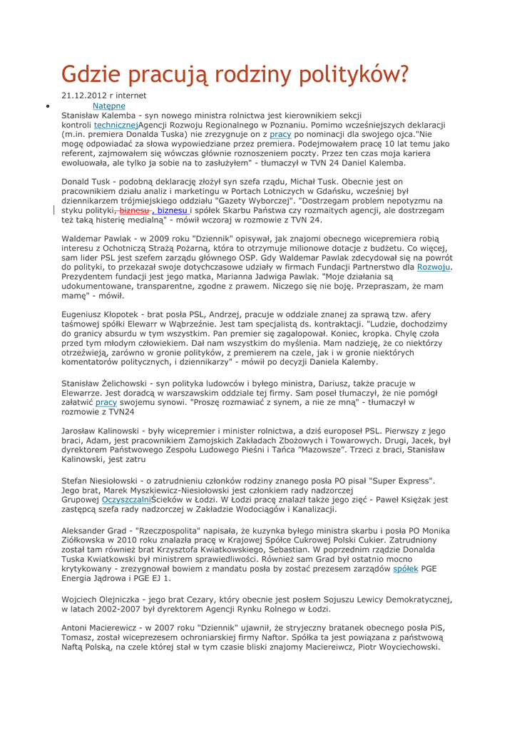 Gdzie pracują rodziny polityków? 21.12.2012 r internet Natępne Stanisław Kalemba - syn nowego ministra rolnictwa jest kierownikiem sekcji kontroli technicznejAgencji Rozwoju Regionalnego w Poznaniu. Pomimo wcześniejszych deklaracji (m.in. premiera Donalda Tuska) nie zrezygnuje on z pracy po nominacji dla swojego ojca."Nie mogę odpowiadać za słowa wypowiedziane przez premiera. Podejmowałem pracę 10 lat temu jako referent, zajmowałem się wówczas głównie roznoszeniem poczty. Przez ten czas moja kariera ewoluowała, ale tylko ja sobie na to zasłużyłem" - tłumaczył w TVN 24 Daniel Kalemba. Donald Tusk - podobną deklarację złożył syn szefa rządu, Michał Tusk. Obecnie jest on pracownikiem działu analiz i marketingu w Portach Lotniczych w Gdańsku, wcześniej był dziennikarzem trójmiejskiego oddziału "Gazety Wyborczej". "Dostrzegam problem nepotyzmu na styku polityki, biznesu , biznesu i spółek Skarbu Państwa czy rozmaitych agencji, ale dostrzegam też taką histerię medialną" - mówił wczoraj w rozmowie z TVN 24. Waldemar Pawlak - w 2009 roku "Dziennik" opisywał, jak znajomi obecnego wicepremiera robią interesu z Ochotniczą Strażą Pożarną, która to otrzymuje milionowe dotacje z budżetu. Co więcej, sam lider PSL jest szefem zarządu głównego OSP. Gdy Waldemar Pawlak zdecydował się na powrót do polityki, to przekazał swoje dotychczasowe udziały w firmach Fundacji Partnerstwo dla Rozwoju. Prezydentem fundacji jest jego matka, Marianna Jadwiga Pawlak. "Moje działania są udokumentowane, transparentne, zgodne z prawem. Niczego się nie boję. Przepraszam, że mam mamę" - mówił. Eugeniusz Kłopotek - brat posła PSL, Andrzej, pracuje w oddziale znanej za sprawą tzw. afery taśmowej spółki Elewarr w Wąbrzeźnie. Jest tam specjalistą ds. kontraktacji. "Ludzie, dochodzimy do granicy absurdu w tym wszystkim. Pan premier się zagalopował. Koniec, kropka. Chylę czoła przed tym młodym człowiekiem. Dał nam wszystkim do myślenia. Mam nadzieję, że co niektórzy otrzeźwieją, zarówno w gronie polityków, z premierem na czele, jak i w gronie niektórych komentatorów politycznych, i dziennikarzy" - mówił po decyzji Daniela Kalemby. Stanisław Żelichowski - syn polityka ludowców i byłego ministra, Dariusz, także pracuje w Elewarrze. Jest doradcą w warszawskim oddziale tej firmy. Sam poseł tłumaczył, że nie pomógł załatwić pracy swojemu synowi. "Proszę rozmawiać z synem, a nie ze mną" - tłumaczył w rozmowie z TVN24 Jarosław Kalinowski - były wicepremier i minister rolnictwa, a dziś europoseł PSL. Pierwszy z jego braci, Adam, jest pracownikiem Zamojskich Zakładach Zbożowych i Towarowych. Drugi, Jacek, był dyrektorem Państwowego Zespołu Ludowego Pieśni i Tańca ”Mazowsze”. Trzeci z braci, Stanisław Kalinowski, jest zatru Stefan Niesiołowski - o zatrudnieniu członków rodziny znanego posła PO pisał "Super Express". Jego brat, Marek Myszkiewicz-Niesiołowski jest członkiem rady nadzorczej Grupowej OczyszczalniŚcieków w Łodzi. W Łodzi pracę znalazł także jego zięć - Paweł Księżak jest zastępcą szefa rady nadzorczej w Zakładzie Wodociągów i Kanalizacji. Aleksander Grad - "Rzeczpospolita" napisała, że kuzynka byłego ministra skarbu i posła PO Monika Ziółkowska w 2010 roku znalazła pracę w Krajowej Spółce Cukrowej Polski Cukier. Zatrudniony został tam również brat Krzysztofa Kwiatkowskiego, Sebastian. W poprzednim rządzie Donalda Tuska Kwiatkowski był ministrem sprawiedliwości. Również sam Grad był ostatnio mocno krytykowany - zrezygnował bowiem z mandatu posła by zostać prezesem zarządów spółek PGE Energia Jądrowa i PGE EJ 1. Wojciech Olejniczka - jego brat Cezary, który obecnie jest posłem Sojuszu Lewicy Demokratycznej, w latach 2002-2007 był dyrektorem Agencji Rynku Rolnego w Łodzi. Antoni Macierewicz - w 2007 roku "Dziennik" ujawnił, że stryjeczny bratanek obecnego posła PiS, Tomasz, został wiceprezesem ochroniarskiej firmy Naftor. Spółka ta jest powiązana z państwową Naftą Polską, na czele której stał w tym czasie bliski znajomy Maciereiwcz, Piotr Woyciechowski. Rafał Wiechecki - w 2006 roku "Gazeta Wyborcza" informowała, że przedstawiciel ministerstwa edukacji narodowej zgłosił kandydaturę żony ówczesnego ministra gospodarki morskiej, Magdaleny, na stanowisko dyrektora Polsko-Niemieckiej Współpracy Młodzieży. Ostatecznie małżonka polityka LPR wycofała się z ubiegania o to stanowisko. Fot. AGENCJA SE/EastNews Publikacja tzw. taśm PSL oraz zamieszanie wokół odejścia z pracy z pracy syna nowego ministra rolnictwa Daniela Kalemby wzbudził zainteresowanie tym, gdzie pracują rodziny polskich polityków. Zobacz galerię zdjęć, która pokazuje, co na co dzień robią rodziny polityków! Fot. Sławomir Kamiński / Agencja Gazeta Publikacja tzw. taśm PSL oraz zamieszanie wokół odejścia z pracy syna nowego ministra rolnictwa Daniela Kalemby wzbudził zainteresowanie tym, gdzie pracują rodziny polskich polityków. Zobacz galerię zdjęć, która pokazuje, co na co dzień robią rodziny polityków! ~X: “Pośredniak platformy Obywatelskiej” poszukajcie w sieci, działacze PO nie maja problemów ze znalezieniem pracy w administracji. - W spółce Elewarr w Wąbrzeźnie pracuje Andrzej Kłopotek, brat posła Eugeniusza Kłopotka z PSL, specjalista ds. kontraktacji – wykształcenie podstawowe. - Wiesław Raboszuk, radny PO z warszawskiego Targówka został szefem Mazowieckiej Jednostki Wdrażania Programów Unijnych. Jest osobą bez doświadczeń w zarządzaniu funduszami. Wśród zatrudnionych jest ok. 60 działaczy PO z rodzinami. - Ministerstwo Finansów ogłosiło w lutym konkurs na naczelników 201 urzędów skarbowych ale to nic nie dało. Prymusi zostali odrzucenie bo nie mieli zaufania ministra. Dariusz Przysucha zdobył najwięcej punktów w konkursie, od 15 lat pracuje w skarbówce, nie dostał żadnej posady. Andrze