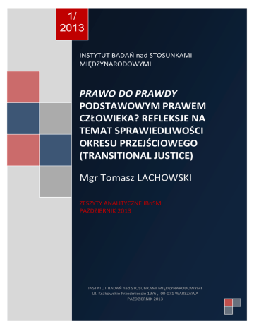 1/ 2013 INSTYTUT BADAŃ nad STOSUNKAMI MIĘDZYNARODOWYMI PRAWO DO PRAWDY PODSTAWOWYM PRAWEM CZŁOWIEKA? REFLEKSJE NA TEMAT SPRAWIEDLIWOŚCI OKRESU PRZEJŚCIOWEGO (TRANSITIONAL JUSTICE) Mgr Tomasz LACHOWSKI ZESZYTY ANALITYCZNE IBnSM PAŹDZIERNIK 2013 INSTYTUT BADAŃ nad STOSUNKAMI MIĘDZYNARODOWYMI Ul. Krakowskie Przedmieście 19/6 , 00-071 WARSZAWA PAŹDZIERNIK 2013 INSTYTUT BADAŃ NAD STOSUNKAMI MIĘDZYNARODOWYMI ZESZYTY ANALITYCZNE PAŹDZIERNIK 2013 1. Wprowadzenie Społeczeństwa post-autorytarne lub post-konfliktowe,1 w czasie nierzadko gwałtownych zmian społeczno-politycznych, stają przed wyzwaniem dokonania prawnej i moralnej oceny czasu represji (poważnych naruszeń praw człowieka) lub konfliktu. Dylemat jak i czy ścigać sprawców najpoważniejszych zbrodni prawa międzynarodowego (tzw. core crimes), pogłębiony jest o problem skonstruowania, nieobarczonej balastem politycznym, czy np. retoryką etniczno-religijną, pełnej narracji dotyczącej „mrocznej” przeszłości. Należy zauważyć, że paradygmat budowania stabilnego państwa, opartego o rządy prawa (rule of law) i wartości demokratyczne, pełnego poszanowania i zapewnienia realizacji praw człowieka, przy jednoczesnym sformułowaniu „parametrów przejścia” z systemu autorytarnego do demokracji lub „wyjścia z konfliktu”, stanowi podstawowe założenie koncepcji sprawiedliwości tranzytywnej, inaczej mówiąc, sprawiedliwości w okresie 2 przejściowym (transitional justice). Sprawiedliwość tranzytywna to pojęcie osadzone „między przeszłością a przyszłością”, właśnie w tzw. okresie przejściowym, kiedy zaspokojenie żądania ofiar (lub rodzin ofiar) poważnych naruszeń w zakresie sprawiedliwości i prawdy, musi zostać wsparte realnymi działaniami w przedmiocie zmian i reform instytucjonalnych, służących zagwarantowaniu niewystępowania podobnych naruszeń w przyszłości. Jak jednak się wydaje, nie sposób przeprowadzić pełnego procesu wdrażania mechanizmów sprawiedliwości tranzytywnej bez choćby próby wyjaśnienia okoliczności naruszeń, czy osądzenia osób winnych. Ostatnie zmiany społeczno-polityczne i dylematy państw rejonu Bliskiego Wschodu i Afryki Północnej dowodzą, że materia ta jest wciąż żywa i aktualna. Pomimo wyraźnego regresu w stosunku do początku okresu szumnie nazwanego „Arabską 1 Pomimo istotnych cech różnicujących społeczeństwa post-autorytarne i społeczeństwa post-konfliktowych, o ile inaczej nie zaznaczono w treści niniejszego opracowania, przedstawione rozważania odnoszą się do obu wskazanych grup. 2 Zob. wybrane pozycje dotyczące problematyki sprawiedliwości tranzytywnej: N. Kritz (ed.), Transitional justice: How emerging democracies reckon with former regimes, 3 vol., Washington DC, US Institute for Peace Press 1995; R. G. Teitel, Transitional justice, Oxford University Press 2001; N. Roth-Arriaza, J. Mariezcurrena (ed.), Transitional justice in the twenty-first century: Beyond truth v. justice, Cambridge University Press 2006; K. Ambos, J. Large, M. Wierda (ed.), Building a future on a peace and justice: Studies on transitional justice, peace and development, Berlin Heidelberg 2009; P. De Greiff, R. Duthie (ed.), Transitional justice and development: Making connections, Social Science Research Council, New York 2009. IBnSM Ul. Krakowskie Przedmieście 19/6 00-071 Warszawa All rights reseverd Strona 2 z 19 INSTYTUT BADAŃ NAD STOSUNKAMI MIĘDZYNARODOWYMI ZESZYTY ANALITYCZNE PAŹDZIERNIK 2013 Wiosną Ludów”, poszczególne państwa, zwłaszcza Tunezja decydują się na wprowadzanie poszczególnych mechanizmów przejścia, w tym poprzez, jak właśnie w Tunezji – co jest swoistym novum – powołanie specjalnego ministerstwa sprawiedliwości przejściowej i praw człowieka. W innych państwach regionu (Syria) sytuacja wygląda dramatycznie, ale należy zakładać, że albo przy udziale interwencji zewnętrznej, albo w skutek zmian wewnętrznych, państwo (społeczeństwo) będzie musiało zmierzyć się z demonami przeszłości, i to wcale nieodległej, bo z okresu trwającego konfliktu. Niniejsze opracowanie ma na celu przedstawienie fenomenu prawa do prawdy jako jednego z podstawowych praw człowieka, które winny być respektowane, w szczególności, w okresie przejściowym oraz jego „osadzenie” w koncepcji transitional justice. 2. Sprawiedliwość tranzytywna – założenia ogólne Pojęcie sprawiedliwości tranzytywnej wywodzi się z okresu demokratycznych przemian w państwach Ameryki Łacińskiej w latach 80. XX. wieku oraz w Europie ŚrodkowoWschodniej w dekadzie następnej.3 Warto jednak wskazać, że choć w czasie pojawienia się analizowanego pojęcia w światowym dyskursie poszukiwano alternatywnych rozwiązań do ścigania i karania osób winnych (a dosadniej mówiąc, takie było działanie wielu ustępujących lub przekształcających się rządów południowoamerykańskich)4 – wspomnieć należy choćby „popularność” komisji prawdy –to jednak korzenie transitional justice sięgają zakończenia II wojny światowej oraz dorobku Międzynarodowego Trybunału Wojskowego (MTW) w Norymberdze. Skonstruowane przez MTW, zebrane później przez ONZ, tzw. zasady norymberskie,5 podwaliny międzynarodowego prawa karnego, statuujące odpowiedzialność karną jednostek6 za najpoważniejsze zbrodnie prawa międzynarodowego, zostały jednak de facto 3 Na temat rozwoju koncepcji transitional justice, sukcesywnego umiędzynarodawiania stosowanych mechanizmów, zob. R.G. Teitel, Transitional justice genealogy, „Harvard Human Rights Journal” 2003, vol. 16, s. 69-94. 4 Wystarczy wskazać prawo (auto)amnestyjne przyjęte przez reżim generała Augusto Pinocheta w Chile. W innych państwach regionu wskazywano, że zagwarantowanie amnestii dla głównych przedstawicieli poprzedniej władzy było warunkiem sine qua non dla rozpoczęcia procesu liberalizacji życia społecznego i demokratyzacji systemu, np. 