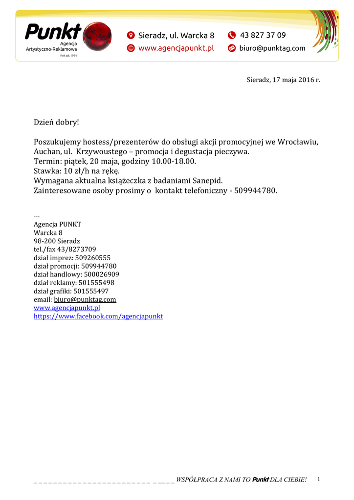 Sieradz, 17 maja 2016 r. Dzień dobry! Poszukujemy hostess/prezenterów do obsługi akcji promocyjnej we Wrocławiu, Auchan, ul. Krzywoustego – promocja i degustacja pieczywa. Termin: piątek, 20 maja, godziny 10.00-18.00. Stawka: 10 zł/h na rękę. Wymagana aktualna książeczka z badaniami Sanepid. Zainteresowane osoby prosimy o kontakt telefoniczny - 509944780. --- Agencja PUNKT Warcka 8 98-200 Sieradz tel./fax 43/8273709 dział imprez: 509260555 dział promocji: 509944780 dział handlowy: 500026909 dział reklamy: 501555498 dział grafiki: 501555497 email: [email protected] www.agencjapunkt.pl https://www.facebook.com/agencjapunkt _ _ _ _ _ _ _ _ _ _ _ _ _ _ _ _ _ _ _ _ _ _ _ _ _ __ _ _ WSPÓŁPRACA Z NAMI TO Punkt DLA CIEBIE! 1