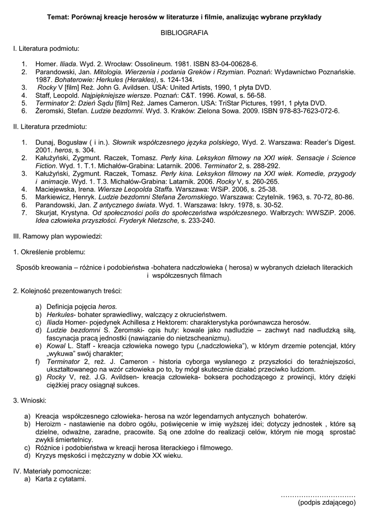 Temat: Porównaj kreacje herosów w literaturze i filmie, analizując wybrane przykłady BIBLIOGRAFIA I. Literatura podmiotu: 1. 2. 3. 4. 5. 6. Homer. Iliada. Wyd. 2. Wrocław: Ossolineum. 1981. ISBN 83-04-00628-6. Parandowski, Jan. Mitologia. Wierzenia i podania Greków i Rzymian. Poznań: Wydawnictwo Poznańskie. 1987. Bohaterowie: Herkules (Herakles), s. 124-134. Rocky V [film] Reż. John G. Avildsen. USA: United Artists, 1990, 1 płyta DVD. Staff, Leopold. Najpiękniejsze wiersze. Poznań: C&T. 1996. Kowal, s. 56-58. Terminator 2: Dzień Sądu [film] Reż. James Cameron. USA: TriStar Pictures, 1991, 1 płyta DVD. Żeromski, Stefan. Ludzie bezdomni. Wyd. 3. Kraków: Zielona Sowa. 2009. ISBN 978-83-7623-072-6. II. Literatura przedmiotu: 1. 2. 3. 4. 5. 6. 7. Dunaj, Bogusław ( i in.). Słownik współczesnego języka polskiego, Wyd. 2. Warszawa: Reader’s Digest. 2001. heros, s. 304. Kałużyński, Zygmunt. Raczek, Tomasz. Perły kina. Leksykon filmowy na XXI wiek. Sensacje i Science Fiction. Wyd. 1. T.1. Michałów-Grabina: Latarnik. 2006. Terminator 2, s. 288-292. Kałużyński, Zygmunt. Raczek, Tomasz. Perły kina. Leksykon filmowy na XXI wiek. Komedie, przygody i animacje. Wyd. 1. T.3. Michałów-Grabina: Latarnik. 2006. Rocky V, s. 260-265. Maciejewska, Irena. Wiersze Leopolda Staffa. Warszawa: WSiP. 2006, s. 25-38. Markiewicz, Henryk. Ludzie bezdomni Stefana Żeromskiego. Warszawa: Czytelnik. 1963, s. 70-72, 80-86. Parandowski, Jan. Z antycznego świata. Wyd. 1. Warszawa: Iskry. 1978, s. 30-52. Skurjat, Krystyna. Od społeczności polis do społeczeństwa współczesnego. Wałbrzych: WWSZiP. 2006. Idea człowieka przyszłości. Fryderyk Nietzsche, s. 233-240. III. Ramowy plan wypowiedzi: 1. Określenie problemu: Sposób kreowania – różnice i podobieństwa -bohatera nadczłowieka ( herosa) w wybranych dziełach literackich i współczesnych filmach 2. Kolejność prezentowanych treści: Definicja pojęcia heros. Herkules- bohater sprawiedliwy, walczący z okrucieństwem. Iliada Homer- pojedynek Achillesa z Hektorem: charakterystyka porównawcza herosów. Ludzie bezdomni S. Żeromski- opis huty: kowale jako nadludzie – zachwyt nad nadludzką siłą, fascynacja pracą jednostki (nawiązanie do nietzscheanizmu). e) Kowal L. Staff - kreacja człowieka nowego typu („nadczłowieka”), w którym drzemie potencjał, który „wykuwa” swój charakter; f) Terminator 2, reż. J. Cameron - historia cyborga wysłanego z przyszłości do teraźniejszości, ukształtowanego na wzór człowieka po to, by mógł skutecznie działać przeciwko ludziom. g) Rocky V, reż. J.G. Avildsen- kreacja człowieka- boksera pochodzącego z prowincji, który dzięki ciężkiej pracy osiągnął sukces. a) b) c) d) 3. Wnioski: a) Kreacja współczesnego człowieka- herosa na wzór legendarnych antycznych bohaterów. b) Heroizm - nastawienie na dobro ogółu, poświęcenie w imię wyższej idei; dotyczy jednostek , które są dzielne, odważne, zaradne, pracowite. Są one zdolne do realizacji celów, którym nie mogą sprostać zwykli śmiertelnicy. c) Różnice i podobieństwa w kreacji herosa literackiego i filmowego. d) Kryzys męskości i mężczyzny w dobie XX wieku. IV. Materiały pomocnicze: a) Karta z cytatami. …………………………… (podpis zdającego)