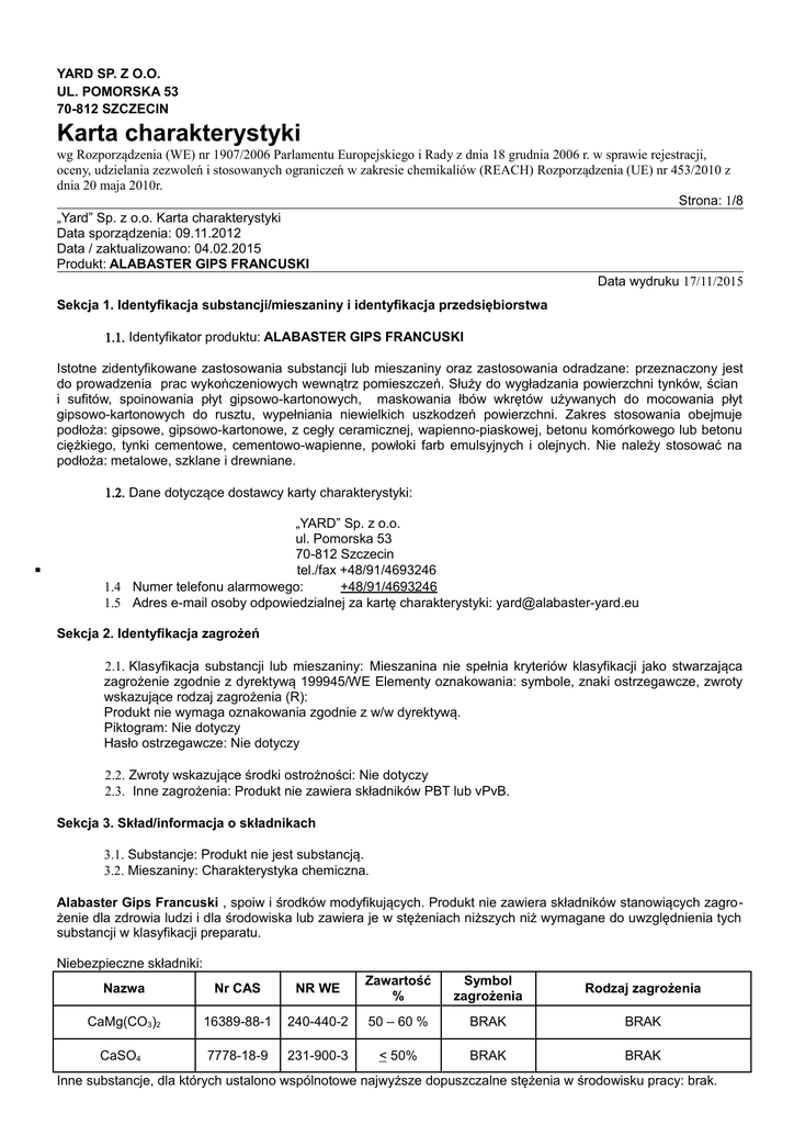 YARD SP. Z O.O. UL. POMORSKA 53 70-812 SZCZECIN Karta charakterystyki wg Rozporządzenia (WE) nr 1907/2006 Parlamentu Europejskiego i Rady z dnia 18 grudnia 2006 r. w sprawie rejestracji, oceny, udzielania zezwoleń i stosowanych ograniczeń w zakresie chemikaliów (REACH) Rozporządzenia (UE) nr 453/2010 z dnia 20 maja 2010r. Strona: 1/8 „Yard” Sp. z o.o. Karta charakterystyki Data sporządzenia: 09.11.2012 Data / zaktualizowano: 04.02.2015 Produkt: ALABASTER GIPS FRANCUSKI Data wydruku 17/11/2015 Sekcja 1. Identyfikacja substancji/mieszaniny i identyfikacja przedsiębiorstwa 1.1. Identyfikator produktu: ALABASTER GIPS FRANCUSKI Istotne zidentyfikowane zastosowania substancji lub mieszaniny oraz zastosowania odradzane: przeznaczony jest do prowadzenia prac wykończeniowych wewnątrz pomieszczeń. Służy do wygładzania powierzchni tynków, ścian i sufitów, spoinowania płyt gipsowo-kartonowych, maskowania łbów wkrętów używanych do mocowania płyt gipsowo-kartonowych do rusztu, wypełniania niewielkich uszkodzeń powierzchni. Zakres stosowania obejmuje podłoża: gipsowe, gipsowo-kartonowe, z cegły ceramicznej, wapienno-piaskowej, betonu komórkowego lub betonu ciężkiego, tynki cementowe, cementowo-wapienne, powłoki farb emulsyjnych i olejnych. Nie należy stosować na podłoża: metalowe, szklane i drewniane. 1.2. Dane dotyczące dostawcy karty charakterystyki: ▪ „YARD” Sp. z o.o. ul. Pomorska 53 70-812 Szczecin tel./fax +48/91/4693246 1.4 Numer telefonu alarmowego: +48/91/4693246 1.5 Adres e-mail osoby odpowiedzialnej za kartę charakterystyki: [email protected] Sekcja 2. Identyfikacja zagrożeń 2.1. Klasyfikacja substancji lub mieszaniny: Mieszanina nie spełnia kryteriów klasyfikacji jako stwarzająca zagrożenie zgodnie z dyrektywą 199945/WE Elementy oznakowania: symbole, znaki ostrzegawcze, zwroty wskazujące rodzaj zagrożenia (R): Produkt nie wymaga oznakowania zgodnie z w/w dyrektywą. Piktogram: Nie dotyczy Hasło ostrzegawcze: Nie dotyczy 2.2. Zwroty wskazujące środki ostrożności: Nie dotyczy 2.3. Inne zagrożenia: Produkt nie zawiera składników PBT lub vPvB. Sekcja 3. Skład/informacja o składnikach Substancje: Produkt nie jest substancją. Mieszaniny: Charakterystyka chemiczna. Alabaster Gips Francuski , spoiw i środków modyfikujących. Produkt nie zawiera składników stanowiących zagrożenie dla zdrowia ludzi i dla środowiska lub zawiera je w stężeniach niższych niż wymagane do uwzględnienia tych substancji w klasyfikacji preparatu. Niebezpieczne składniki: Nazwa Nr CAS NR WE Zawartość % Symbol zagrożenia Rodzaj zagrożenia CaMg(CO3)2 16389-88-1 240-440-2 50 – 60 % BRAK BRAK CaSO4 7778-18-9 231-900-3 < 50% BRAK BRAK Inne substancje, dla których ustalono wspólnotowe najwyższe dopuszczalne stężenia w środowisku pracy: brak. Strona: 2/8 „Yard” Sp. z o.o. Karta charakterystyki Data sporządzenia: 09.11.2012 Data / zaktualizowano: 04.02.2015 Produkt: ALABASTER GIPS FRANCUSKI Data wydruku 17/11/2015 Sekcja 4. Środki pierwszej pomocy Opis środków pierwszej pomocy: Wskazówki ogólne: w przypadku wystąpienia jakichkolwiek niepokojących objawów wezwać natychmiast lekarza lub odwieźć poszkodowanego do szpitala, pokazać opakowanie preparatu lub etykietę. a. W przypadku dostania się do dróg oddechowych: wynieść poszkodowanego ze skażonej atmosfery na świeże powietrze, zapewnić spokój i dostęp świeżego powietrza. Jeżeli wystąpią trudności w oddychaniu, natychmiast wezwać pomoc lekarską. b. Kontakt ze skórą: zdjąć skażoną odzież, przemyć skórę dużą ilością wody z mydłem i dobrze spłukać. Jeżeli wystąpią objawy podrażnienia, zwrócić się o pomoc medyczną. c. Po dostaniu się do oczu: natychmiast usunąć szkła kontaktowe, przemywać dużą ilością wody przez około 15 minut (przy odwiniętych powiekach); unikać silnego strumienia wody ze względu na ryzyko uszkodzenia rogówki; w przypadku zanieczyszczenia jednego oka chronić w trakcie przemywania drugie oko przed zanieczyszczeniem; jeżeli objawy utrzymują się wezwać lekarza. d. Spożycie/połknięcie: Osobie nieprzytomnej lub półprzytomnej nie podawać nic do picia; jeśli osoba jest przytomna, przepłukać usta i podać wodę do picia. Skonsultować się z lekarzem; w żadnym wypadku nie wolno próbować wywoływać wymiotów. 4.2. Najważniejsze ostre i opóźnione objawy oraz skutki narażenia: a. Wdychanie: przewlekłe zapalenie błon śluzowych nosa, gardła i krtani, astma oskrzelowa, pylica, rozedma płuc. b. Kontakt ze skórą: dłuższy kontakt może powodować wysuszenie, podrażnienie skóry. c. Kontakt z okiem: ryzyko uszkodzenia rogówki. d. Spożycie/połknięcie: oparzenia jamy ustnej i przełyku. 4.3. Wskazania dotyczące wszelkiej natychmiastowej pomocy lekarskiej i szczególnego postępowania z poszkodowanym: w przypadku wystąpienia jakichkolwiek niepokojących objawów natychmiast wezwać pomoc medyczną, pokazać opakowanie, etykietę lub kartę charakterystyki. Sekcja 5. Postępowanie w przypadku pożaru Produkt nie jest palny i nie podsyca pożaru. Środki gaśnicze: Odpowiednie środki gaśnicze: produkt nie jest palny. Stosować środki gaśnicze właściwe dla otaczających materiałów. Woda-rozproszone prądy wodne, proszki gaśnicze, gaśnice pianowe, gaśnice śniegowe piasek. Zagrożone pożarem opakowania chłodzić rozpyloną wodą. Niewłaściwie środki gaśnicze: zwarte strumienie wody. 5.2. Szczególne zagrożenia związane z substancją lub mieszaniną: unikać wdychania pyłów, dymów i gazów wytwarzających się podczas pożaru. Informacje dla straży pożarnej: postępować zgodnie z procedurami obowiązującymi podczas gaszenia chemikaliów. Podczas pożaru mogą powstawać substancje szkodliwe dla zdrowia. Nie dopuszczać do przed ostania się ścieków po gaszeniu pożaru do kanalizacji i wód. Ścieki i pozostałości po pożarze usuwać zgodnie z obowiązującymi przepis