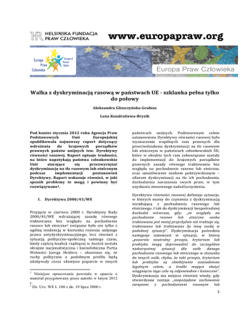 www.europapraw.org Walka z dyskryminacją rasową w państwach UE -‐ szklanka pełna tylko do połowy Aleksandra Gliszczyńska-‐Grabias Lena Kondratiewa-‐Bryzik Pod koniec stycznia 2012 roku Agencja Praw Podstawowych Unii Europejskiej opublikowała najnowszy raport dotyczący wdrożenia do krajowych porządków prawnych państw unijnych tzw. Dyrektywy równości rasowej. Raport opisuje trudności, na które napotykają państwa członkowskie Unii starające się przezwyciężać dyskryminację na tle rasowym lub etnicznym podczas implementacji postanowień Dyrektywy. Raport wskazuje również, w jaki sposób problemy te mogą i powinny być rozwiązywane1. państwach unijnych. Podstawowym celem ustanowienia Dyrektywy równości rasowej było wyznaczenie wspólnych ram prawnych dla przeciwdziałania dyskryminacji na tle rasowym lub etnicznym w państwach członkowskich UE, które w obrębie tych ram zobowiązane zostały do implementacji do krajowych porządków prawnych zasady równego traktowania bez względu na pochodzenie rasowe lub etniczne, oraz umożliwienie osobom pokrzywdzonym – ofiarom dyskryminacji na tle ich pochodzenia, dochodzenia naruszenia swych praw, w tym uzyskania stosownego zadośćuczynienia. Dyrektywa równości rasowej definiuje sytuacje, w których mamy do czynienia z dyskryminacją wynikającą z pochodzenia rasowego lub etnicznego. I tak do dyskryminacji bezpośredniej dochodzi wówczas, gdy: „ze względu na pochodzenie rasowe lub etniczne osoba traktowana jest mniej przychylnie niż traktuje się, traktowano lub traktowano by inną osobę w podobnej sytuacji”. Dyskryminacja pośrednia następuje natomiast w sytuacji, w której „pozornie neutralny przepis, kryterium lub praktyka mogą doprowadzić do szczególnie niekorzystnej sytuacji dla osób danego pochodzenia rasowego lub etnicznego w stosunku do innych osób, chyba, że taki przepis, kryterium lub praktyka są obiektywnie uzasadnione legalnym celem, a środki mające służyć osiągnięciu tego celu są odpowiednie i konieczne”. Dyskryminacja ma miejsce również wtedy, gdy stwierdzone zostaje „niepożądane zachowanie związane z pochodzeniem rasowym lub 1. Dyrektywa 2000/43/WE Przyjęcie w czerwcu 2000 r. Dyrektywy Rady 2000/43/WE wdrażającej zasadę równego traktowania bez względu na pochodzenie rasowe lub etniczne2 związane było nie tylko z ogólną tendencją w kierunku rozwoju unijnego prawa antydyskryminacyjnego, lecz również z sytuacją polityczno-‐społeczną tamtego czasu, kiedy częścią koalicji rządzącej w Austrii została skrajnie nacjonalistyczna i ksenofobiczna Partia Wolności Joerga Heidera – obawiano się, że ruchy polityczne o podobnym profilu będą zdobywały coraz silniejsze poparcie w innych 1 Niniejsze opracowanie powstało w oparciu o materiał przygotowany przez autorki w lutym 2012 r. 2 Dz. Urz. WE L 180 z dn. 19 lipca 2000 r. 1 etnicznym, a jego celem lub skutkiem jest naruszenie godności osoby i stworzenie onieśmielającej, wrogiej, poniżającej, upokarzającej lub uwłaczającej atmosfery” oraz gdy inne osoby zmuszane są do zachowań dyskryminacyjnych wobec innych osób ze względu na ich pochodzenie rasowe lub etniczne. Dyrektywa jest instrumentem prawnym o szerokim zakresie. Jej przepisy objęły zakaz dyskryminacji ze względu na pochodzenie rasowe lub etniczne m.in. w obszarach: zatrudnienia (w tym w odniesieniu do prowadzenia działalności gospodarczej na własny rachunek, uprawiania swojego zawodu, warunków zatrudnienia i pracy, w tym warunków zwalniania i wynagradzania pracowników), korzystania z opieki społecznej i zdrowotnej, edukacji, jak również dostępu do dóbr i usług oraz dostarczania dóbr i usług publicznie dostępnych, włącznie z mieszkalnictwem. Dyrektywa zobowiązała państwa do umożliwienia ofiarom dyskryminacji skutecznego dostępu do adekwatnych środków ochrony prawnej ( w wymiarze sądowym i administracyjnym), w tym do składania skarg oraz do ustanowienia w prawie krajowym adekwatnych kar dla osób łamiących prawo i dopuszczających się dyskryminacji. Przewidziano ponadto tworzenie przez władze krajowe wyspecjalizowanych organów równościowych, które będą zajmować się sprawami dotyczącymi wszystkich wymienionych powyżej obszarów w obrębie przedmiotu Dyrektywy3. Na czym polega implementacja Dyrektywy? Czyli, innymi słowy, co państwo musi zrobić, aby spełnić swoje zobowiązania wynikające z tego instrumentu prawnego? Dyrektywa wprowadza określone narzędzia do walki z dyskryminacją na tle rasowym lub etnicznym. Jak już wspomniano, nakłada na państwa członkowskie obowiązek wprowadzenia do swojego ustawodawstwa zakazu dyskryminacji ze względów rasowych lub etnicznych oraz podjęcie czynnych działań w celu zwalczania takiej dyskryminacji. Działania te obejmują 3 Ponadto, Dyrektywa w art. 5 stanowi: „Dla zapewnienia całkowitej równości w praktyce zasada równego traktowania nie stanowi przeszkody w utrzymywaniu lub przyjmowaniu przez Państwo Członkowskie szczególnych środków mających zapobiegać lub wyrównywać niedogodności związane z pochodzeniem rasowym lub etnicznym”. wprowadzenie stosownych sądowych i administracyjnych procedur, ustanowienie sankcji, które muszą być skuteczne, proporcjonalne i odstraszające. Bardzo ważnym instrumentem jest przesunięcie ciężaru dowodu w sprawach o dyskryminację ze skarżącego na osobę lub instytucję, której zarzuca się działania dyskryminujące. Skarżący musi jedynie udowodnić prawdopodobieństwo istnienia dyskryminacji. 2. Zasadnicze deficyty implementacji Najnowszy Raport Agencji Praw Podstawowych UE (APP)4 na temat implementacji Dyrektywy równości rasowej jest kontynuacją badań prowadzonych przez APP od momentu uchwalenia Dyrektywy w 2010 r.5. W raporcie opublikowanym w styczniu 2012 r. podkreśla się, że w dużej mierze tzw. nowe państwa członkowskie, w tym Polska, mają problemy z peł