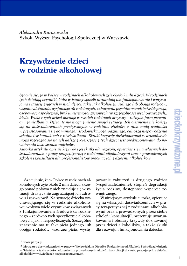 Aleksandra Karasowska Szkoła Wyższa Psychologii Społecznej w Warszawie Krzywdzenie dzieci w rodzinie alkoholowej Szacuje się, że w Polsce w rodzinach alkoholowych żyje około 2 mln dzieci. W rodzinach tych działają czynniki, które w istotny sposób utrudniają ich funkcjonowanie i wpływają na sytuację żyjących w nich dzieci, takie jak alkoholizm jednego lub obojga rodziców, wspołuzależnienie, dysfunkcje ról rodzinnych, zaburzenia psychiczne rodziców (depresja, osobowość aspołeczna), brak umiejętności życiowych (w szczególności wychowawczych), bieda. Wiele z tych dzieci doznaje w swoich rodzinach krzywdy – różnych form przemocy i zaniedbania. Dzieci te nie mogą zmienić swojej sytuacji. Ich cierpienie nie kończy się na doświadczeniach przeżywanych w rodzinie. Niektóre z nich mają trudności w przystosowaniu się do wymagań środowiska pozarodzinnego, odnoszą niepowodzenia szkolne i w kontaktach z rówieśnikami. Skutki krzywdy doświadczonej w dzieciństwie mogą rozciągać się na ich dalsze życie. Część z tych dzieci jest predysponowana do powtórzenia losu swoich rodziców. Autorka artykułu opisuje krzywdę i jej skutki dla rozwoju, opierając się na własnych doświadczeniach z pracy terapeutycznej z rodzinami alkoholowymi oraz z prowadzonych szkoleń i konsultacji dla profesjonalistów pracujących z dziećmi alkoholików. Szacuje się, że w Polsce w rodzinach alkoholowych żyje około 2 mln dzieci, z czego ponad połowa z nich znajduje się w sytuacji drastycznie zagrażającej ich zdrowiu i rozwojowi1. Na sytuację dziecka wychowującego się w rodzinie alkoholowej wpływa wiele czynników związanych z funkcjonowaniem środowiska rodzinnego – zarówno tych specyficznie alkoholowych, jak i niespecyficznych. Szczególne znaczenie ma tu fakt picia jednego lub obojga rodziców, wzorzec picia, wystę1 powanie zaburzeń u drugiego rodzica (współuzależnienie), stopień degradacji życia rodziny, dostępność wsparcia zewnętrznego. W niniejszym artykule autorka, opierając się na własnych doświadczeniach w pracy terapeutycznej z rodzinami alkoholowymi oraz z prowadzonych przez siebie szkoleń i konsultacji2, prezentuje uwarunkowania i obszary krzywdy doznawanej przez dzieci alkoholików, a także skutki dla rozwoju i funkcjonowania dziecka. www.parpa.pl. 2 Mowa tu o doświadczeniach w pracy w Wojewódzkim Ośrodku Uzależnienia od Alkoholu i Współuzależnienia w Gdańsku, a także o doświadczeniach z prowadzonych szkoleń i konsultacji dla osób pracujących z dziećmi alkoholików w świetlicach socjoterapeutycznych. 1 Karasowska / Krzywdzenie dzieci w rodzinie alkoholowej Czynniki działające w rodzinie alkoholowej, które mają wpływ na krzywdę dziecka Alkoholizm Osoba uzależniona pije w sposób niekontrolowany, niszcząc siebie i rodzinę. W miarę rozwoju choroby coraz bardziej traci kontrolę nad swoim zachowaniem, może także pojawić się agresja, która prowadzi do przemocy. Życie rodziny koncentruje się na alkoholiku, na zapobieganiu piciu lub neutralizowaniu jego skutków. Wzór picia w istotny sposób wpływa na poziom destrukcji w rodzinie – upijanie się, połączone z agresją i nieprzewidywalnym zachowaniem, może być bardziej uciążliwe dla bliskich osób, niż zamykanie się z butelką w pokoju i wycofywanie z życia rodzinnego. Długotrwałe ciągi alkoholowe na przemian z okresami abstynencji skazują rodzinę na życie jak na huśtawce. Ogromne znaczenie ma fakt picia jednego lub obojga rodziców. Dziecko mające pozytywny związek z choćby jednym tylko opiekunem, może być odporniejsze na dysfunkcyjne oddziaływanie rodziny niż takie, które nie ma nawet tego (Bushweller 1995). W sytuacji kiedy piją oboje rodzice, spożywanie alkoholu staje się normą, co bardzo zwiększa prawdopodobieństwo przekazania dziecku negatywnych wzorców rodzinnych. Ponadto, kiedy degradacja wywołana uzależnieniem dotyczy obojga rodziców, maleją szanse dziecka na otrzymanie opieki i wsparcia w rodzinie. Współuzależnienie Ważne z punktu widzenia sytuacji dziecka jest funkcjonowanie współmałżonka alkoholika. Dla wielu dzieci w rodzinach alkoholików niepijąca matka jest jedynym źródłem oparcia. Niestety, często pi- cie męża znacząco wpływa na jej zachowanie i kondycję psychiczną. U wielu żon alkoholików rozwija się zaburzenie przystosowania, zwane współuzależnieniem3, które upośledza funkcjonowanie w roli matki. Koncentracja na alkoholiku, kontrolowanie go, walka o butelkę, pochłania całą energię i uwagę, doprowadzając do zaniedbywania potrzeb dzieci. Dysfunkcyjny system rodzinny Rodzina alkoholowa jest systemem dysfunkcyjnym, którym rządzą sztywne reguły, służące utrzymaniu chorej równowagi: – „nie mów”, czyli zachowaj milczenie na temat tego, co dzieje się w rodzinie; – „nie ufaj” zarówno członkom własnej rodziny, jak i obcym, ponieważ zaufanie zagraża doznaniem krzywdy; – „nie odczuwaj”, to znaczy nie zagłębiaj się we własne emocje (bądź „twardy”). Życie członków rodziny jest podporządkowane konieczności utrzymania tajemnicy, obejmującej picie i jego skutki, tzw. tabu. Rodzina zaprzecza problemom, ukrywa je przed światem zewnętrznym, co prowadzi do izolacji i zmniejszenia szansy na otrzymanie pomocy. Zarówno osoby uzależnione, jak i współuzależnione w sposób destrukcyjny pełnią role rodzinne – małżeńskie i rodzicielskie. W relacji między małżonkami dochodzi do częstych konfliktów, które kończą się awanturami lub zerwaniem kontaktu. W tych rozgrywkach dzieci stają się obiektem manipulacji ze strony rodziców. Wszyscy członkowie rodziny 3 Trwała adaptacja do stresora, jakim jest osoba pijąca i jej zachowanie, staje się przyczyną wystąpienia stałych zaburzeń przystosowania u dorosłych członków rodziny alkoholika. Mimo iż współuzależnienie nie zostało jeszcze wpisane przez Światową Organi