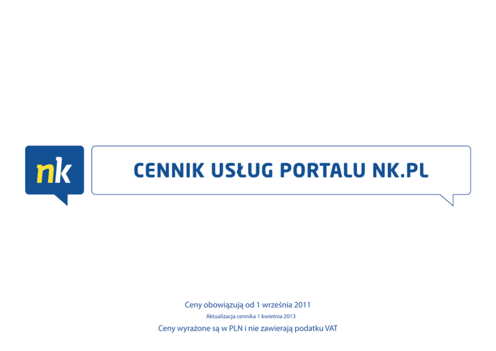 Ceny obowiązują od 1 września 2011 Aktualizacja cennika 1 kwietnia 2013 Ceny wyrażone są w PLN i nie zawierają podatku VAT NK.PL - zbiór narzędzi do pracy z marką ......................................................................................................................................................... 03 Budowanie zaangażowania ............................................................................................................................................................................... 04 Nośniki reklamowe ............................................................................................................................................................................................. 06 Pakiety zasięgowe .............................................................................................................................................................................................. 07 Kampanie targetowane ...................................................................................................................................................................................... 08 EasyAd - reklama samoobsługowa ................................................................................................................................................................ 11 Kampanie na Stronie Głównej portalu ............................................................................................................................................................. 12 Usługi dodatkowe ............................................................................................................................................................................................... 14 Reklama w wersji mobilnej portalu NK ............................................................................................................................................................ 15 Reklama w komunikatorze NKtalk .................................................................................................................................................................... 16 Potencjał Research.NK ...................................................................................................................................................................................... 17 Oferta badawcza ................................................................................................................................................................................................. 18 Definicje............................................................................................................................................................................................................... 23 02/23 Nk.pl to największy polski serwis społecznościowy w Internecie, odwiedzany miesięcznie przez 9 mln Użytkowników. Skierowany jest głównie do osób, które chcą korzystać z prostych i innowacyjnych narzędzi komunikacji. Początki portalu to odnajdywanie dawnych znajomych ze szkoły. Aktualnie NK jest wielokanałową i wielopłaszczyznową platformą komunikacyjną, która oferuje Użytkownikom zintegrowane narzędzia np.: wiadomości, mikroblog, komunikator NKtalk, aplikacje mobilne, grupy, gry. sprzedażowy (np. ułatwienie polecenia i zakupu produktu, nagradzanie za rekomendację, zakupy grupowe). Wykorzystanie wirtualnych dóbr dostępnych w serwisie jako motywatorów do zakupu. Istnieje możliwość przeprowadzenia kampanii displayowej w rozliczeniu CPC oraz CPA. Reklamodawca może prowadzić kompleksowe działania w nk.pl, korzystając ze spektrum oferowanych narzędzi: możliwości badawcze na polu analizy konsumentów, marek, produktów i komunikacji budowanie zaangażowania oraz relacji - mechanizmy społecznościowe umożliwiające prowadzenie dialogu z Użytkownikiem budowanie zasięgu budowanie wizerunku - wysoka częstotliwość i długi czas kontaktu z reklamą przez Użytkownika, możliwość emisji kreacji wizerunkowych na dużych formatach reklamowych precyzyjne targetowanie reklamy według kryteriów m.in.: wieku, płci, miejsca zamieszkania, profilu wykształcenia. Bazowanie na wiarygodnych informacjach generowanie sprzedaży dzięki synergii powyższych elementów oraz wykorzystaniu dedykowanych narzędzi wzmacniających efekt 03/23 GRUPY Grupy na NK służą do tworzenia małych społeczności zgromadzonych wokół wspólnych zainteresowań. Grupy zawierają narzędzia do prowadzenia dialogu marki z Użytkownikiem (forum, mikroblog), a także funkcjonalności pozwalające na personalizowanie wyglądu np.: zmiana kolorystyki, moduły video, statyczny banner graficzny. Istnieje możliwość nadania Grupie statusu Grupy Oficjalnej, w tym celu prosimy o kontakt pod adresem: [email protected] Funkcjonalności w Grupach Oficjalnych: forum video wpisy (mikroblog) galeria zdjęć sonda widżet Grupy Tabela 1. GRUPY Założenie i utrzymanie Grupy Promocja Grupy Usługi dodatkowe: Możliwość wyłączenia obcych reklam Zamieszczenie screeningu Podpięcie zewnętrznych statystyk Zamieszczenie modułów graficznych linkujących do stron zewnętrznych Nadanie krótkiej nazwy w adresie Grupy (łatwy url: nk.pl/nazwa) Zamieszczenie aplikacji Zorganizowania konkursu 0 zł wg cennika 10 000 zł/miesiąc prosimy o kontakt pod adresem: [email protected] 04/23 CENNIK AKCJE SPECJALNE Ogromny potencjał aktywnych Użytkowników umożliwia przeprowadzanie zróżnicowanych, niestandardowych działań reklamowych. Dzięki temu istnieje możliwość dotarcia z przekazem za pomocą mniej inwazyjnych i lepiej odbieranych form, w oparciu o mechanizmy portalu m.in.: grupy, szkoły, aplikacje, gry. Na potrzeby danej akcji może zostać przygotowana dedykowana sekcja z indywidualnie zaprojektowaną grafiką oraz zaimplementowanymi mechanizmami społecznościowymi portalu, np.: możliwość implementacji projektu przygotowanego 