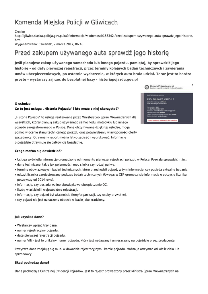 Komenda Miejska Policji w Gliwicach Źródło: http://gliwice.slaska.policja.gov.pl/ka9/informacje/wiadomosci/156342,Przed-zakupem-uzywanego-auta-sprawdz-jego-historie. html Wygenerowano: Czwartek, 2 marca 2017, 06:46 Przed zakupem używanego auta sprawdź jego historię Jeśli planujesz zakup używanego samochodu lub innego pojazdu, pamiętaj, by sprawdzić jego historię – od daty pierwszej rejestracji, przez terminy kolejnych badań technicznych i zawierania umów ubezpieczeniowych, po ostatnie wydarzenia, w których auto brało udział. Teraz jest to bardzo proste – wystarczy zajrzeć do bezpłatnej bazy - historiapojazdu.gov.pl O usłudze Co to jest usługa „Historia Pojazdu" i kto może z niej skorzystać? „Historia Pojazdu" to usługa realizowana przez Ministerstwo Spraw Wewnętrznych dla wszystkich, którzy planują zakup używanego samochodu, motocyklu lub innego pojazdu zarejestrowanego w Polsce. Dane otrzymywane dzięki tej usłudze, mogą pomóc w ocenie stanu technicznego pojazdu oraz potwierdzeniu wiarygodności oferty sprzedawcy. Otrzymany raport można łatwo zapisać i wydrukować. Informacje o pojeździe otrzymuje się całkowicie bezpłatnie. Czego można się dowiedzieć? ● Usługa wyświetla informacje gromadzone od momentu pierwszej rejestracji pojazdu w Polsce. Pozwala sprawdzić m.in.: ● dane techniczne, takie jak pojemność i moc silnika czy rodzaj paliwa, ● terminy obowiązkowych badań technicznych, które przechodził pojazd, w tym informację, czy posiada aktualne badanie, ● odczyt licznika zarejestrowany podczas badań technicznych (Uwaga: w CEP gromadzi się informacje o odczycie licznika począwszy od 2014 roku), ● informację, czy posiada ważne obowiązkowe ubezpieczenie OC, ● liczbę właścicieli i województwo rejestracji, ● informację, czy pojazd był własnością firmy/organizacji, czy osoby prywatnej, ● czy pojazd nie jest oznaczony obecnie w bazie jako kradziony. Jak uzyskać dane? ● Wystarczy wpisać trzy dane: ● numer rejestracyjny pojazdu, ● datę pierwszej rejestracji pojazdu, ● numer VIN - jest to unikalny numer pojazdu, który jest nadawany i umieszczany na pojeździe przez producenta. Powyższe dane znajdują się m.in. w dowodzie rejestracyjnym i karcie pojazdu. Można je otrzymać od właściciela lub sprzedawcy. Skąd pochodzą dane? Dane pochodzą z Centralnej Ewidencji Pojazdów. Jest to rejestr prowadzony przez Ministra Spraw Wewnętrznych na podstawie przepisów ustawy Prawo o ruchu drogowym. Dane do Ewidencji przekazywane są od 2004 r. przez kilka tysięcy niezależnych od Ministra Spraw Wewnętrznych podmiotów, korzystających z różnych narzędzi teleinformatycznych, co w niektórych przypadkach może powodować niezgodności danych. Prace nad usunięciem możliwych niezgodności danych zawartych w CEPiK są przedmiotem projektu CEPiK 2.0 i docelowo mają doprowadzić do znacznego ich ograniczenia. Otrzymane w ramach raportu informacje nie powinny być jedynym kryterium decyzji o zakupie pojazdu, mogą one jednak znacząco pomóc kupującemu w ocenie oferty. źrodło: historiapojazdu.gov.pl Ocena: 5/5 (1) Tweetnij