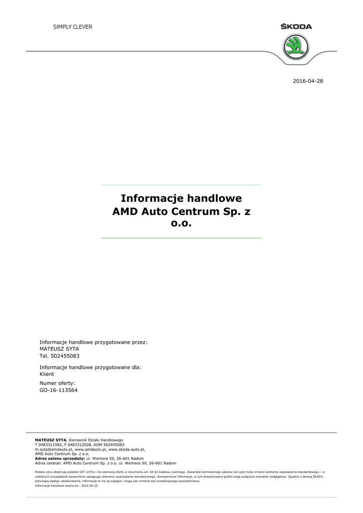 2016-04-28 Informacje handlowe AMD Auto Centrum Sp. z o.o. Informacje handlowe przygotowane przez: MATEUSZ SYTA Tel. 502455083 Informacje handlowe przygotowane dla: Klient Numer oferty: GO-16-113564 MATEUSZ SYTA, Kierownik Działu Handlowego T 0483311582, F 0483312028, KOM 502455083 [email protected], www.amdauto.pl, www.skoda-auto.pl, AMD Auto Centrum Sp. z o.o. Adres salonu sprzedaży: ul. Wernera 59, 26-601 Radom Adres centrali: AMD Auto Centrum Sp. z o.o. ul. Wernera 59, 26-601 Radom Podane ceny obejmują podatek VAT (23%) i nie stanowią oferty w rozumieniu art. 66 §1 kodeksu cywilnego. Zawartość domówionego pakietu lub opcji może zmienić elementy wyposażenia standardowego – w niektórych przypadkach bezzwrotnie zastępując elementy wyposażenia standardowego. Zamieszczone informacje, w tym prezentowane grafiki mają wyłącznie charakter podglądowy. Zgodnie z dewizą ŠKODY, dotyczącą stałego udoskonalania, informacje te nie są wiążące i mogą ulec zmianie bez wcześniejszego powiadomienia. Informacje handlowe ważne do : 2016-04-29 2016-04-28 INFORMACJA HANDLOWA DOTYCZĄCA SAMOCHODÓW MARKI ŠKODA Szanowni Państwo, w nawiązaniu do naszych ustaleń dotyczących obecnych potrzeb zakupowych, mamy przyjemność przedstawić Państwu informację handlową dotyczącą samochodów naszej marki. Każdy z prezentowanych przez nas modeli może zostać wzbogacony o liczne dodatkowe opcje wyposażenia zarówno fabrycznego jak i akcesoryjnego, w zależności od Państwa potrzeb i życzeń. Poniżej znajdziecie Państwo wybrane i najbardziej popularne opcje do każdego z aut. Prosimy, aby w ramach prowadzonych analiz porównawczych zechcieli Państwo wziąć powyższe pod uwagę. Mamy nadzieję, że przedstawione przez nas informacje spotkają się z Państwa zainteresowaniem. W razie jakichkolwiek pytań lub wątpliwości pozostajemy do Państwa dyspozycji. Z poważaniem, MATEUSZ SYTA Tel. 502455083 MATEUSZ SYTA, Kierownik Działu Handlowego T 0483311582, F 0483312028, KOM 502455083 [email protected], www.amdauto.pl, www.skoda-auto.pl, AMD Auto Centrum Sp. z o.o. Adres salonu sprzedaży: ul. Wernera 59, 26-601 Radom Adres centrali: AMD Auto Centrum Sp. z o.o. ul. Wernera 59, 26-601 Radom Podane ceny obejmują podatek VAT (23%) i nie stanowią oferty w rozumieniu art. 66 §1 kodeksu cywilnego. Zawartość domówionego pakietu lub opcji może zmienić elementy wyposażenia standardowego – w niektórych przypadkach bezzwrotnie zastępując elementy wyposażenia standardowego. Zamieszczone informacje, w tym prezentowane grafiki mają wyłącznie charakter podglądowy. Zgodnie z dewizą ŠKODY, dotyczącą stałego udoskonalania, informacje te nie są wiążące i mogą ulec zmianie bez wcześniejszego powiadomienia. Informacje handlowe ważne do : 2016-04-29 ŠKODA Citigo Monte Carlo 5-drzwiowy Monte Carlo Kolor: Czerwień Tornado Niemetalizowany Wersja wnętrza: Monte Carlo ID Konfiguracji: SA1179404 Silnik: 1.0 MPI 55 kW (75 KM) 5-biegowa manualna 45 570 zł Cena podstawowa: 0 zł Cena koloru nadwozia: 150 zł Wyposażenie dodatkowe: 1. Przygotowanie pod system nawigacji satelitarnej Move&Fun 150 zł 0 zł 0 zł Usługi: 1. Gwarancja Mobilności 45 720 zł RAZEM: 1 000 zł Rabaty: 44 720 zł CENA*: Uwagi: Rok 2016 Podane ceny są cenami: brutto MATEUSZ SYTA, Kierownik Działu Handlowego T 0483311582, F 0483312028, KOM 502455083 [email protected], www.amdauto.pl, www.skoda-auto.pl, AMD Auto Centrum Sp. z o.o. Adres salonu sprzedaży: ul. Wernera 59, 26-601 Radom Adres centrali: AMD Auto Centrum Sp. z o.o. ul. Wernera 59, 26-601 Radom Podane ceny obejmują podatek VAT (23%) i nie stanowią oferty w rozumieniu art. 66 §1 kodeksu cywilnego. Zawartość domówionego pakietu lub opcji może zmienić elementy wyposażenia standardowego – w niektórych przypadkach bezzwrotnie zastępując elementy wyposażenia standardowego. Zamieszczone informacje, w tym prezentowane grafiki mają wyłącznie charakter podglądowy. Zgodnie z dewizą ŠKODY, dotyczącą stałego udoskonalania, informacje te nie są wiążące i mogą ulec zmianie bez wcześniejszego powiadomienia. Informacje handlowe ważne do : 2016-04-29 Wyposażenie standardowe Bezpieczeństwo, funkcjonalność, komfort SUNSET - tylne szyby o wyższym stopniu przyciemnienia Boczne poduszki bezpieczeństwa z funkcją ochrony głowy dla przednich foteli Schowek w desce rozdzielczej po stronie pasażera, zamykany Climatic - klimatyzacja manualna z filtrem powietrza Składane, dzielone oparcie tylnej kanapy Czołowa poduszka powietrzna kierowcy i pasażera Sportowe zawieszenie Cztery haczyki w przestrzeni bagażowej Sygnalizacja niezapiętych pasów z przodu Dwa uchwyty na butelki przy zewnętrznych miejscach tylnej kanapy Światła do jazdy dziennej Dwa zagłówki na zewnętrznych miejscach tylnej kanapy z możliwością regulacji TPM - system kontroli ciśnienia w oponach ESP (HHC, ABS, EBV, MSR, ASR, HBA, EDS) Trzypunktowe pasy bezpieczeństwa dla przednich foteli oraz tylnej kanapy (przednie pasy z napinaczami pirotechniczymi z ogranczeniem sily napięcia) Elektromechaniczne wspomaganie układu kierowniczego Uchwyt na fotografie Elektrycznie sterowane szyby z przodu Uchwyt na kwity parkingowe Fotel kierowcy z możliwością regulacji na wysokość Uchwyt na torbę w pokrywie schowka po stronie pasażera Fotele przednie ze zintegrowanymi zagłówkami Uchwyty ISOFIX na zewnętrznych miejscach tylnej kanapy z uchwytami Top Tether od strony bagażnika (w oparciu tylnej kanapy) Gniazdo 12V w konsoli środkowej Haczyki w słupkach B Immobiliser Kieszenie na drobne przedmioty na zewnętrznych częściach foteli przednich Komputer pokładowy Manualnie sterowane lusterka boczne Osłona przeciwsłoneczna kierowcy, osłona przeciwsłoneczna pasażera z lusterkiem Oświetlenie wnętrza w przedniej części podsufitki Półka nad częścią bagażową Przednie światła przeciwmgłowe Przygotowanie pod radioodtwarzacz (dwa głośniki z pr