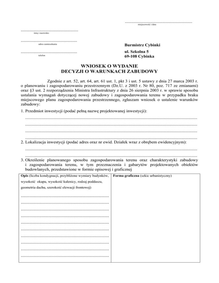 ............................................................. miejscowość i data .................................................... imię i nazwisko ................................................... adres zamieszkania Burmistrz Cybinki ................................................... telefon ul. Szkolna 5 69-108 Cybinka WNIOSEK O WYDANIE DECYZJI O WARUNKACH ZABUDOWY Zgodnie z art. 52, art. 64, art. 61 ust. 1, pkt 3 i ust. 5 ustawy z dnia 27 marca 2003 r. o planowaniu i zagospodarowaniu przestrzennym (Dz.U. z 2003 r. Nr 80, poz. 717 ze zmianami) oraz §3 ust. 2 rozporządzenia Ministra Infrastruktury z dnia 26 sierpnia 2003 r. w sprawie sposobu ustalania wymagań dotyczącej nowej zabudowy i zagospodarowania terenu w przypadku braku miejscowego planu zagospodarowania przestrzennego, zgłaszam wniosek o ustalenie warunków zabudowy: 1. Przedmiot inwestycji (podać pełną nazwę projektowanej inwestycji): ............................................................................................................................................................ ............................................................................................................................................................ ............................................................................................................................................................ ............................................................................................................................................................ 2. Lokalizacja inwestycji (podać adres oraz nr ewid. Działek wraz z obrębem ewidencyjnym): ............................................................................................................................................................ ............................................................................................................................................................ 3. Określenie planowanego sposobu zagospodarowania terenu oraz charakterystyki zabudowy i zagospodarowania terenu, w tym przeznaczenia i gabarytów projektowanych obiektów budowlanych, przedstawione w formie opisowej i graficznej Opis (liczba kondygnacji, przybliżone wymiary budynków, wysokość okapu, wysokość kalenicy, rodzaj poddasza, geometria dachu, szerokość elewacji frontowej) ................................................................................ ................................................................................ ................................................................................ ................................................................................ ................................................................................ ................................................................................ ................................................................................ ................................................................................ ................................................................................ ................................................................................ Forma graficzna (szkic urbanistyczny) 4. Zapotrzebowanie w zakresie infrastruktury technicznej (woda, energia, sposób odprowadzania lub oczyszczania ścieków, gaz, sposób unieszkodliwiania odpadów, dojazd z drogi publicznej, inne) ............................................................................................................................................................ ............................................................................................................................................................ ............................................................................................................................................................ ……………………………………………………………………………………………………… 5. Charakterystyczne parametry techniczne inwestycji, dane charakteryzujące jej wpływ na środowisko: ............................................................................................................................................................ ............................................................................................................................................................ ............................................................................................................................................................ 6. W przypadku planowanej budowy obiektu handlowego, określenie powierzchni sprzedaży: ............................................................................................................................................................ 7. Informacja dodatkowa – dane dotyczące władającego terenem: ............................................................................................................................................................ ............................................................................................................................................................ Załączniki do wniosku: Nr 1 –2 egz. kopii mapy zasadniczej lub w przypadku jej braku, kopii mapy katastralnej, przyjętych do państwowego zasobu geodezyjnego i kartograficznego, obejmujących:  teren, którego wniosek dotyczy,  wraz z obszarem wokół działki objętej wnioskiem ,w odległości równej co najmniej trzykrotnej szerokości frontu działki, nie mniejszej jednak niż 50 m,  a także obejmujących obszar, na który ta inwestycja będzie oddziaływać, w skali 1:500 lub 1:1000, w stosunku do inwestycji liniowych, również w skali 1:2000. Nr 2 – Graficzny obraz elewacji projektowanego budynku, Nr 3 – Graficzna koncepcja zagospodarowania działki( usytuowanie dojść i dojazdów, ogrodzenie, altany, schowki na odpady stałe, żywopłoty, krzewy, drzewa), .......................