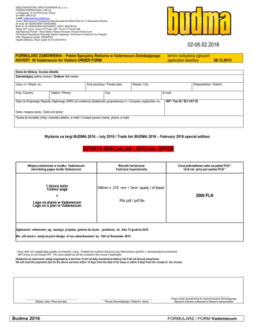 MIĘDZYNARODOWE TARGI POZNAŃSKIE Sp. z o. o. POZNAŃ INTERNATIONAL FAIR Ltd. ul. Głogowska 14, 60-734 Poznań, Poland tel +48/61 869 25 24 e-mail: [email protected] Konto / Bank account: Powszechna Kasa Oszczędności Bank Polski S.A. w Warszawie o/Poznań Nr konta: 38 102040270000110204242962 IBAN: PL 46 102040270000140210929075, SWIFT: BPKOPLPW Płatnik VAT czynny / Active VAT Payer, NIP / Tax ID: 777-00-00-488 Sąd Rejonowy Poznań – Nowe Miasto i Wilda w Poznaniu / Poznan District Court VIII Wydział Gospodarczy Krajowego Rejestru Sądowego / 8th Division of National Court Register KRS / Registered number: 0000202703 Kapitał zakładowy / Share capital: 42 310 200,00 PLN 02-05.02.2016 termin nadsyłania zgłoszeń application deadline 08.12.2015 FORMULARZ ZAMÓWIENIA – Pakiet Specjalny Reklama w Vademecum Zwiedzającego ADVERT IN Vademecum for Visitors ORDER FORM Dane do faktury: Invoice details: Zamawiający (pełna nazwa) / Orderer (full name): Ulica, nr / Street, no.: Kraj / Country: Kod pocztowy / Postal code: Telefon / Phone: Miasto / City: Fax: Województwo / District: E-mail: Wpis do Krajowego Rejestru Sądowego (KRS) lub ewidencji działalności gospodarczej nr / Company registration no: NIP / Tax ID / EU VAT ID: Data i miejsce wpisu / Date and place: Osoba do kontaktu (imię i nazwisko,telefon, e-mail) / Contact person (name, phone, e-mail): Wydanie na targi BUDMA 2016 – luty 2016 / Trade fair BUDMA 2016 – February 2016 special edition: OFERTA SPECJALNA / SPECIAL OFFER Miejsca reklamowe w środku Vademecum advertising pages inside Vademecum Warunki techniczne Technical requirements 1 strona kolor 1colour page 148mm x 210 mm + 3mm spady / of bleed Cena jednostkowa netto za pakiet PLN * Unit net price per packet PLN * 2000 PLN + Logo na planie w Vademecum Logo on a plan in Vademecum Plik pdf / pdf file Ogłoszenie reklamowe wg naszego projektu, gotowe do druku prześlemy do dnia 15 grudnia 2015 We will send a ready-to-print design of our advertisement by 15th of December 2015 * Ceny netto nie uwzględniają podatku od towarów i usług Podatek ten zostanie doliczony przy fakturowaniu zgodnie z obowiązującymi przepisami. NET prices do not include VAT. The value added tax will be included in the invoice if applicable. Należność za wykonanie usługi uregulujemy w terminie 14 dni od daty wystawienia faktury lub 5 dni od dnia jej otrzymania. We will meet the payments due for the above services within 14 days from the date of its issue or within 5 days from the receipt of the invoice. _________________________________________ Miejsce i data / Place and date Budma 2016 _________________________________________ Pieczęć Zamawiającego / Orderer’s stamp _________________________________________ Podpis osoby upoważnionej do reprezentowania Zamawiającego Signature of person authorized to Orderer’s representation FORMULARZ / FORM Vademecum