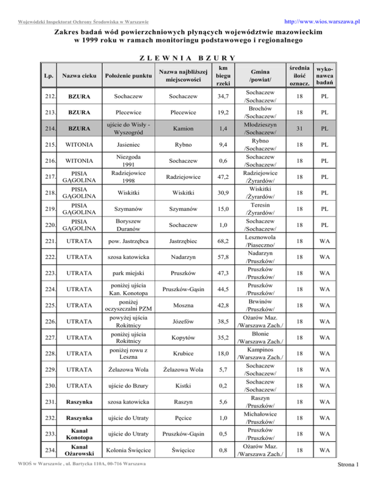 http://www.wios.warszawa.pl Wojewódzki Inspektorat Ochrony Środowiska w Warszawie Zakres badań wód powierzchniowych płynących województwie mazowieckim w 1999 roku w ramach monitoringu podstawowego i regionalnego ZLEWNIA BZURY Nazwa cieku Położenie punktu Nazwa najbliższej miejscowości km biegu rzeki 212. BZURA Sochaczew Sochaczew 34,7 213. BZURA Plecewice Plecewice 19,2 214. BZURA ujście do Wisły Wyszogród Kamion 1,4 215. WITONIA Jasieniec Rybno 9,4 216. WITONIA Sochaczew 0,6 217. PISIA GĄGOLINA Radziejowice 47,2 218. PISIA GĄGOLINA Wiskitki Wiskitki 30,9 219. PISIA GĄGOLINA Szymanów Szymanów 15,0 220. PISIA GĄGOLINA Boryszew Duranów Sochaczew 1,0 221. UTRATA pow. Jastrzębca Jastrzębiec 68,2 222. UTRATA szosa katowicka Nadarzyn 57,8 223. UTRATA park miejski Pruszków 47,3 224. UTRATA poniżej ujścia Kan. Konotopa Pruszków-Gąsin 44,5 225. UTRATA poniżej oczyszczalni PZM Moszna 42,8 226. UTRATA powyżej ujścia Rokitnicy Józefów 38,5 227. UTRATA poniżej ujścia Rokitnicy Kopytów 35,2 228. UTRATA poniżej rowu z Leszna Krubice 18,0 229. UTRATA Żelazowa Wola Żelazowa Wola 5,7 230. UTRATA ujście do Bzury Kistki 0,2 231. Raszynka szosa katowicka Raszyn 5,6 232. Raszynka ujście do Utraty Pęcice 1,0 233. Kanał Konotopa ujście do Utraty Pruszków-Gąsin 0,5 234. Kanał Ożarowski Kolonia Święcice Święcice 0,8 Lp. Niezgoda 1991 Radziejowice 1998 WIOŚ w Warszawie , ul. Bartycka 110A, 00-716 Warszawa Gmina /powiat/ Sochaczew /Sochaczew/ Brochów /Sochaczew/ Młodzieszyn /Sochaczew/ Rybno /Sochaczew/ Sochaczew /Sochaczew/ Radziejowice /Żyrardów/ Wiskitki /Żyrardów/ Teresin /Żyrardów/ Sochaczew /Sochaczew/ Lesznowola /Piaseczno/ Nadarzyn /Pruszków/ Pruszków /Pruszków/ Pruszków /Pruszków/ Brwinów /Pruszków/ Ożarów Maz. /Warszawa Zach./ Błonie /Warszawa Zach./ Kampinos /Warszawa Zach./ Sochaczew /Sochaczew/ Sochaczew /Sochaczew/ Raszyn /Pruszków/ Michałowice /Pruszków/ Pruszków /Pruszków/ Ożarów Maz. /Warszawa Zach./ średnia ilość oznacz. wykonawca badań 18 PL 18 PL 31 PL 18 PL 18 PL 18 PL 18 PL 18 PL 18 PL 18 WA 18 WA 18 WA 18 WA 18 WA 18 WA 18 WA 18 WA 18 WA 18 WA 18 WA 18 WA 18 WA 18 WA Strona 1 http://www.wios.warszawa.pl Wojewódzki Inspektorat Ochrony Środowiska w Warszawie Nazwa cieku Położenie punktu Nazwa najbliższej miejscowości km biegu rzeki 235. Rokitnica powyżej ujścia Mrowny Natolin 11,1 236. Rokitnica ujście do Utraty Rokitno 2,6 237. Mrowna powyżej Grodziska Grodzisk Mazowiecki 7,6 238. Mrowna ujście do Rokitnicy Tłuste 0,5 239. Zimna Woda powyżej Nadarzyna Nadarzyn 16,3 240. Zimna Woda ujście do Rokitnicy Biskupice 2,3 Pass 0,9 Nowa Górna 1,1 Aleksandrów Lp. 241. Stara Rokitnica 242. Korytnica 243. KANAŁ ŁASICA 244. KANAŁ ŁASICA 245. KANAŁ ŁASICA 246. Kanał Zaborowski ujście do Utraty most na drodze Wola ŁuszczewskaNowa Górna pow. Kan. Zaborowskiego, most na drodze Leszno-Kazuń most na drodze Famułki Brochowskie Miszory ujście do Bzurymost na drodze Chodaków-Śladów most na drodze Leszno-Kazuń most na drodze Borzęcin StaryTruskaw most na drodze 248. Lipkowska Woda stare BabiceIzabelin most na drodze 249. Kanał Ł - 9 Józefów-Wilków most na drodze Kanał 250. Wólka Smolna Olszowiecki Lasocin 247. 251. Struga KANAŁ KROMNOWSKI ujście do Bzury średnia ilość oznacz. wykonawca badań 18 WA 18 WA 18 WA 18 WA 18 WA 18 WA 18 WA Błonie /Warszawa Zach./ 18 WA 27,2 Czosnów /Nowy Dwór/ 18 PL Władysławów 8,7 Brochów /Sochaczew/ 18 PL Tułowice 2,4 Brochów /Sochaczew/ 18 PL Roztoka 3,2 Leszno /Warszawa Zach./ 18 PL Truskaw Mały 3,1 Stare Babice /Warszawa Zach./ 18 PL Klaudyn 3,8 Stare Babice /Warszawa Zach./ 18 PL Górki 3,0 Leoncin /Nowy Dwór M/ 18 PL Lasocin 4,4 Brochów /Sochaczew/ 18 PL Śladów 2,3 Brochów /Sochaczew/ 18 PL Gmina /powiat/ Grodzisk Maz /Grodzisk/ Błonie /Warszawa Zach./ Grodzisk Maz /Grodzisk/ Grodzisk Maz /Grodzisk/ Nadarzyn /Pruszków/ Brwinów /Pruszków/ Błonie /Warszawa Zach./ oznaczenia: punkty badane w ramach monitoringu podstawowego WA - WIOŚ w Warszawie OS - Oddział WIOŚ w Ostrołęce CI - Oddział WIOŚ w Ciechanowie PL - Oddział WIOŚ w Płocku MM - Oddział WIOŚ w Mińsku Mazowieckim RA - Oddział WIOŚ w Radomiu WIOŚ w Warszawie , ul. Bartycka 110A, 00-716 Warszawa Strona 2
