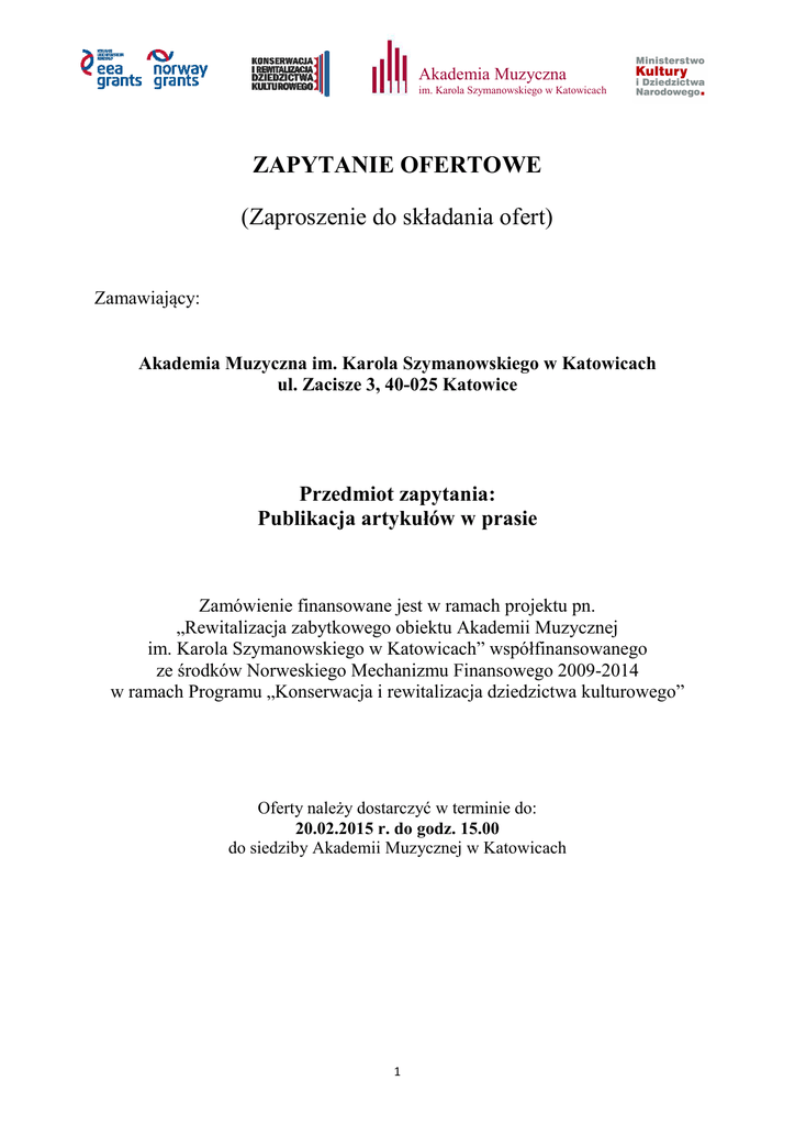 Akademia Muzyczna im. Karola Szymanowskiego w Katowicach ZAPYTANIE OFERTOWE (Zaproszenie do składania ofert) Zamawiający: Akademia Muzyczna im. Karola Szymanowskiego w Katowicach ul. Zacisze 3, 40-025 Katowice Przedmiot zapytania: Publikacja artykułów w prasie Zamówienie finansowane jest w ramach projektu pn. „Rewitalizacja zabytkowego obiektu Akademii Muzycznej im. Karola Szymanowskiego w Katowicach” współfinansowanego ze środków Norweskiego Mechanizmu Finansowego 2009-2014 w ramach Programu „Konserwacja i rewitalizacja dziedzictwa kulturowego” Oferty należy dostarczyć w terminie do: 20.02.2015 r. do godz. 15.00 do siedziby Akademii Muzycznej w Katowicach 1 1. Nazwa oraz adres Zamawiającego: Akademia Muzyczna im. Karola Szymanowskiego w Katowicach ul. Zacisze 3, 40-025 Katowice, tel.(32) 779 21 19/ fax. (32) 779 21 24, www.am.katowice.pl 2. Postanowienia ogólne: 2.1. Niniejsze postępowanie o udzielenie zamówienia prowadzone jest w trybie zapytania ofertowego bez stosowania ustawy z dnia 29 stycznia 2004 r. - Prawo zamówień publicznych. Postępowanie prowadzone jest zgodnie z Wytycznymi Ministra Infrastruktury i Rozwoju Regionalnego w zakresie udzielania zamówień w ramach Mechanizmu Finansowego EOG 2009-2014 oraz Norweskiego Mechanizmu Finansowego 2009-2014, do których nie ma zastosowania ustawa z dnia 29 stycznia 2004 r. – Prawo zamówień publicznych oraz na podstawie Regulaminu udzielania zamówień publicznych o wartości szacunkowej nieprzekraczającej równowartości kwoty 30 000 Euro w Akademii Muzycznej im. Karola Szymanowskiego w Katowicach (Zarządzanie nr 2/4/2014 z dn. 17.04.2014 ) 2.2. Zamawiający zastrzega sobie prawo do zmiany treści niniejszego zapytania do upływu terminu składania ofert. Jeżeli zmiany będą mogły mieć wpływ na treść składanych w postępowaniu ofert, Zamawiający przedłuży termin składania ofert. Dokonane zmiany przekazuje się niezwłocznie wszystkim Wykonawcom, do których zostało wystosowane Zapytanie ofertowe i są one wiążące. 2.3. Zamawiający zastrzega sobie prawo do unieważnienia niniejszego postępowania bez podania uzasadnienia, a także do pozostawienia postępowania bez wyboru oferty. 3. Opis przedmiotu zamówienia: Przedmiotem zamówienia jest przygotowanie i publikacja 6 artykułów (ogłoszeń prasowych) o charakterze informacyjno-promocyjnym dotyczącym realizacji projektu „Rewitalizacja zabytkowego obiektu Akademii Muzycznej im. Karola Szymanowskiego w Katowicach” w trzech różnych gazetach, skierowanych do mieszkańców województwa śląskiego. 3.1 Szczegółowe wymagania w stosunku do zamówienia: − Zamówienie dotyczy publikacji 6 ogłoszeń w 3 różnych gazetach o charakterze opiniotwórczym, ukazujących się w formie drukowanej i składa się z 3 części według poniższej specyfikacji: Nr części 1. Prasa Gazeta nr 1 bezpłatna Ilość ogłoszeń, terminy 2 ogłoszenia, w tym: • 1 ogłoszenie w marcu 2015 • 1 ogłoszenie w kwietniu 2015 Zasięg / nakład • • zasięg obejmujący minimum: Katowice, Sosnowiec, Gliwice, Zabrze minimum 30 tys. egzemplarzy na terenie województwa śląskiego 2 Dodatkowe kryteria • ogłoszenia ukażą się w gazecie bezpłatnej • gazeta nr 1 musi być inna niż gazety nr 2 i nr 3 2. Gazeta nr 2 dodatek poświęcony kulturze i/lub poświecony funduszom UE, EOG, itp. 3. Gazeta nr 3 płatna 2 ogłoszenia, w tym: • zasięg obejmujący całe województwo śląskie • 1 ogłoszenie w marcu 2015 • minimum 30 tys. egzemplarzy na terenie województwa śląskiego • 1 ogłoszenie w kwietniu 2015 2 ogłoszenia, w tym: • zasięg obejmujący całe województwo śląskie • 1 ogłoszenie w marcu 2015 • minimum 30 tys. egzemplarzy na terenie województwa śląskiego • 1 ogłoszenie w kwietniu 2015 • gazeta posiadająca dodatek poświęcony kulturze lub/i funduszom UE, EOG itp. • ogłoszenia ukażą się w w/w dodatku • gazeta nr 2 musi być inna niż gazety nr 1 i nr 3 • gazeta płatna • gazeta nr 3 musi być inna niż gazety nr 1 i nr 2. Spełnienie powyższych warunków będzie oceniane na podstawie informacji zawartych w Załączniku nr 2: „Oświadczenia Wykonawcy o zasięgu, nakładzie oraz spełnieniu kryteriów dodatkowych”, który Wykonawca zobowiązany jest złożyć wraz z ofertą. Ocena będzie przeprowadzona na podstawie kryterium: spełnia / nie spełnia. Nie spełnienie powyższych warunków spowoduje wykluczenie Wykonawcy z postępowania. Wymagania dotyczące każdego ogłoszenia: − − − − − − ogłoszenia w pełnym kolorze ogłoszenia na stronach redakcyjnych wymiary ogłoszenia (nie mniejsze niż pół strony i o powierzchni minimum 390 cm2 ) ogłoszenia muszą zawierać logotypy oraz informacje o współfinansowaniu obowiązujące w ramach funduszy norweskich i funduszy EOG treść oraz zdjęcia do ogłoszenia zostaną dostarczone przez Zamawiającego projekt graficzny ogłoszenia przygotuje Wykonawca W ramach zamówienia Wykonawca dostarczy nieodpłatnie po 3 egzemplarze każdej gazety, w której ukazało się ogłoszenie. 3.2 Dopuszcza się możliwość przesunięcia terminu realizacji zadań wymienionych w przedmiocie Zapytania Ofertowego, jednak wyłącznie za zgodą Zamawiającego. 3.3 Zapłata za realizację przedmiotu zamówienia nastąpi po realizacji zamówienia w terminie 30 dni od daty wpływu do Zamawiającego prawidłowej faktury VAT. 3.4 Wynagrodzenie finansowane będzie w ramach projektu „Rewitalizacja zabytkowego obiektu Akademii Muzycznej im. Karola Szymanowskiego w Katowicach” współfinansowanego w ramach Programu „Konserwacja i rewitalizacja dziedzictwa kulturowego” w ramach Mechanizmu Finansowego Europejskiego Obszaru Gospodarczego 2009-2014 i Norweskiego Mechanizmu Finansowego 2009-2014 oraz środków krajowych. 3.5 Zamawiający dopuszcza możliwość składania ofert częściowych. 3.6 Na realizację całego zamówienia Zamawiający planuje przeznaczenie kwoty 14 0