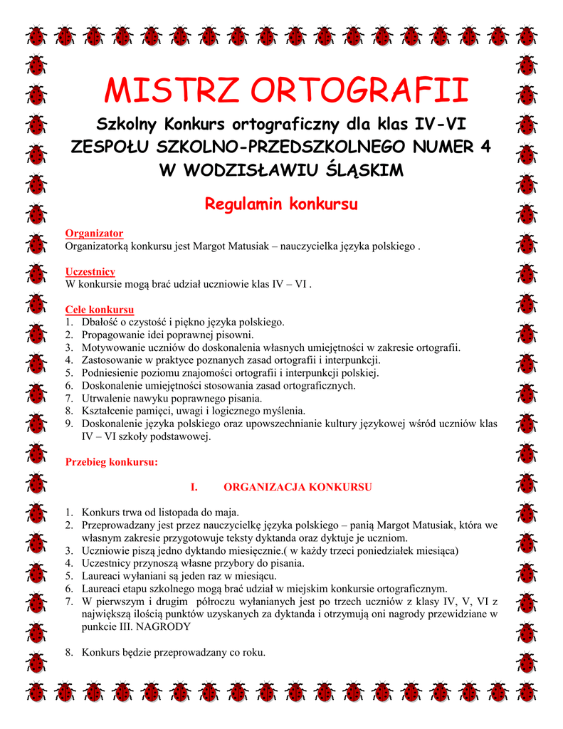 MISTRZ ORTOGRAFII Szkolny Konkurs ortograficzny dla klas IV-VI ZESPOŁU SZKOLNO-PRZEDSZKOLNEGO NUMER 4 W WODZISŁAWIU ŚLĄSKIM Regulamin konkursu Organizator Organizatorką konkursu jest Margot Matusiak – nauczycielka języka polskiego . Uczestnicy W konkursie mogą brać udział uczniowie klas IV – VI . Cele konkursu 1. Dbałość o czystość i piękno języka polskiego. 2. Propagowanie idei poprawnej pisowni. 3. Motywowanie uczniów do doskonalenia własnych umiejętności w zakresie ortografii. 4. Zastosowanie w praktyce poznanych zasad ortografii i interpunkcji. 5. Podniesienie poziomu znajomości ortografii i interpunkcji polskiej. 6. Doskonalenie umiejętności stosowania zasad ortograficznych. 7. Utrwalenie nawyku poprawnego pisania. 8. Kształcenie pamięci, uwagi i logicznego myślenia. 9. Doskonalenie języka polskiego oraz upowszechnianie kultury językowej wśród uczniów klas IV – VI szkoły podstawowej. Przebieg konkursu: I. ORGANIZACJA KONKURSU 1. Konkurs trwa od listopada do maja. 2. Przeprowadzany jest przez nauczycielkę języka polskiego – panią Margot Matusiak, która we własnym zakresie przygotowuje teksty dyktanda oraz dyktuje je uczniom. 3. Uczniowie piszą jedno dyktando miesięcznie.( w każdy trzeci poniedziałek miesiąca) 4. Uczestnicy przynoszą własne przybory do pisania. 5. Laureaci wyłaniani są jeden raz w miesiącu. 6. Laureaci etapu szkolnego mogą brać udział w miejskim konkursie ortograficznym. 7. W pierwszym i drugim półroczu wyłanianych jest po trzech uczniów z klasy IV, V, VI z największą ilością punktów uzyskanych za dyktanda i otrzymują oni nagrody przewidziane w punkcie III. NAGRODY 8. Konkurs będzie przeprowadzany co roku. 1 II. ZASADY OCENIANIA 1. Prace konkursowe oceniać będzie komisja powołana przez organizatora konkursu. 2. Komisja konkursowa ocenia poprawność ortograficzną i interpunkcyjną zgodnie z następującym kryterium: za błędy popełnione podczas pisania ze słuchu punkty są odejmowane od określonej maksymalnej liczby punktów według zasady: - błąd I stopnia – 1 pkt, - błąd II stopnia – ½ pkt. Dwa błędy II stopnia mają wartość jednego błędu I stopnia. Za błędy I stopnia uważa się pisownię rz – ż, ó – u, h – ch, pisownię „nie” z czasownikami, ” z przymiotnikami, rzeczownikami i przysłówkami, pisownię wyrazów wielką literą. Błędy II stopnia to inne błędy np.: ą, ę z utratą dźwięczności, zmiękczenia, opuszczone litery lub wyrazy, zniekształcone końcówki wyrazów; błędy interpunkcyjne itp. Dwa błędy interpunkcyjne mają wartość jednego błędu II stopnia. Nie uznaje się błędów, które uczeń poprawił w następujący sposób: - błędna litera lub wyraz zostały przekreślone, - poprawna litera lub wyraz zostały zapisane nad lub obok przekreślenia. Wszelkie „przeróbki” liter uznaje się za błędy. III. 1. 2. 3. 4. NAGRODY Zdobywca I miejsca otrzymuje: tytuł MISTRZA ORTOGRAFII Szkoły Podstawowej numer 4 (dyplom), oraz nagrodę rzeczową. Zdobywca II miejsca otrzymuje: tytuł VICE MISTRZA ORTOGRAFII Szkoły Podstawowej numer 4 (dyplom) oraz nagrodę pocieszenia. Zdobywca III miejsca otrzymuje: - tytuł II VICE MISTRZA ORTOGRAFII Szkoły Podstawowej numer 4 (dyplom) oraz nagrodę pocieszenia. Pozostali uczestnicy konkursu otrzymują dyplomy uczestnictwa w finale konkursu MISTRZA ORTOGRAFII Szkoły Podstawowej numer 4 w Wodzisławiu Śląskim. ZAPRASZAM !!! Margot Matusiak (nauczycielka j. polskiego) 2