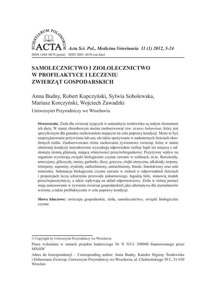 Acta Sci. Pol., Medicina Veterinaria 11 (1) 2012, 5-24 ISSN 1644–0676 (print) ISSN 2083–8670 (on-line) SAMOLECZNICTWO I ZIOŁOLECZNICTWO W PROFILAKTYCE I LECZENIU ZWIERZĄT GOSPODARSKICH1 Anna Budny, Robert Kupczyński, Sylwia Sobolewska, Mariusz Korczyński, Wojciech Zawadzki Uniwersytet Przyrodniczy we Wrocławiu Streszczenie. Zioła dla zwierząt żyjących w naturalnym środowisku są stałym elementem ich diety. W stanie chorobowym można zaobserwować tzw. sicness behawiour, który jest specyficznym dla gatunku zachowaniem mającym na celu poprawę kondycji. Może to być nieprzyjmowanie pożywienia lub sen, ale także spożywanie w nadmiernych ilościach określonych roślin. Zaobserwowano różne zachowania żywieniowe zwierząt, które w stanie obniżonej kondycji instynktownie wyszukują odpowiednie rośliny bądź też miejsca z odsłoniętą ziemią gliniastą, mającą właściwości przeciwbiegunkowe. Pozytywny wpływ na organizm wywierają związki biologicznie czynne zawarte w roślinach, m.in. flawonoidy, antocyjany, glikozydy, taniny, garbniki, śluzy, gorycze, olejki eteryczne, alkaloidy, terpeny, triterpeny, saponiny, irydoidy, naftochiniony, antrachiniony, fenole, fenolokwasy oraz sole mineralne. Substancje biologicznie czynne zawarte w ziołach w odpowiednich ilościach i proporcjach leczą schorzenia przewodu pokarmowego, łagodzą bóle, stanowią środek przeciwpasożytniczy, a także wpływają na układ odpornościowy. Zioła w różnej postaci mają zastosowanie w żywieniu zwierząt gospodarskich jako alternatywa dla stymulatorów wzrostu, a także profilaktycznie w celu poprawy kondycji. Słowa kluczowe: zwierzęta gospodarskie, zioła, samolecznictwo, związki biologicznie czynne © Copyright by Uniwersytet Przyrodniczy we Wrocławiu Praca wykonana w ramach projektu badawczego Nr N N311 548040 finansowanego przez MNiSW Adres do korespondencji – Corresponding author: Anna Budny, Katedra Higieny Środowiska i Dobrostanu Zwierząt, Uniwersytet Przyrodniczy we Wrocławiu, ul. Chełmońskiego 38 C, 51-630 Wrocław 6 A. Budny i in. WSTĘP Zioła i preparaty na bazie roślin zielnych są przedmiotem szeregu badań ze względu na szerokie spektrum działania na organizm zwierząt. Spośród dodatków paszowych obecnie stosowanych w żywieniu zwierząt alternatywą dla antybiotyków są probiotyki, prebiotyki, kwasy organiczne oraz zioła. Popularność fitoterapii wzrosła ze względu na wprowadzony od 2006 r. zakaz stosowania antybiotykowych stymulatorów wzrostu w żywieniu zwierząt gospodarskich. W gospodarstwach ekologicznych zabronione jest stosowanie leków weterynaryjnych, wyjątek stanowi konieczność ratowania życia lub zmniejszenia cierpienia (Dz.U. Nr 38 z 2001 r., poz. 452, z późn. zm.). Dopuszcza się jedynie środki lecznicze pochodzenia ziołowego, preparaty homeopatyczne oraz stosowanie kwasu mrówkowego, kwasu mlekowego i kwasu octowego, a także olejku mentolowego, tymolowego, eukaliptusowego lub kamforowego w przebiegu zakażenia pszczół Varroa jacobsoni. W przypadku stosowania chemioterapeutyków w gospodarstwach ekologicznych należy zachować dwukrotnie dłuższy okres karencji dla pozyskiwanych surowców zwierzęcych, a zwierzęta muszą być odpowiednio oznakowane. Współczesne badania na zwierzętach gospodarskich z wykorzystaniem ziół prowadzone są w kierunku zwiększenia produkcji i wydajności poprzez polepszenie ogólnego stanu zdrowia oraz odporności. Mieszanki ziołowe stosowane u trzody chlewnej zwiększają np. liczebność miotów oraz przyrosty prosiąt [Maciołek 1993]. Z kolei badania nad wpływem ziół na cielęta wykazały pozytywny wpływ na poziom wskaźników biochemicznych krwi oraz immunoglobulin [Krukowski i in. 1999]. Przeżuwacze karmione mieszankami ziołowymi wykazywały większą wydajność mleczną [Kryszak 2007]. Poprawę kondycji i działanie uspokajające stwierdzono u koni. Wpływ na stan psychiczny koni ułatwia zabiegi weterynaryjne oraz transport [Kalisiak 2011]. Udowodniono także wpływ ziół na jakość tkanki mięśniowej i tłuszczu u brojlerów [Szkucik i in. 2011]. W żywieniu królików stosuje się zioła wpływające na poziom cholesterolu LDL i HDL [Jafari Dinani i in. 2010]. Samolecznictwo i behawior żywieniowy zwierząt wolno żyjących Zwierzęta wolno żyjące wykazują podczas choroby różne zachowania tzw. sicness behawiour. Obserwowano wówczas pobieranie roślin o niskich walorach smakowych i wartościach odżywczych, ale bogatych w substancje aktywne biologicznie [Kaleta 2005]. Jest to zachowanie instynktowne, dzięki któremu bez znajomości ostatecznego celu zwierzęta wiedzą, jakich ziół szukać oraz w jakich ilościach je przyjmować. Zjawisko te określono terminem „samolecznictwo” (self-medication) [Huffmann i Wrangham 1996]. Samolecznictwo jest nową i dość kontrowersyjną dziedziną badań. Zachowanie się zwierząt jest w tym aspekcie interpretowane hipotetycznie, a jego mechanizm nie jest do końca poznany. Dzięki analizie interdyscyplinarnej, łączącej badania behawioralne, parazytologiczne i biochemiczne, można lepiej zrozumieć właściwości lecznicze roślin i wykorzystać je w praktyce. Zwierzęta instynktownie potrafią wybierać rośliny zielne pożyteczne, omijając przy tym rośliny toksyczne, które odstraszają wonią i gorzkim smakiem spowodowanym zawartością glikozydów, alkaloidów czy też kwasów. Nie stwierdzono jednak, czy kierują się one zmysłami węchu i smaku, czy też w przypadku choroby wyszukują odpowiednie „lekarstwo” [Kossak 1995b]. Rośliny toksyczne podczas żerowania są zazwyczaj Acta Sci. Pol. Samolecznictwo i ziołolecznictwo w profilaktyce i leczeniu... 7 omijane i tylko okresowo wybierane, gdyż w odpowiednich ilościach składniki ich mają właściwości lecznicze (np. alkaloidy). Zwierzęta zdrowe reagują inaczej na te związki niż osobniki osłabione chorobą. Jest to dowód na to, że podczas