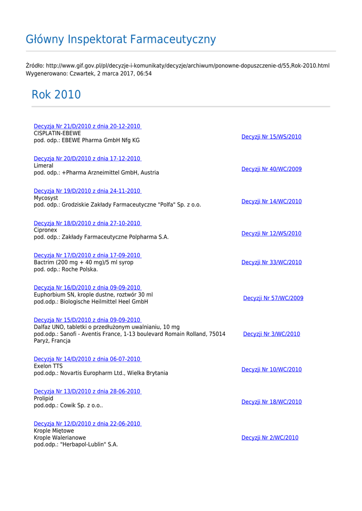 Główny Inspektorat Farmaceutyczny Źródło: http://www.gif.gov.pl/pl/decyzje-i-komunikaty/decyzje/archiwum/ponowne-dopuszczenie-d/55,Rok-2010.html Wygenerowano: Czwartek, 2 marca 2017, 06:54 Rok 2010 Decyzja Nr 21/D/2010 z dnia 20-12-2010 CISPLATIN-EBEWE pod. odp.: EBEWE Pharma GmbH Nfg KG Decyzja Nr 20/D/2010 z dnia 17-12-2010 Limeral pod. odp.: +Pharma Arzneimittel GmbH, Austria Decyzja Nr 19/D/2010 z dnia 24-11-2010 Mycosyst pod. odp.: Grodziskie Zakłady Farmaceutyczne "Polfa" Sp. z o.o. Decyzja Nr 18/D/2010 z dnia 27-10-2010 Cipronex pod. odp.: Zakłady Farmaceutyczne Polpharma S.A. Decyzja Nr 17/D/2010 z dnia 17-09-2010 Bactrim (200 mg + 40 mg)/5 ml syrop pod. odp.: Roche Polska. Decyzja Nr 16/D/2010 z dnia 09-09-2010 Euphorbium SN, krople dustne, roztwór 30 ml pod.odp.: Biologische Heilmittel Heel GmbH Decyzja Nr 15/D/2010 z dnia 09-09-2010 Dalfaz UNO, tabletki o przedłużonym uwalnianiu, 10 mg pod.odp.: Sanofi - Aventis France, 1-13 boulevard Romain Rolland, 75014 Paryż, Francja Decyzja Nr 14/D/2010 z dnia 06-07-2010 Exelon TTS pod.odp.: Novartis Europharm Ltd., Wielka Brytania Decyzja Nr 13/D/2010 z dnia 28-06-2010 Prolipid pod.odp.: Cowik Sp. z o.o.. Decyzja Nr 12/D/2010 z dnia 22-06-2010 Krople Miętowe Krople Walerianowe pod.odp.: "Herbapol-Lublin" S.A. Decyzji Nr 15/WS/2010 Decyzji Nr 40/WC/2009 Decyzji Nr 14/WC/2010 Decyzji Nr 12/WS/2010 Decyzji Nr 33/WC/2010 Decyzji Nr 57/WC/2009 Decyzji Nr 3/WC/2010 Decyzji Nr 10/WC/2010 Decyzji Nr 18/WC/2010 Decyzji Nr 2/WC/2010 Decyzja Nr 11/D/2010 z dnia 31-05-2010 Bebilon Sojowy 2 pod.odp.: Nutricia Cuijk B.V., Holandia Decyzja Nr 10/D/2010 z dnia 06-05-2010 Actifed pod.odp.: McNeil products Limited, C/O Johnson & Johnson Limited, Wielka Brytania Decyzja Nr 9/D/2010 z dnia 24-03-2010 MYCOSOLON pod.odp.: Gedeon Richter Ltd.,Węgry Decyzja Nr 8/D/2010 z dnia 23-03-2010 SYNFLORIX ROTARIX pod.odp.: GlaxoSmithKline Biologicals s.a., Belgia Decyzja Nr 7/D/2010 z dnia 12-03-2010 Szczepionka przeciwgruźlicza BCG 10 pod.odp.: Biomed Wytwórnia Surowic i Szczepionek Sp. z o.o., Lublin Decyzja Nr 6/D/2010 z dnia 10-03-2010 ItraGen pod.odp.: Generics [UK] Ltd, Wielka Brytania Decyzja Nr 5/D/2010 z dnia 03-03-2010 Alendronatum FARMAcom pod.odp.: FARMACOM Sp. z o.o. Decyzja Nr 4/D/2010 z dnia 24-02-2010 CONTRACID 20 mg CONTRACID 40 mg pod.odp.: Farma-Projekt Sp. z o.o. Decyzja Nr 3/D/2010 z dnia 23-02-2010 CLEXANE pod.odp.: Sanofi-Aventis France, 1-13 boulevard Romain Rolland, 75 014 Paryż, Francja Decyzja Nr 2/D/2010 z dnia 19-02-2010 CITALOPRAM TEVA pod.odp.: Teva Pharmaceuticals Polska Sp. z o.o. Decyzja Nr 1/D/2010 z dnia 13-01-2010 TOPIGEN pod.odp.: Biogened S.A. Decyzji Nr 52/WC/2009 Decyzji Nr 4/WS/2010 Decyzji Nr 26/WC/2009 Decyzji Nr 1/WS/2010 Decyzji Nr 7/WS/2009 Decyzji Nr 5/WS/2010 Decyzji Nr 39/WC/2009 Decyzji Nr 41/WC/2009 Postanowienie z dnia 25.02.2010 Decyzji Nr 3/WS/2010 Decyzji Nr 2/WS/2010 Decyzji Nr 43/WC/2009